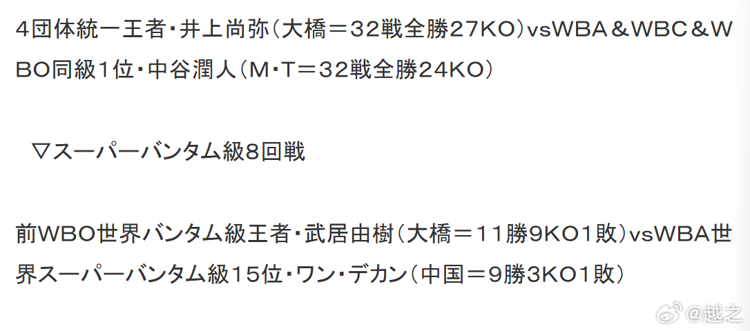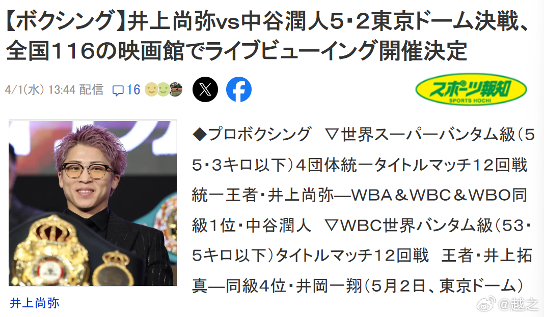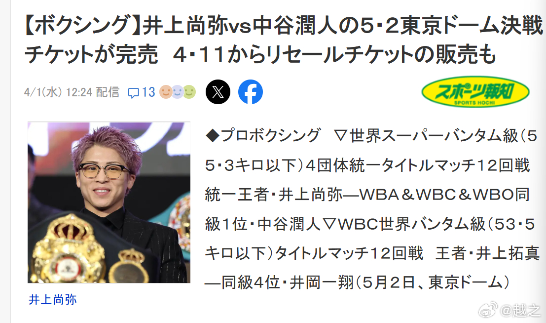 井上尚弥和中谷润人的4大组织122磅职业拳击四大组织统一战已经全部卖光了,5月22日东京巨蛋,43000人。中国拳手,前WBC世界拳王熊朝忠妻子罗秀的表弟——目前WBA世界第15的王德康也将在这里亮相打垫场赛。比赛是8个回合,对手为前WBO世界拳王,前K-1冠军武居由树。这比赛去之前,也是纠结了很久,毕竟去客场赢面就比较小,对方给的出场费很一般,不是很高。不过最后熊朝忠拍板,还是决定去。毕竟这样的大场面,去见识一下有好处,此外需要有这样的挑战精神。王德康2月底比赛后眼睛有点受伤,不过已经积极备战2周了。职业拳击就是如此。这比赛还会在日本116家电影院直播。这肯定是日本职业拳击历史留名的一战。