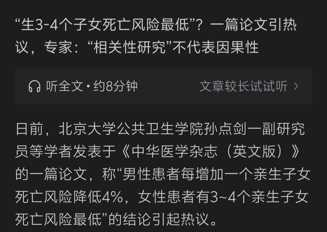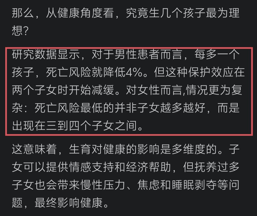 北京大学副研究员孙点剑一(简称孙点剑),发现生过3到4个孩子的女性,死亡风险会降到最低。怎么有点不靠谱的感觉? 《基于50万中国男女的前瞻性队列研究:子嗣数量与全表型疾病及死亡风险的关联谱》这一长串的标题及里面的内容,是北京大学副研究员孙点剑一等学者完成的。 据称,为了完成这个研究,他们用时长达12年,并且是对超过51万我国成年人的追踪调查。 研究的问题是——“生育子女的数量,究竟如何影响父母的健康与寿命?” 去搜了下全文,发现整篇文章似乎是有理有据,各种百分比;各和精确到小数点后的数据;各种专业词汇,给人一种看不懂但是却感觉很专业的样子。 有兴趣的朋友,可以去搜一下看看。这儿咱就不啰嗦他的原文了,只说一个大家都比较感兴趣的结论。 结论称:男性如果有2到3个孩子,似乎更利于健康;女性如果有3到4个孩子,死亡风险会降到最低。 当然也不是越多越好!抚养过多,也会带来各种压力,从而影响到健康。 这个结论一出,让很多人愕然失笑,包括本人也感觉有点不靠谱。 作为80后第一批人,怎么记得以前好像说的是“晚婚晚育”,生一个孩子对母亲的身体才好,生多了对母亲的身体并不好,而且还有害。 为此,专门在网上找了一下当年的报纸照片,发现那段记忆并没有记错,当时的确有过报道。 当然,那个时候报纸上的报道,可能是一种错误的理论,毕竟那时候的科研比现在差得太远。 现在,科研能力进步了,专家、学者也多了,出现新的结论也正常吗。 不过,个人还是觉得有点不太靠谱!恳请孙点剑一再研究研究。