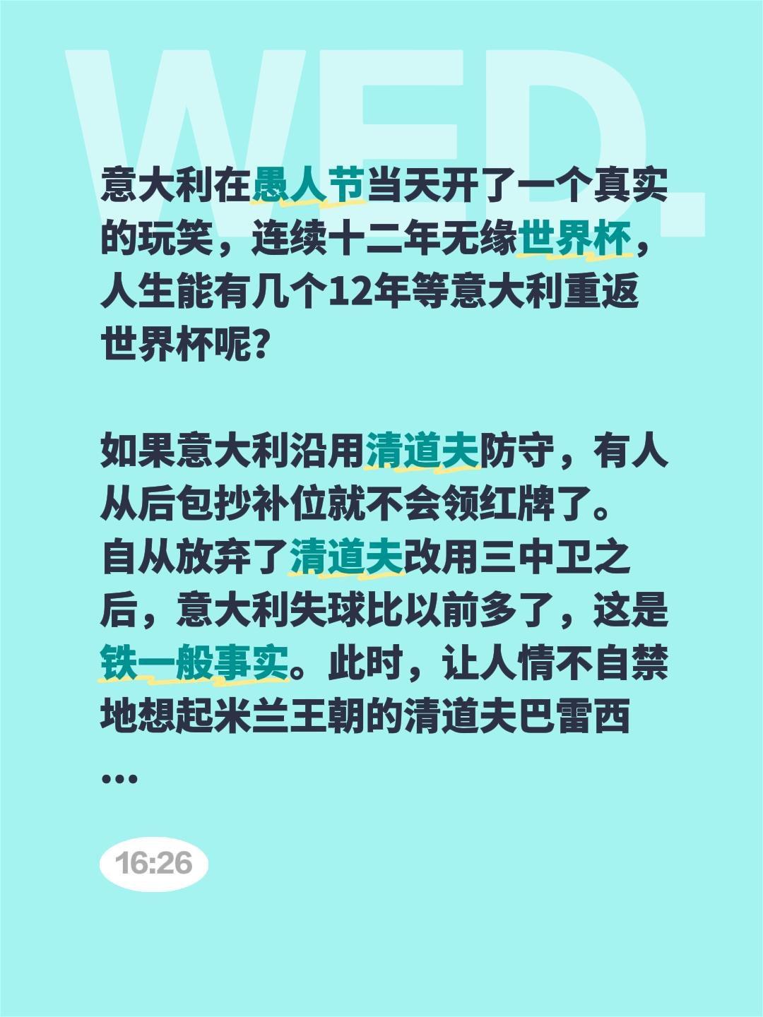 在愚人节当天开了一个真实的玩笑,连续十二年无缘世界杯,人生能有几个12年等意大利重返世界杯呢? 如果意大利国家队 沿用清道夫防守,有人从后包抄补位就不会领红牌了。 自从放弃了清道夫改用三中卫之后,意大利失球比以前多了,这是铁一般事实。此时,让人情不自禁地想起米兰王朝的清道夫巴雷西。@DOU+小助手 @抖音小助手 虽然如此,但相信今后任何一位领队都不会考虑重置清道夫位置,即使有合适的球员。