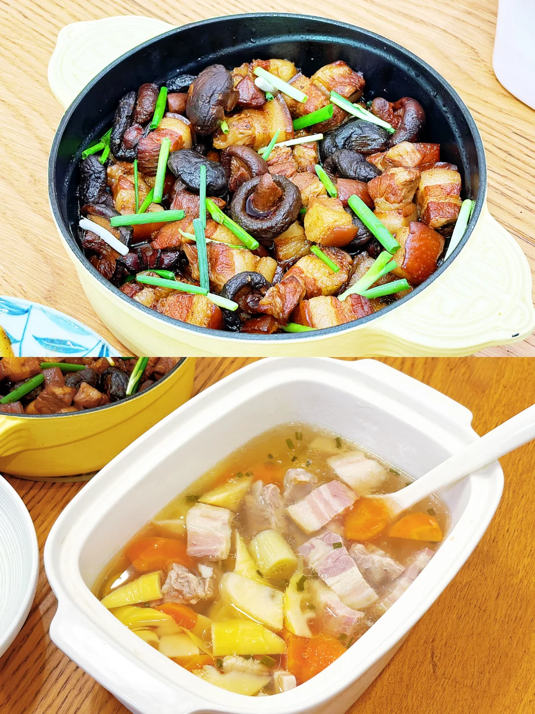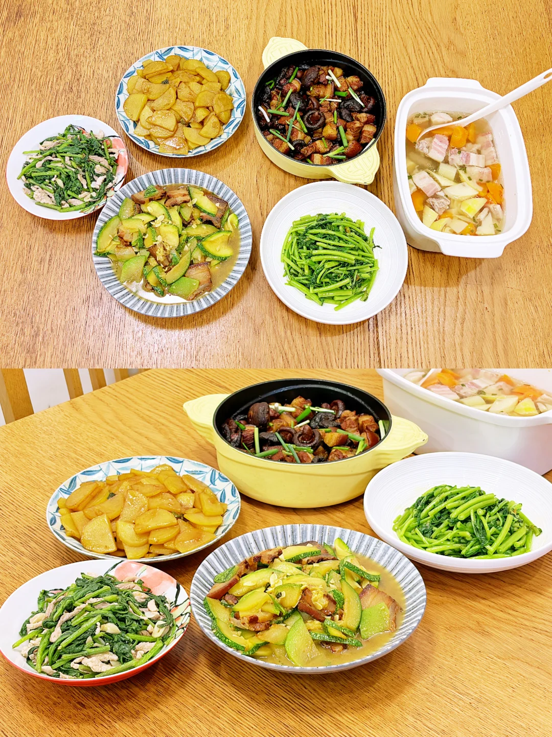 今儿限行,老头儿在家办公,又恰好姐来了,午餐比平时丰盛了些,5菜1汤,荤素搭配,还有2道春天专属菜。 片仔癀青菜炒肉丝 素炒土豆片 清炒蒿子杆 酱油肉炒嫩南瓜 香菇红烧肉 腌笃鲜 大米饭 片仔癀青菜头一次吃,清香中带着一丝丝甜味;刚出土的新土豆又面又糯;春笋和咸肉、排骨同炖,鲜美脆嫩,不愧是春季必吃菜。