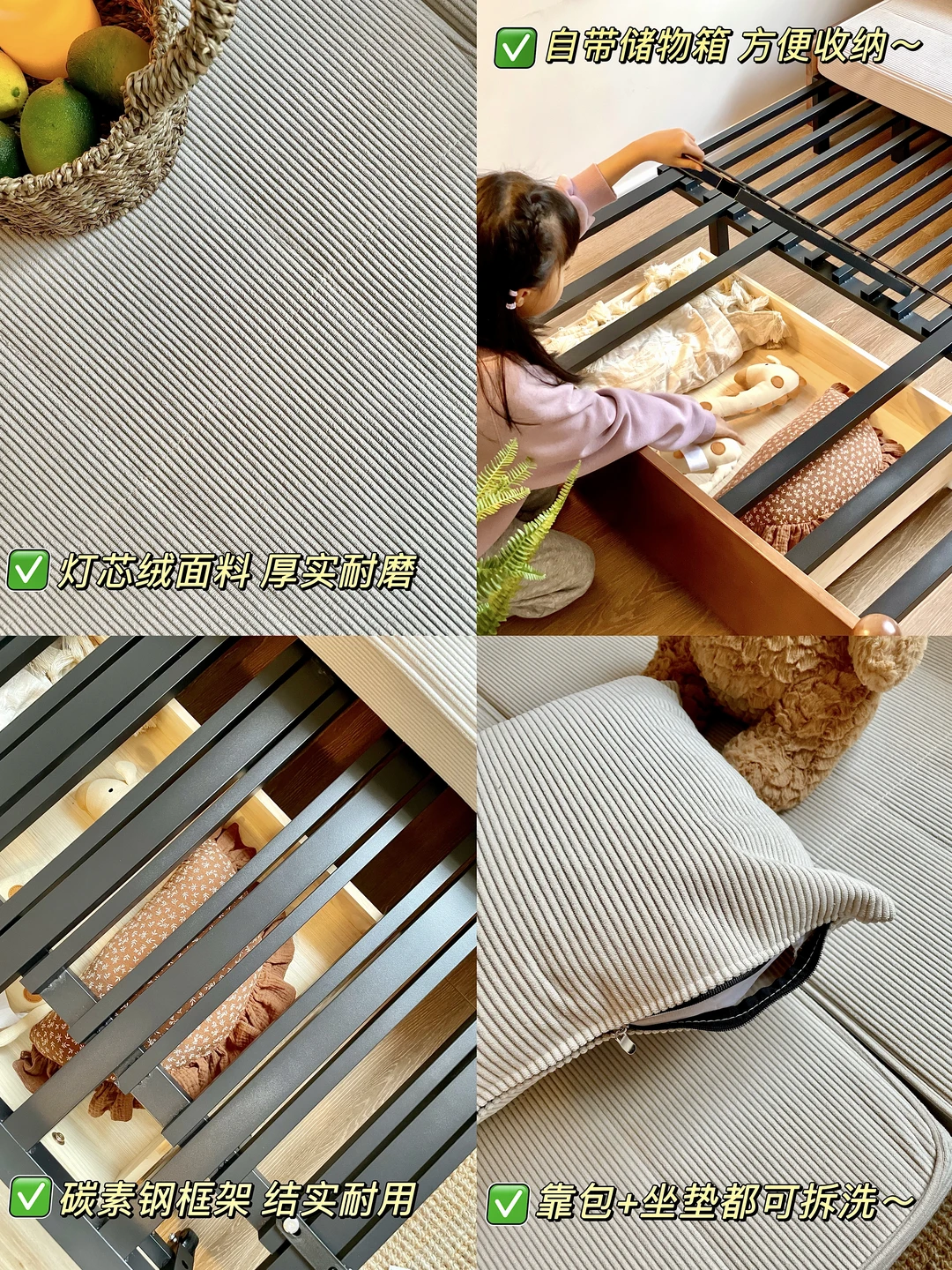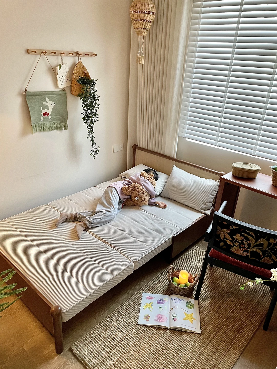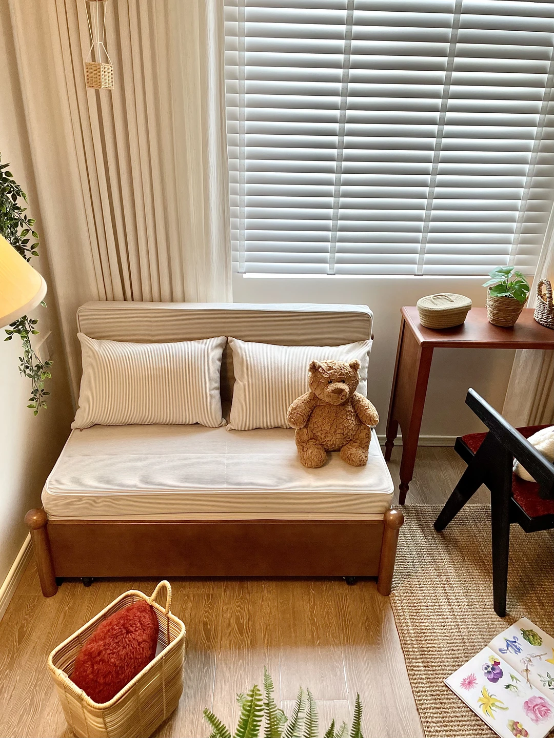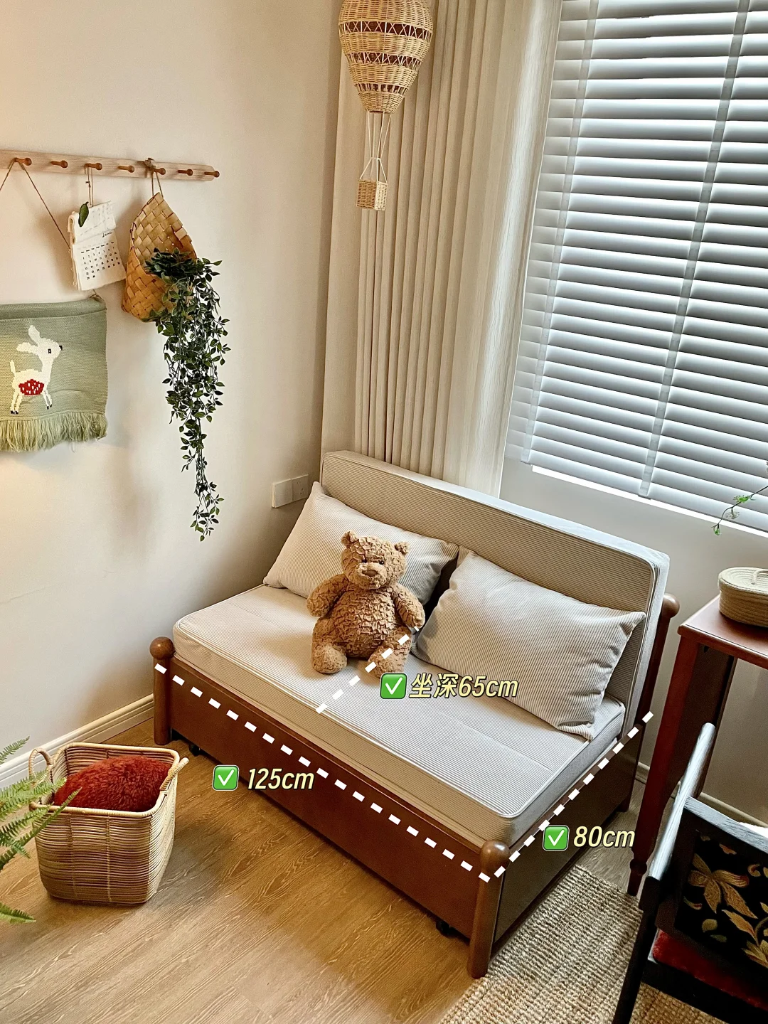 巴掌大的小卧室既要颜值又要实用,我家只有8平米的小房间,原本只放了妆台柜当办公区,最近想把房间改造一下,亲戚朋友来了也可以留宿休息,挑选了好久,终于入手伊思帕这款推拉沙发床,直接把小卧室变成书房+客房,别提有多实用啦! · 平时折叠起来就是1.25米的小巧沙发🛋️,不占空间还特别实用,窝在上面追剧、看书都很惬意~拉开秒变长1.92米单人床🛏️,偶尔亲戚朋友来家里留宿也不用发愁啦,真的做到了“一物多用”~ · 藤编元素搭配实木框架,复古又高级,灯芯绒面料厚实摸起来质感十足,靠包和坐垫都是可拆洗的,打理起来超省心!椰棕+海绵的垫子很舒服,久坐不塌,底部还自带储物箱收纳日常物品,拿取也很方便! 8平米也能拥有休闲、睡眠、办公于一体的多功能小天地,幸福感满满~小卧室的姐妹真的可以闭眼冲!
