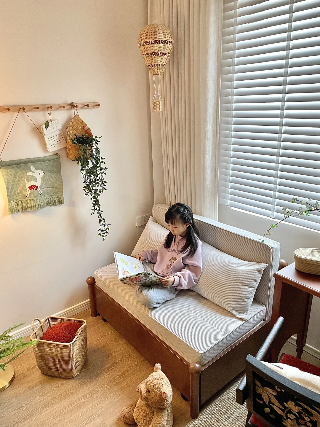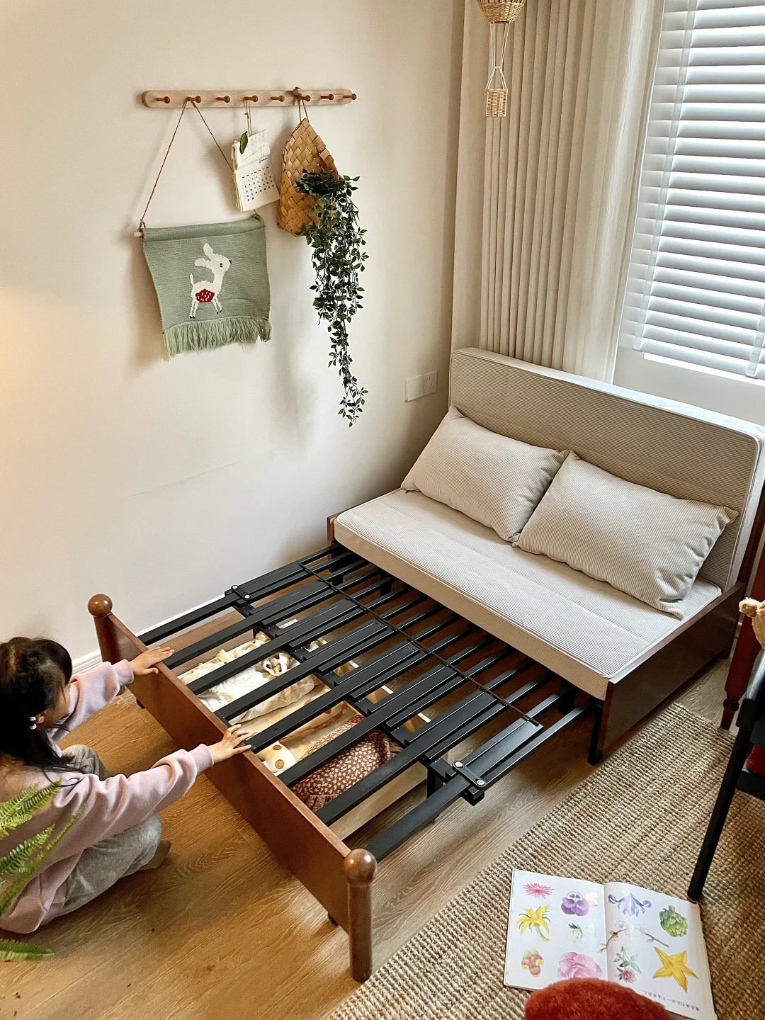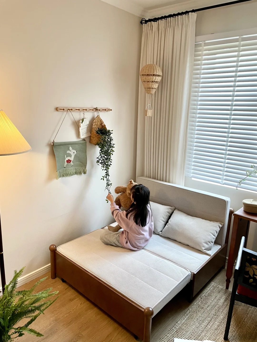 巴掌大的小卧室既要颜值又要实用,我家只有8平米的小房间,原本只放了妆台柜当办公区,最近想把房间改造一下,亲戚朋友来了也可以留宿休息,挑选了好久,终于入手伊思帕这款推拉沙发床,直接把小卧室变成书房+客房,别提有多实用啦! · 平时折叠起来就是1.25米的小巧沙发🛋️,不占空间还特别实用,窝在上面追剧、看书都很惬意~拉开秒变长1.92米单人床🛏️,偶尔亲戚朋友来家里留宿也不用发愁啦,真的做到了“一物多用”~ · 藤编元素搭配实木框架,复古又高级,灯芯绒面料厚实摸起来质感十足,靠包和坐垫都是可拆洗的,打理起来超省心!椰棕+海绵的垫子很舒服,久坐不塌,底部还自带储物箱收纳日常物品,拿取也很方便! 8平米也能拥有休闲、睡眠、办公于一体的多功能小天地,幸福感满满~小卧室的姐妹真的可以闭眼冲!