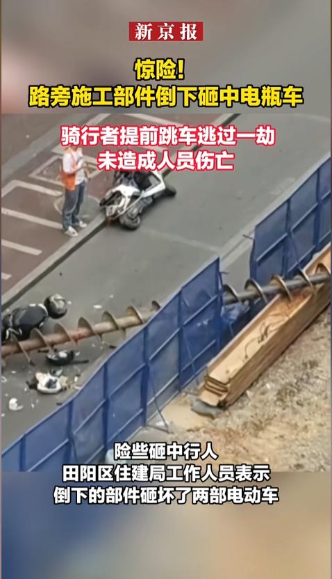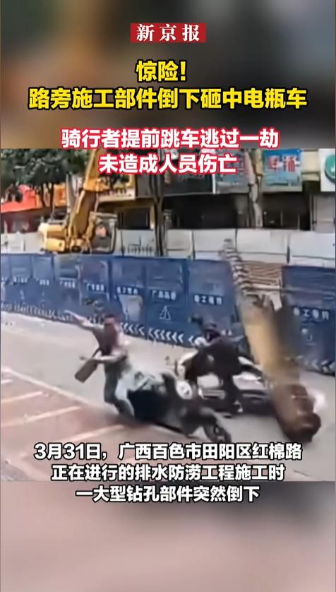 “太吓人了!”近日,广西百色,一道路上正在进行钻孔施工,突然间,钻孔部件发生了事故,巨大的杆件砸向一旁,落点附近,一位行人正要通过,还有两辆电动车相向驶来。这时候,一位电车司机迅速跳车,车正好被砸!网友:差点就是三条人命! 安全无小事,尤其是施工现场,稍有不慎就是鲜血淋淋,安全教育、安全预防,可不能只流于形式。 据媒体3月31日报道,事发道路在进行排水防涝工程施工,路上立了围挡,旁边留了一条车道,时不时有行人和电动车通过。 当时,一台大型设备正在钻孔,旁边不远有位行人,一辆黑色电动车正在驶来,对向还有一辆白色电动车,两位司机也都没有戴头盔。 两辆车正要会车呢,意外发生了,巨大的钻杆突然向这边砸了过来。行人见状,赶紧跳上人行道躲避。黑车司机反应迅速,当即跳车,白车司机反应不及,只能身体往前一倾,听天由命。 一瞬间,钻杆避开了司机,砸碎了白车的车尾箱,又接着砸坏了黑车。幸运的是,车坏了,人都没有受伤。 事后,当地相关部门工作人员表示,工作人员已到现场处置,召开了现场安全会,进行了施工安全排查。 网友对此并不买账,一出问题就是开会了、处置了、教育了,怎么事故还是发生了呢?安全员干什么去了?施工方案怎么做的?开工前检查了没有?这次是没伤到人,可也不能就这么轻描淡写的就算了!必须得严查到底! 信息来源:《惊险!路旁施工部件倒下砸中电瓶车 骑行者提前跳车逃过一劫》新京报