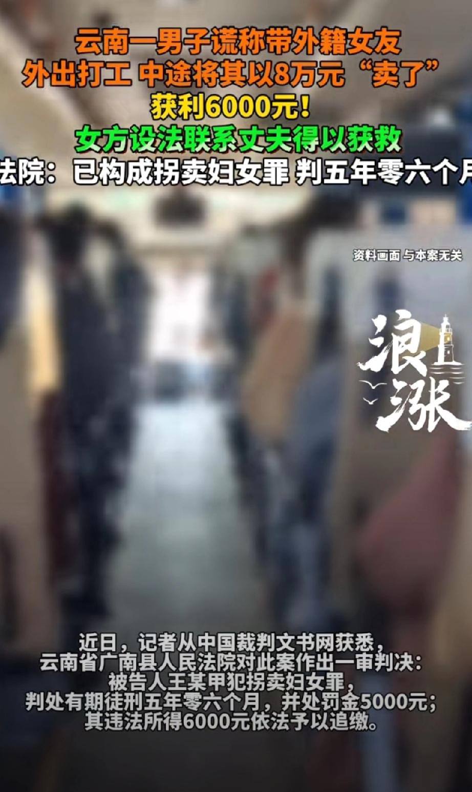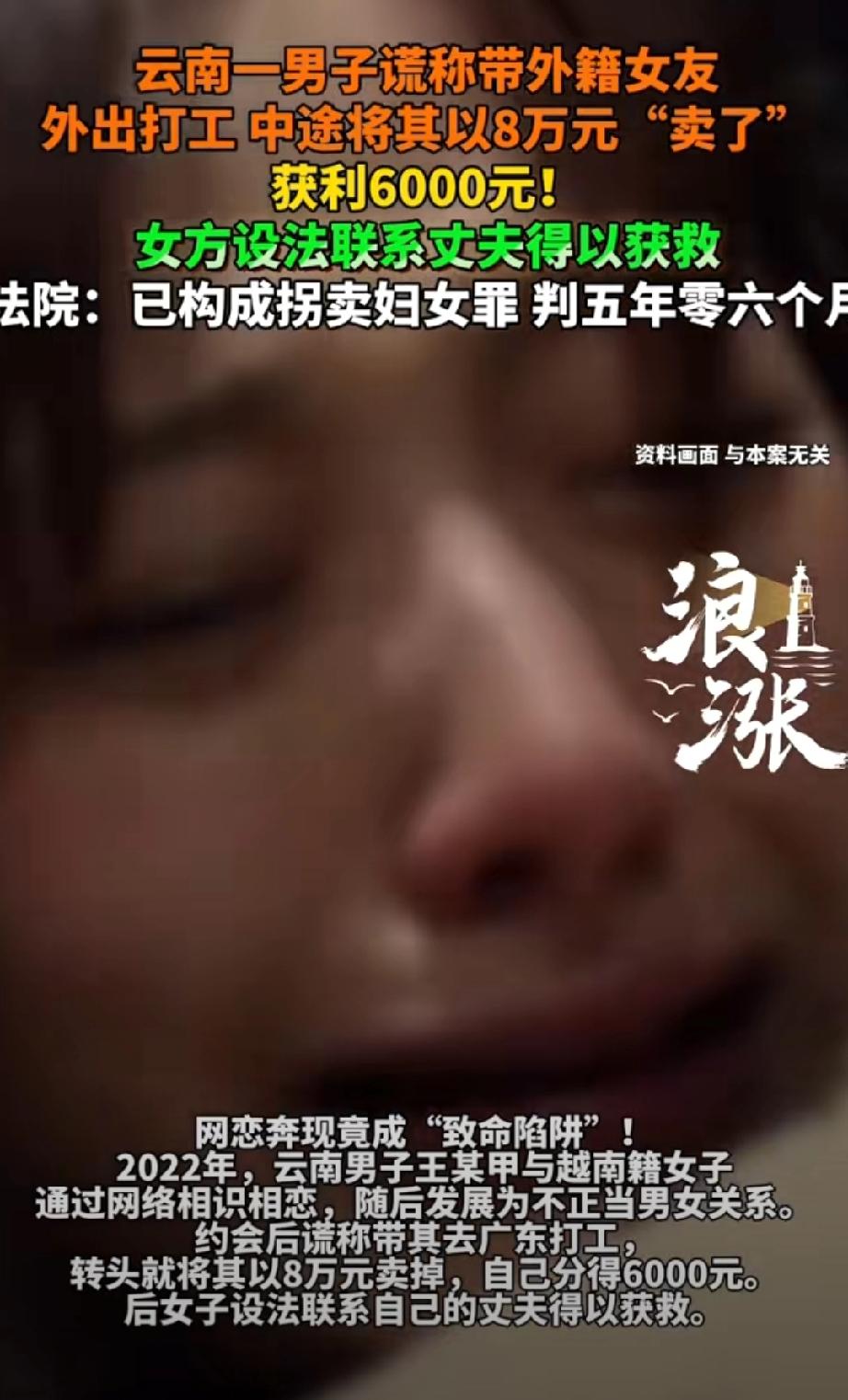 心太黑了!云南,一男子在网上认识了个越南女子,俩人聊着聊着发生不正当关系。本以为是遇到了真爱,哪成想,这男子心太黑了,居然伙同别人,把她以8万块钱的价格给卖了!男子仅分到6000块。网友:才五年,太少了! 王某甲在网上主动搭讪这名越南女子王某乙,王某乙虽然已经结婚、有自己的家庭,但还是和王某甲聊得越来越近,感情迅速升温。 2023年7月,两人线下见面,关系更进一步,王某乙对王某甲完全放下防备,几乎是言听计从,把他当成可以依靠的人。 可这份满满的信任,在王某甲眼里一文不值。他找了个借口,被他俩的事儿被熟人发现了,不能再待在这儿了,得赶紧去广东打工躲一躲。王某乙还真信了他的鬼话,抛下丈夫和孩子,跟着王某甲出发。 没想到,在去广东的路上,王某甲早就和别人串通好了。他和同车的人合伙,把王某乙以8万块钱的价格,卖给了安徽的一个男子。 这8万块钱,王某甲自己只拿到了6000块,剩下的全被同伙拿走了。 好在,王某乙被卖之后,并没有认命。她想办法联系上了自己在越南的丈夫,最后成功获救。 近日,王某甲因为犯拐卖妇女罪,被判处有期徒刑五年零六个月,还得交5000块钱罚金,他那6000块钱的赃款也被追缴了。 王某乙也是糊涂,自己有家庭,还在网上搞这种网恋,结果被人卖了还帮人数钱。不过话说回来,骗人的人更可恨! 而王某甲这种人,心太黑了!你和人家好歹也是相好一场,你怎么下得去手? 为了一点蝇头小利,就把一个信任你的女人推进火坑,你这良心是被狗吃了吗? 更讽刺的是,8万元的交易款,他只分到6000元,就现在可能连个好手机都买不到,可王某甲就为了这点钱,把自己的人性、良知,还有后半辈子都搭进去了。 这不仅仅是法律意识淡薄,这是骨子里的坏!这种拐卖妇女的行为,毁掉的是一个人,甚至是一个家庭!必须严惩,才能解民愤! 网恋有风险,交友需谨慎!面对陌生人的热情和承诺,一定要保持清醒,不要轻易相信,更不要跟着对方离开熟悉的环境,尤其是对方急于带你外出时,多留个心眼,才能保护好自己。 同时,无论婚姻里有多少不如意,都不能拿自己的安全去赌,更不能轻易背叛家庭、轻信外人。信任很珍贵,一旦错付,可能会付出惨痛的代价。 国家对于拐卖妇女这种犯罪行为是“零容忍”的。不管你卖了多少人,拿了多少钱,只要干了这种违法的事,法律就不会放过你!天网恢恢,疏而不漏。 咱们每个人都应该提高自我保护意识,也希望这样的悲剧,以后能越来越少!