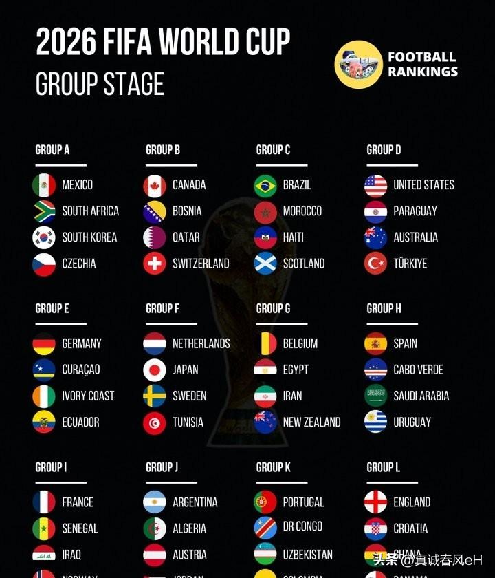 伊拉克赢了玻利维亚,48支队伍终于齐了。 这事不是小事,毕竟世界杯第一次扩到48队,所有名额现在都定死了,再没变数。 32变48,不光是多踢几场,赛制整个重来了一遍。 欧洲16队最多,但踢附加赛差点翻车;非洲10队创纪录,科特迪瓦、塞内加尔全来了;亚洲9队,伊拉克是最后一个挤进来的,40年没来过。 中北美6队,含美加墨三个东道主,没多占一个名额。大洋洲还是老样子,就新西兰一个。 小组赛12个组,每组4队,前两名加8个成绩最好的第三名出线。第三名怎么比?净胜球、进球数、红黄牌数,一条条算,不搞暗箱。 接着就是新玩意儿——1/16决赛,以前没有这轮,现在32队先打一轮,再进16强。 分组也挺有意思:德国和科特迪瓦、厄瓜多尔同组;法国拉着塞内加尔、伊拉克、挪威凑一桌;荷兰和日本、突尼斯、瑞典扎堆。 场馆横跨三国,16座球场全要连得上,直播时间还特意照顾了中国球迷,早上睁眼就能看。 48支队伍,不是凑数,是真的把非洲、亚洲、中北美更多球队拉进了主舞台。 伊拉克那个进球,进了球门,也进了历史。 世界杯,这次真的不一样了。 美加墨世界杯48强全部落定,谁说扩军只是凑人头?真相藏在第三名的排序规则里。