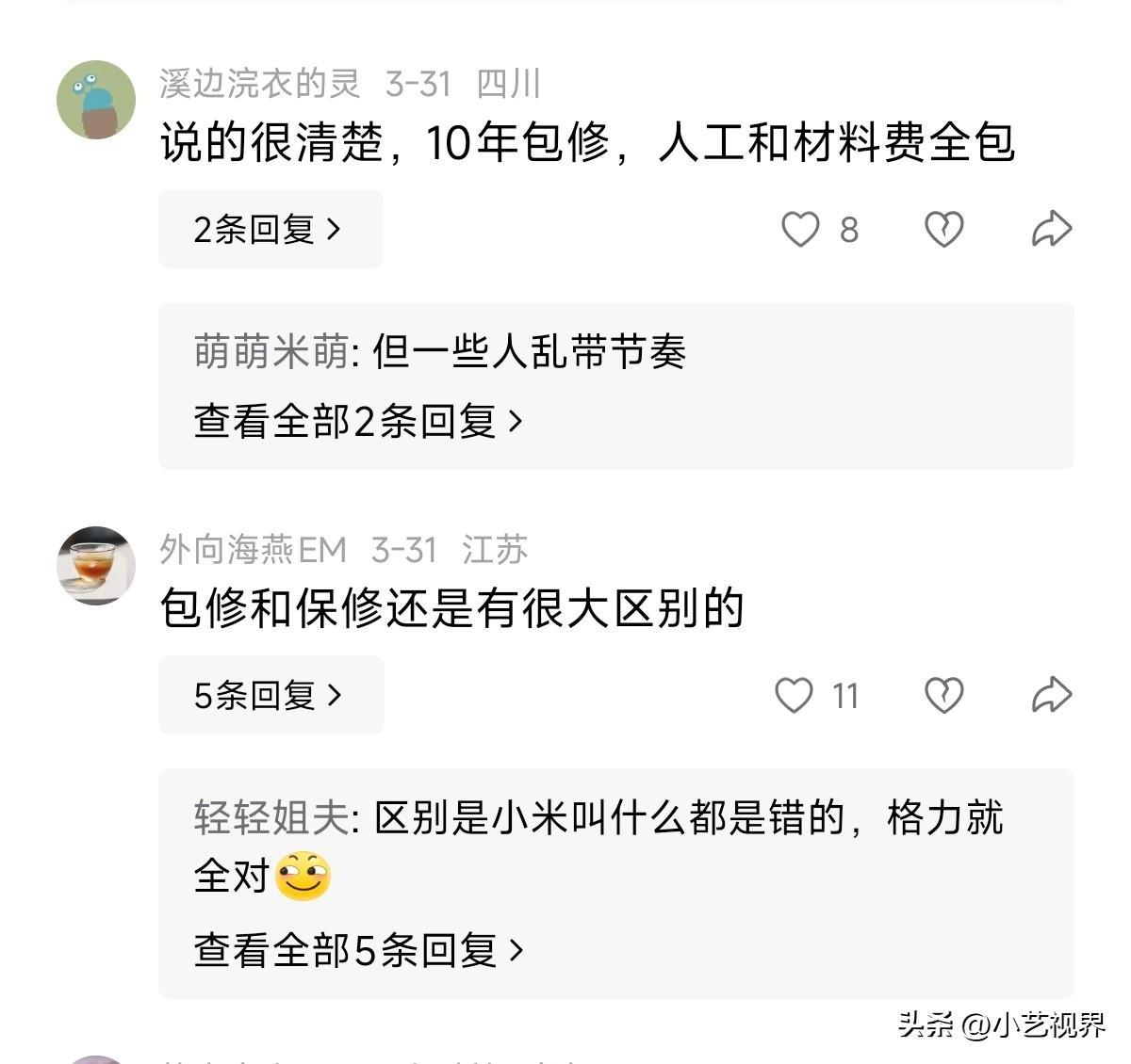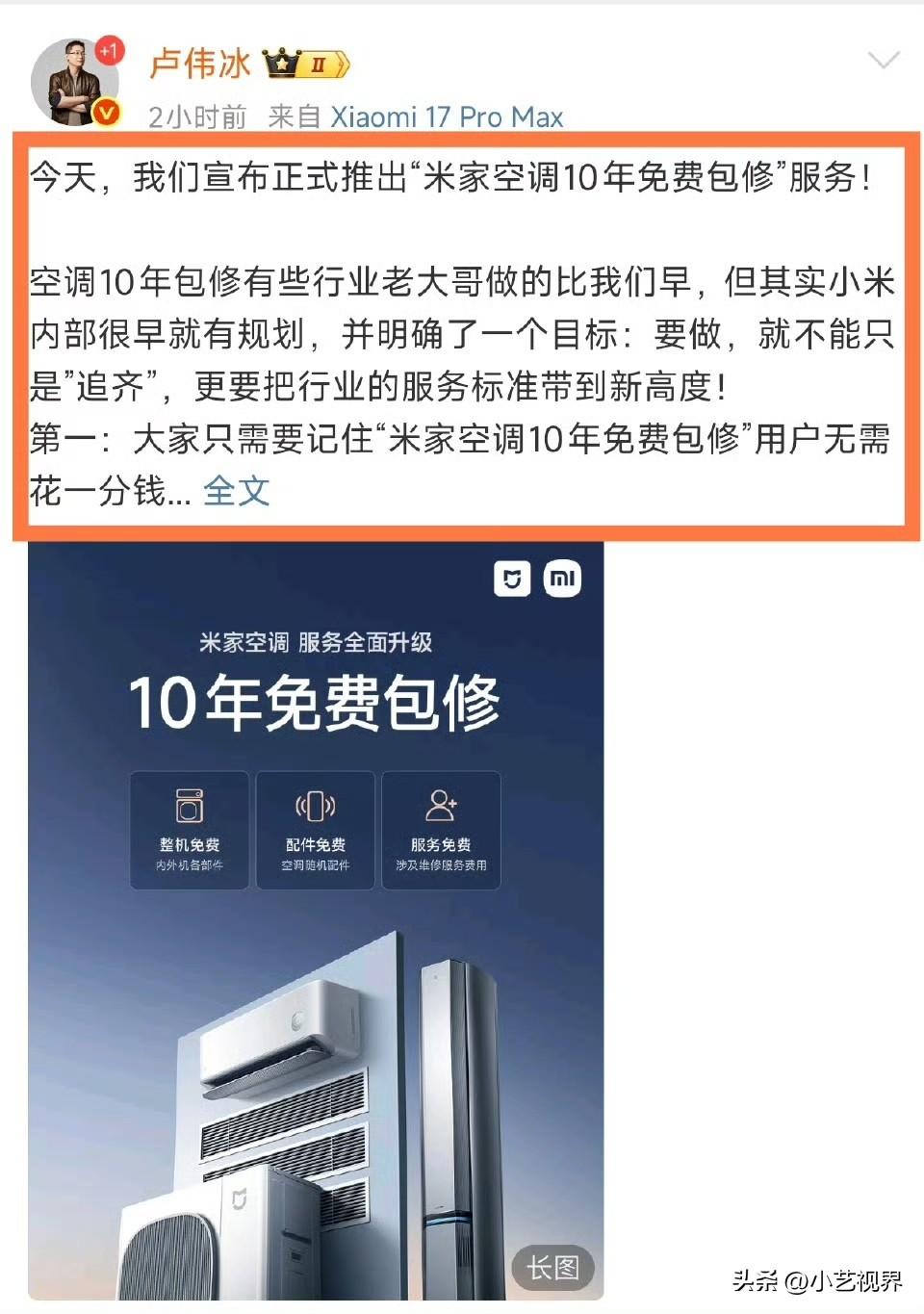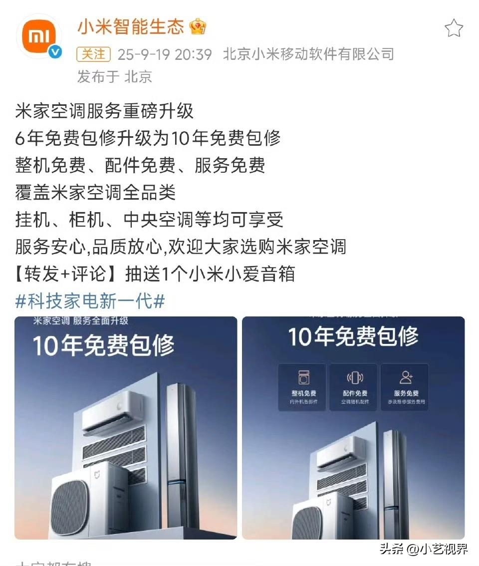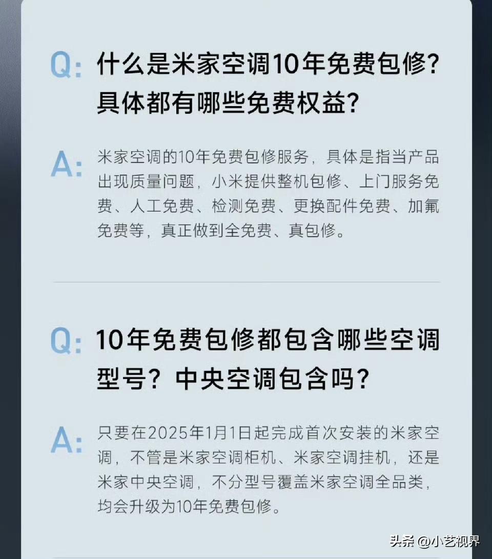 小米对空调「10年免费包修」的政策,宣传的还不是很到位。 截止到今天,还有很多网友认为小米10年包修还需要收费。 虽然小米空调最新的包装上印有「10年免费包修」字样,但仍然需要不断的宣传与科普。 小米空调「10年免费包修」: 整机免费、配件免费、服务免费,覆盖米家空调全品类:挂机、柜机、中央空调等。 人工、检测、更换配件、加氟等均免费。