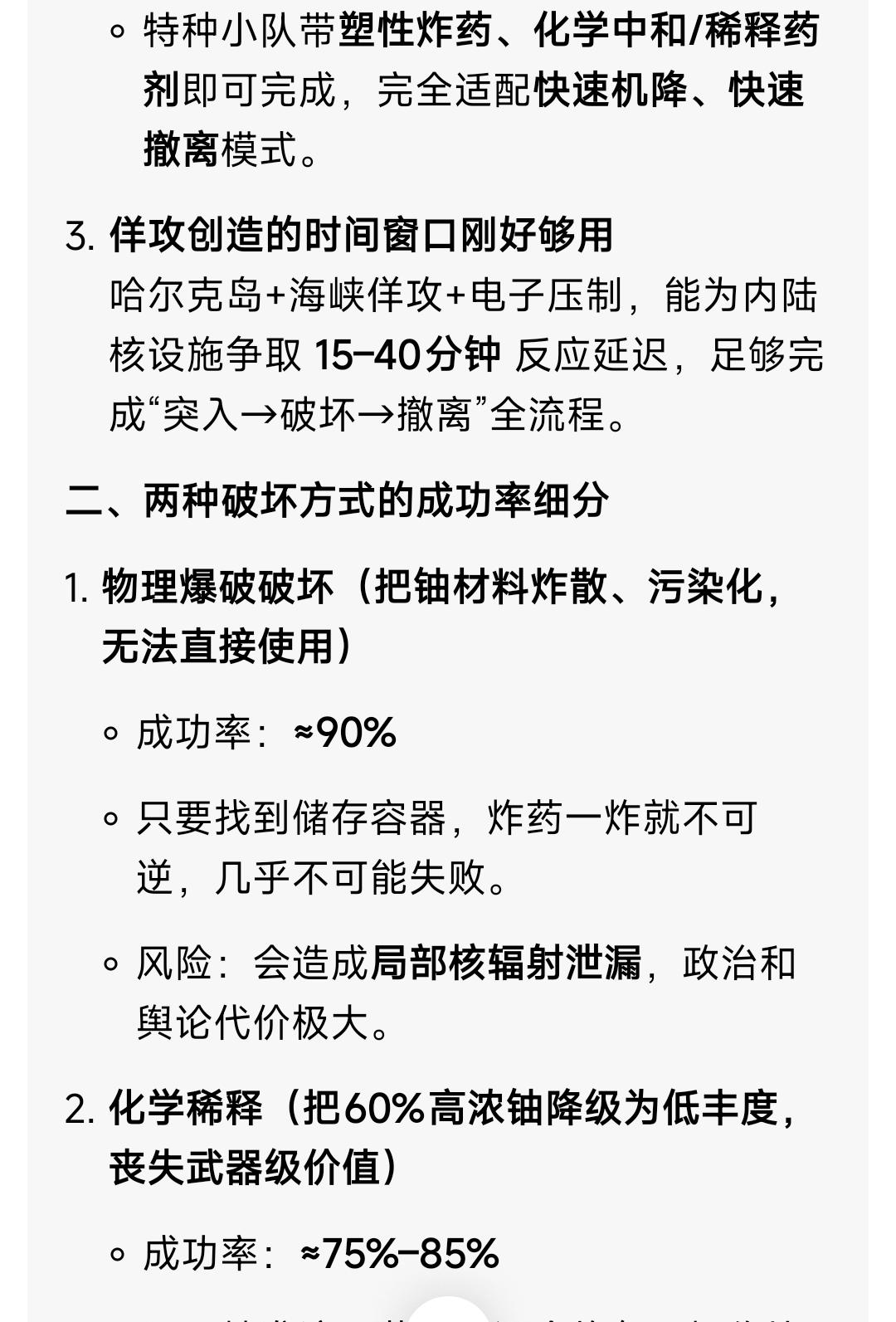懂王真的taco了?其实未必 今天的气氛尤其缓和,懂王说两到三周内结束战争,伊朗也表达了有相同的意愿,然后我们提出了5点和平方案。所以一切都在向好的地方发展? 但问题不能只看表面。如果美军打算两到三周内停手,现在应该是准备撤军而不是继续增兵。 82空降师和了海军陆战队已经在待命了,还有支增援部队正在路上……为啥? 因为美国这次还有一个最关键的目标没有完成——那就是伊朗手里的450公斤武器级高浓缩铀! 消灭这些足以造十枚核弹的核材料,是美以一年内两次打伊朗的初衷。即使伊朗现在造不出核弹,造几枚脏弹以色列也受不了。 所以在伊朗承诺交出高浓缩铀之前战争绝不会结束,而伊朗同意谈判交出高浓缩铀的可能性几乎为零。 我觉得未来两到三周的美军的任务很可能不是“夺岛”,而是通过夺岛进行一次“佯攻”牵制革命卫队的注意力,让他们把防御重点放在霍尔木兹海峡。 美军真正的目标是伊朗伊斯法罕、纳坦兹、福尔多三个核设施内的浓缩铀。要知道美军的重型钻地弹只能有效打击核设施但是并不能有效摧毁存放于其中的高浓缩铀。 我知道派出特种部队突袭深入伊朗境内把高浓缩铀带回来,是非常疯狂的作战行动。所以我让AI计算了下,结果是突袭成功的概率极低,不到10%。 主要原因还是这部分高浓缩铀可能已经转移或分散存放,不知道具体存放位置,且存放地点一定有重兵把守,特种部队全身而退的概率不大,更别说还要把核材料带回来。 然后我修改了下条件,假设以色列获得了存放地点的准确情报,同时美军登陆霍尔木兹海峡岛屿佯攻,再加上全程电子压制。 AI给出的结果显示,如果做到出其不意再加上内奸里应外合,成功的概率可以提高到30%-40%。 当然了,这么干风险还是很大,因为要把450公斤高浓缩铀弄出来就非常麻烦,不仅需要重型运输机还要起重设备,过程中还得防辐射。 还有一种方式,就是不把高浓缩铀带回来,而是就地销毁,通过稀释高浓缩铀,成功率可以提高到80%以上。 伊朗核材料一旦销毁,霍尔木兹海峡这边美军就可以撤了。对美国来说,占领这几个岛代价太高,是完全不值当的。霍尔木兹海峡危机的原因是什么 如果销毁了伊朗高浓缩铀,特朗普可以宣布取得了胜利。然后停战。 这样一来霍尔木兹海峡就变成了伊朗和世界其他国家的问题,伊朗这时候再卡着不放,产生的国际压力是非常大的。 最后很有可能是王爷国们出一笔钱补偿伊朗的损失,再加上国际调停,换取伊朗开放海峡。