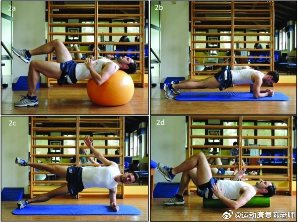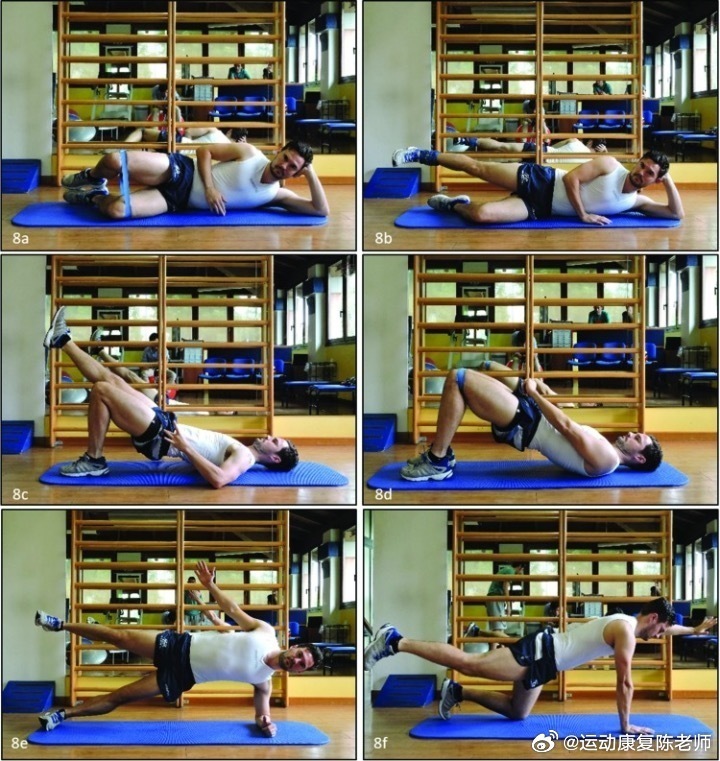 ✅05.【臀大肌训练】1.单纯臀肌激活训练(图4)——蚌式(8a)——臀部伸展侧腿抬高 (8b)——单侧臀桥 (8c)——双侧臀桥 (8d)——侧平板支撑外展 (8e)——鸟犬式(8f)