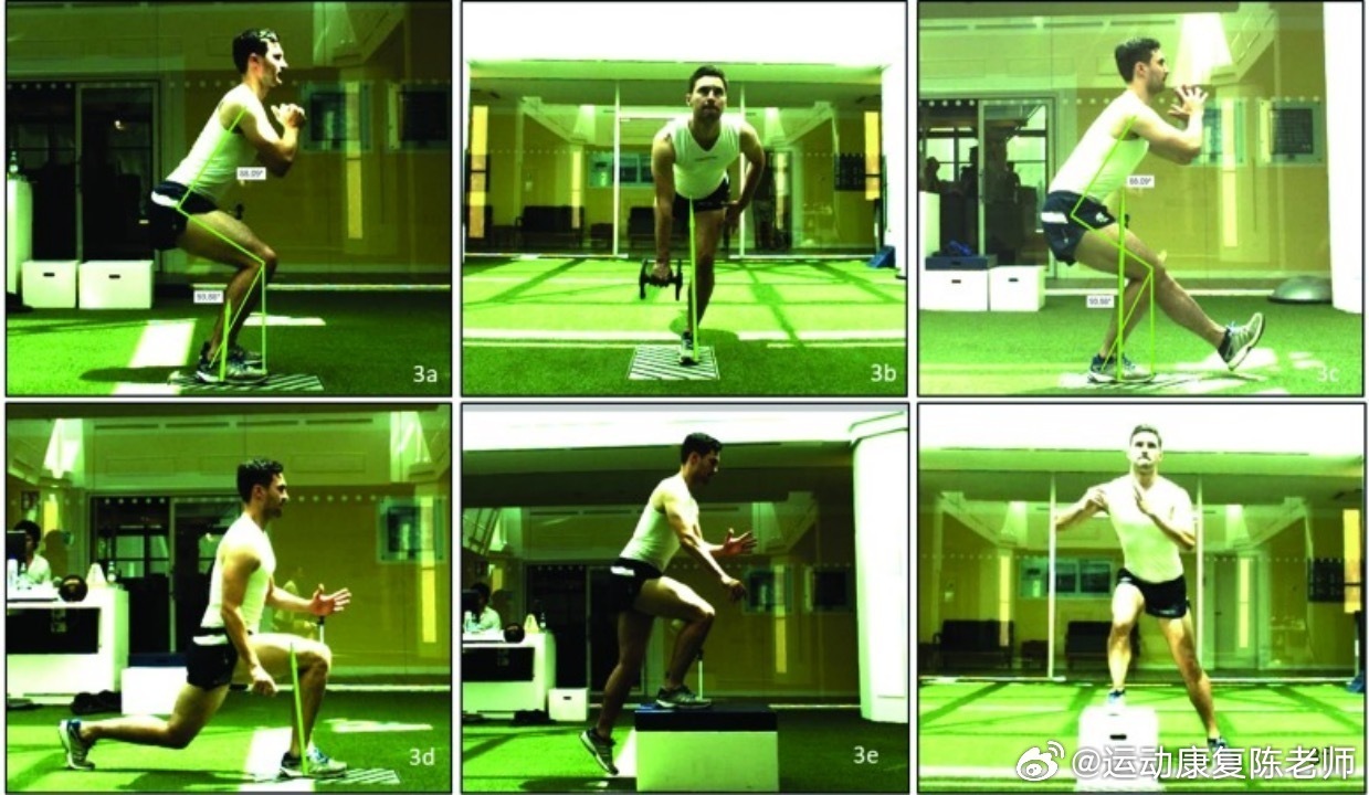 3.融入运动模式的臀大肌训练①功能性负重训练(图6)——双侧深蹲 (3a)——单腿罗马尼亚硬拉 (3b)——单腿深蹲 (3c)——弓箭步蹲(3d)——正面上台阶(3e)——侧向上台阶 (3f)
