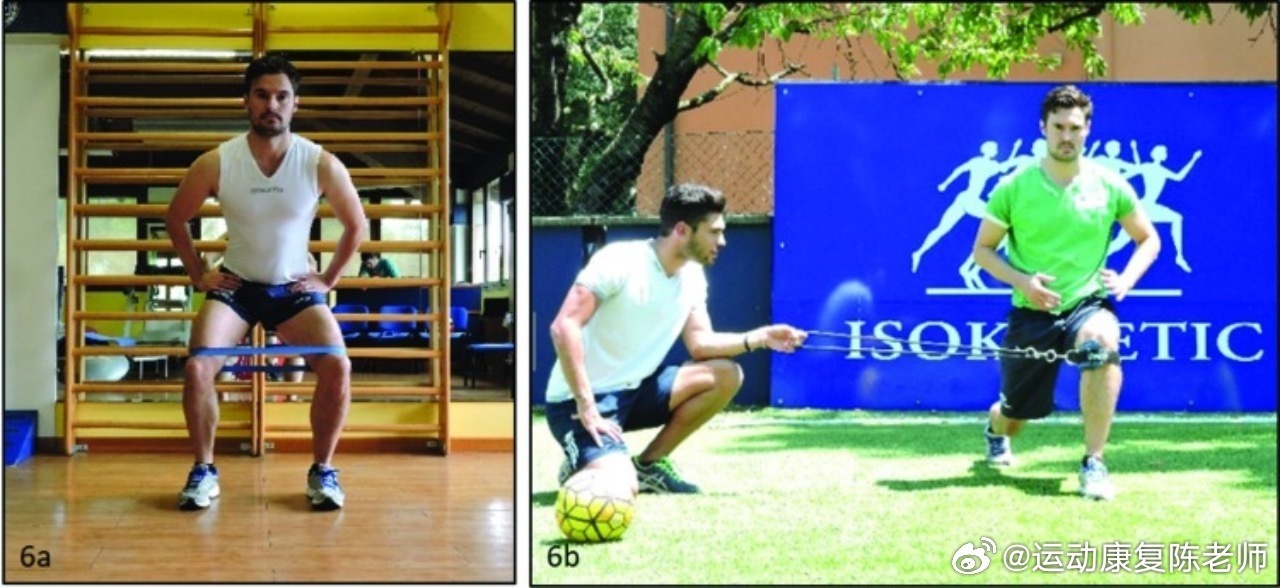 ③抗阻功能性臀肌训练(图8)——屈髋下蹲下和弓箭步下的抗阻力带训练