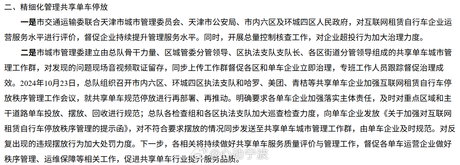 值得注意的是,据天津市城市管理委员会网站此前信息显示,今年1月,该委在答复相关提案时已明确提出,将进一步精细化管理共享单车停放秩序,督促各单车运营企业做好日常秩序管理、运维保障等工作,推动共享单车行业提升服务品质、实现规范发展。(快科技)