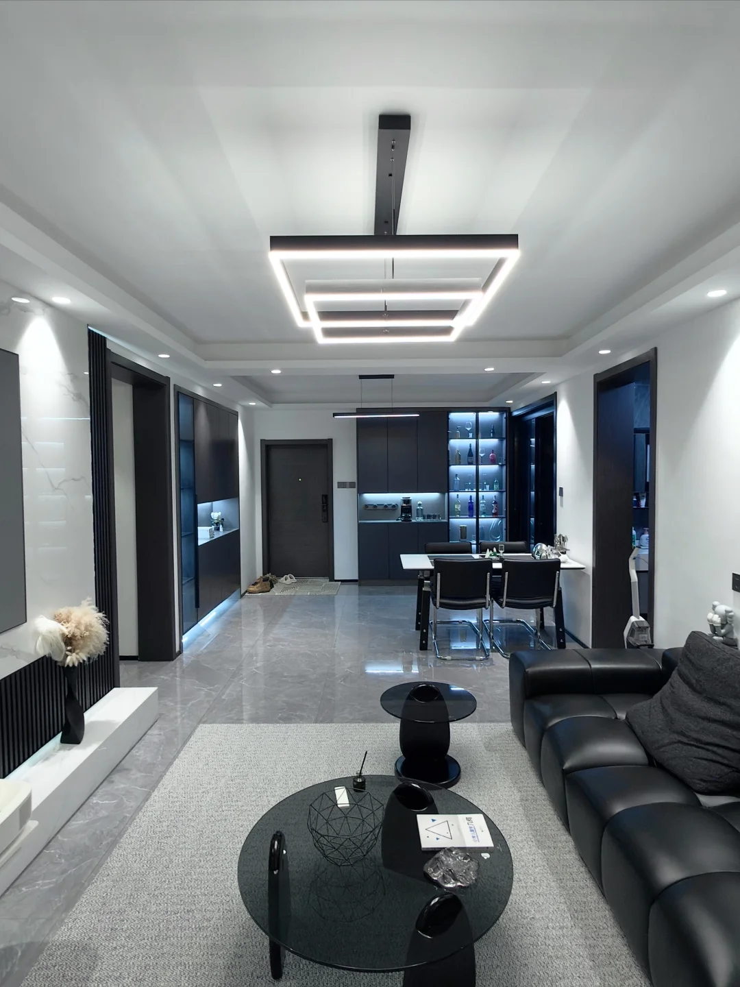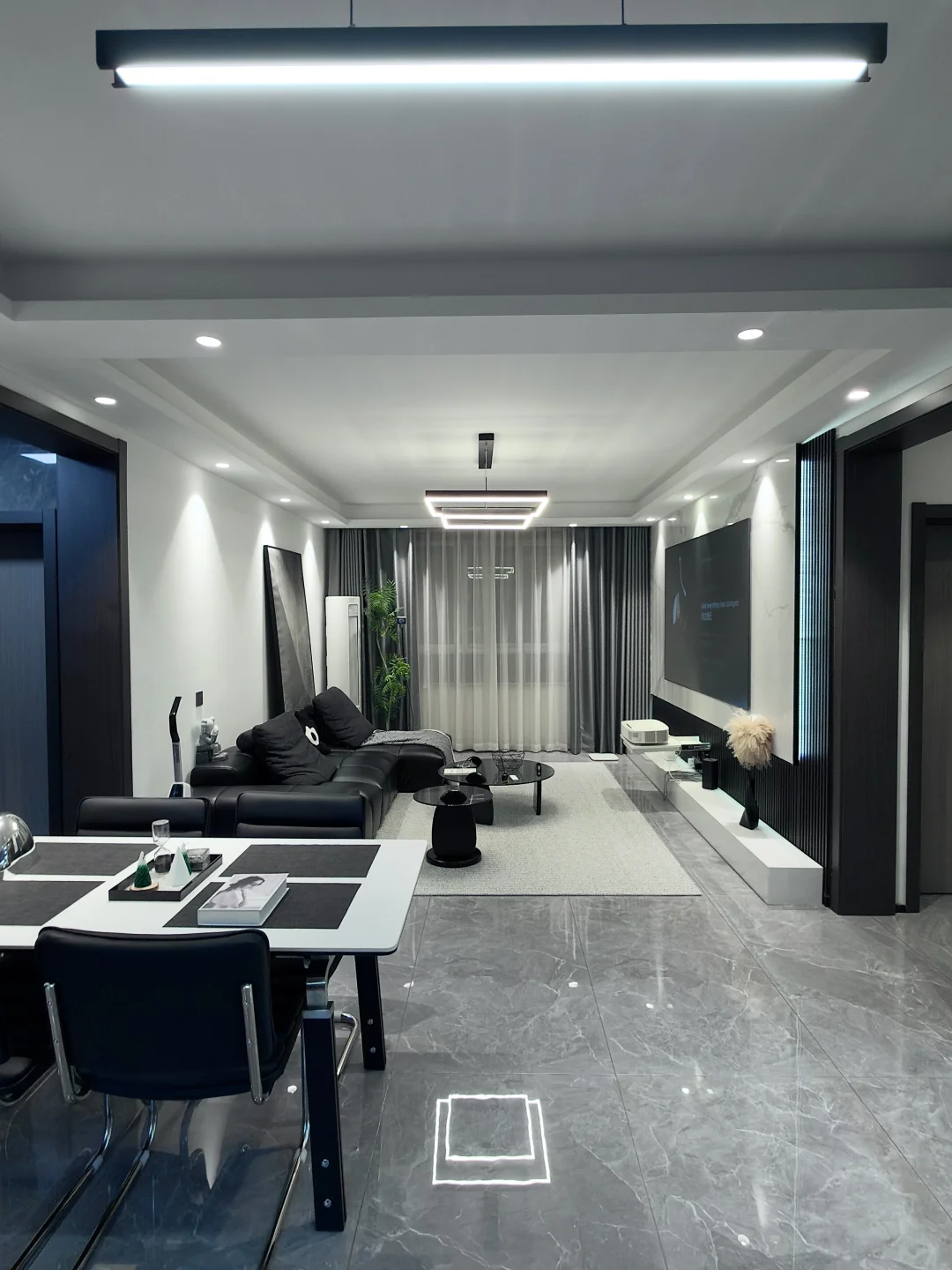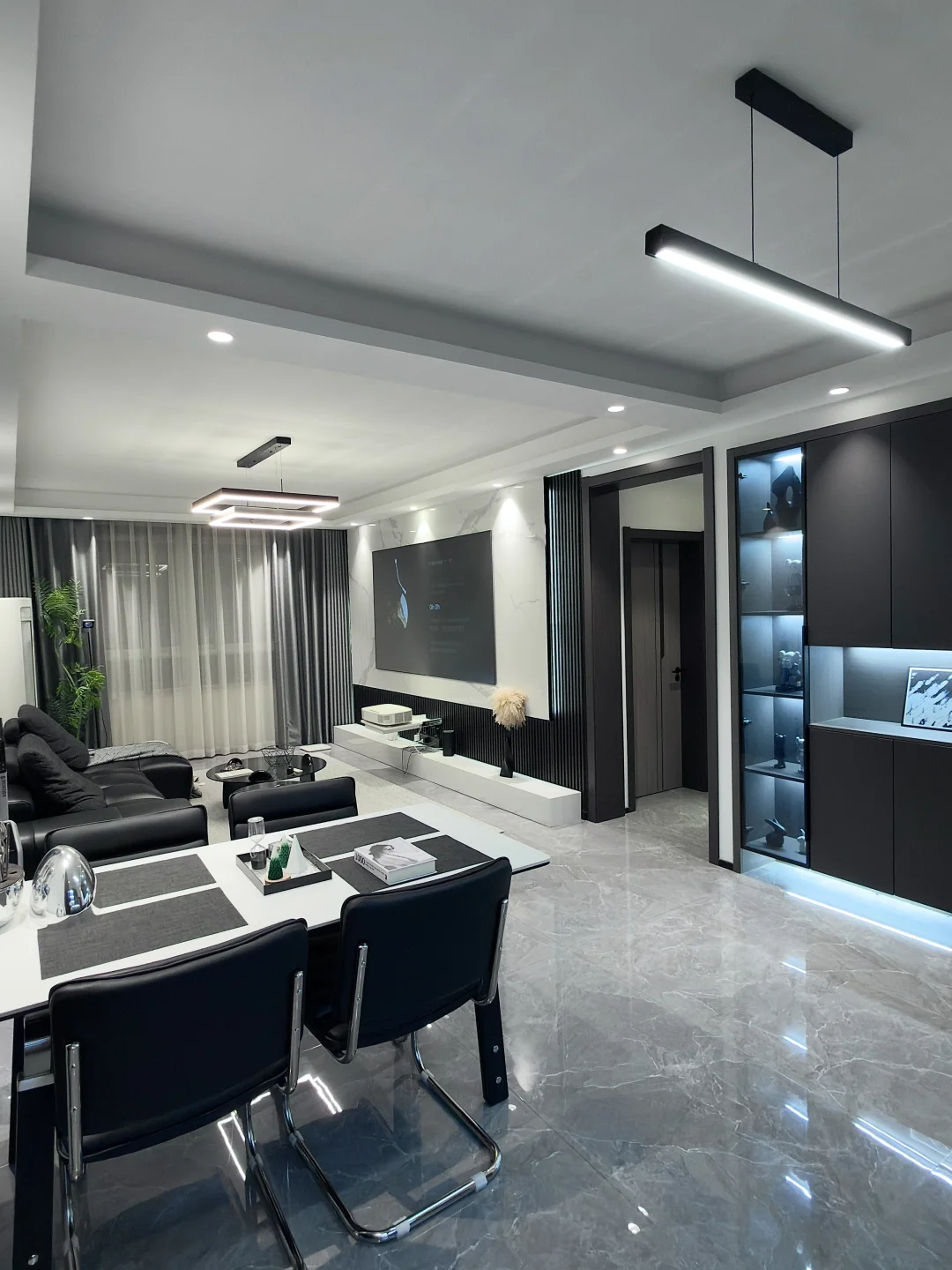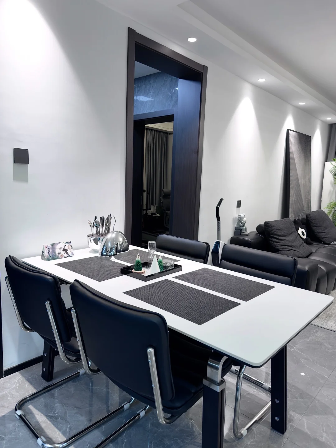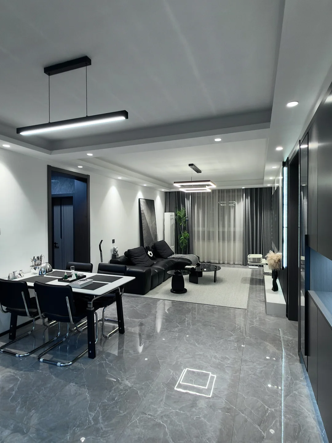 Hi,欢迎来到我的家~ 建面128平,套内115平 户型三室两厅两卫 全程自装,没有请装修公司 - 整体是黑白灰的风格 白色乳胶漆通刷,地面通铺冷灰色大砖 全屋定制柜门肤感灰,柜体科技木灰 白色岩板餐桌搭配黑色皮质座椅 岩板桌面好打理,木质金属桌腿很极简 自己装的小家真的很有成就感~