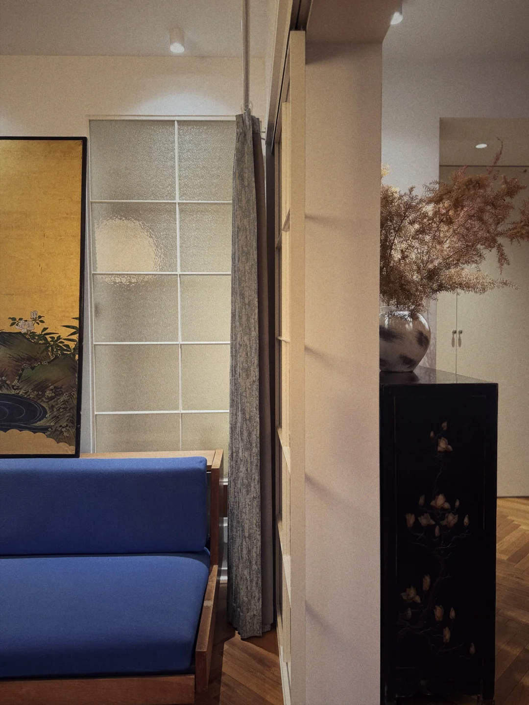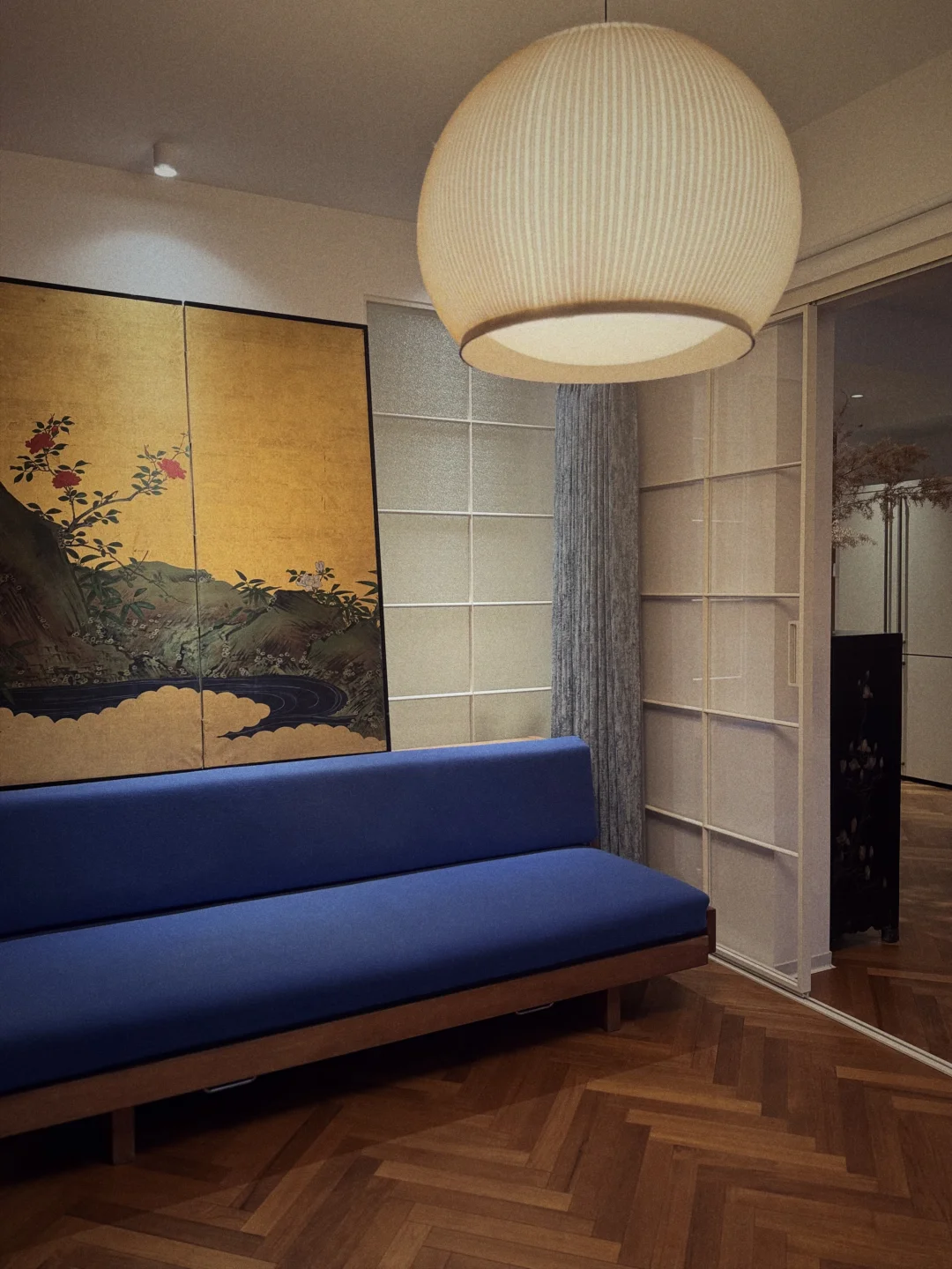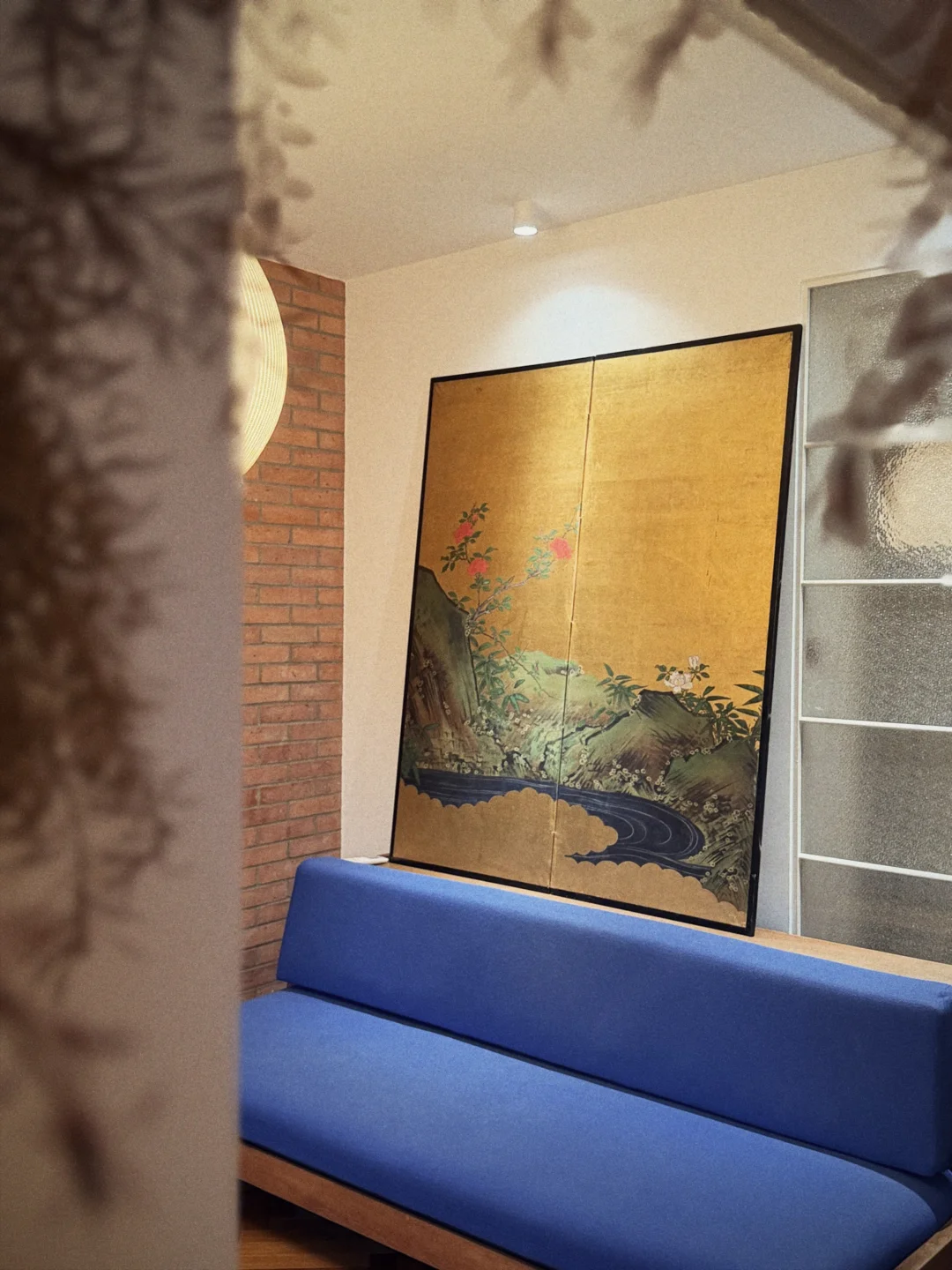 这个案子,在大名鼎鼎的hans vegner这里找到了久违的完美蓝色,有天又看到日式屏风,很小的一片,正好能呼应上我心中那片蓝。夕阳🌇里,金铂反映的那种美,美到我们都忘了拍照。(找机会补上)