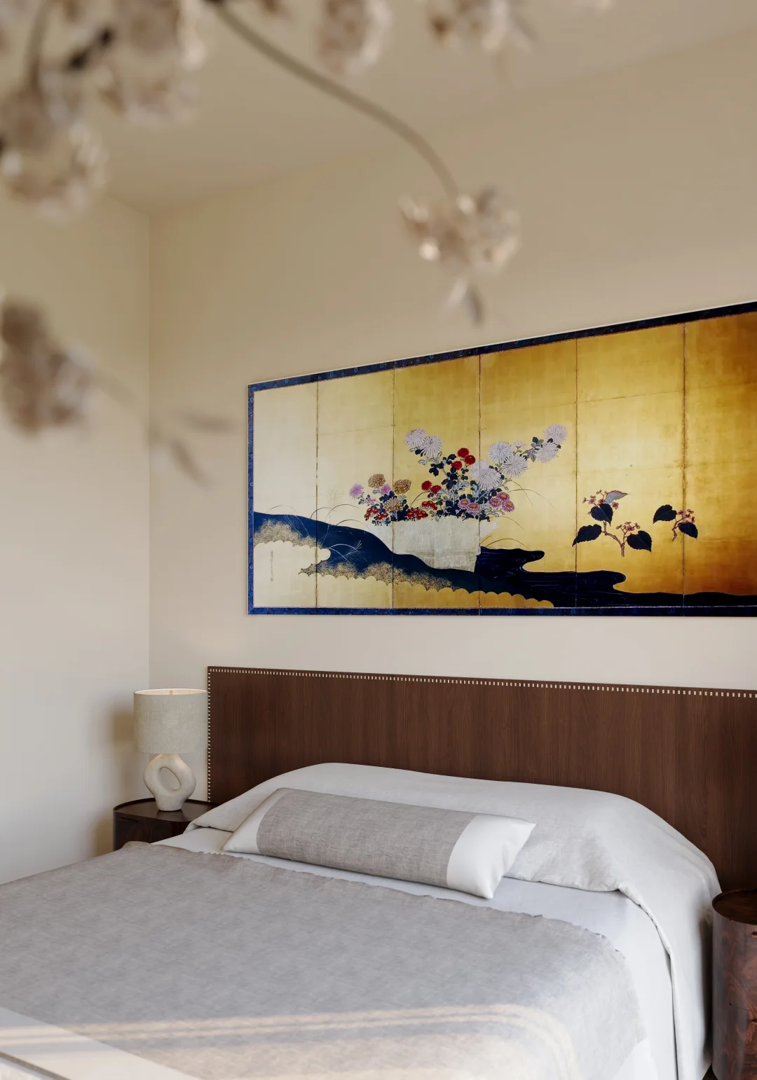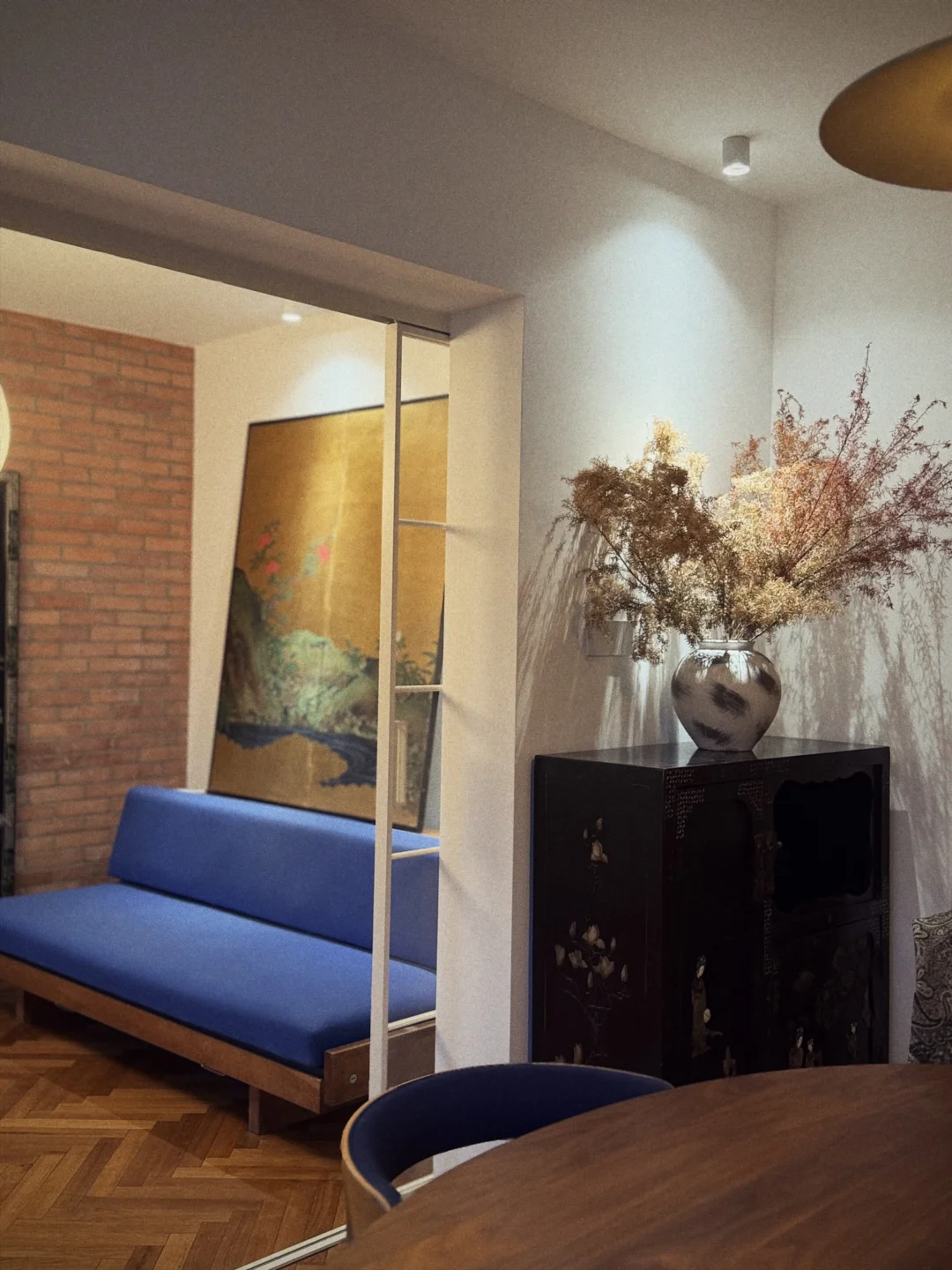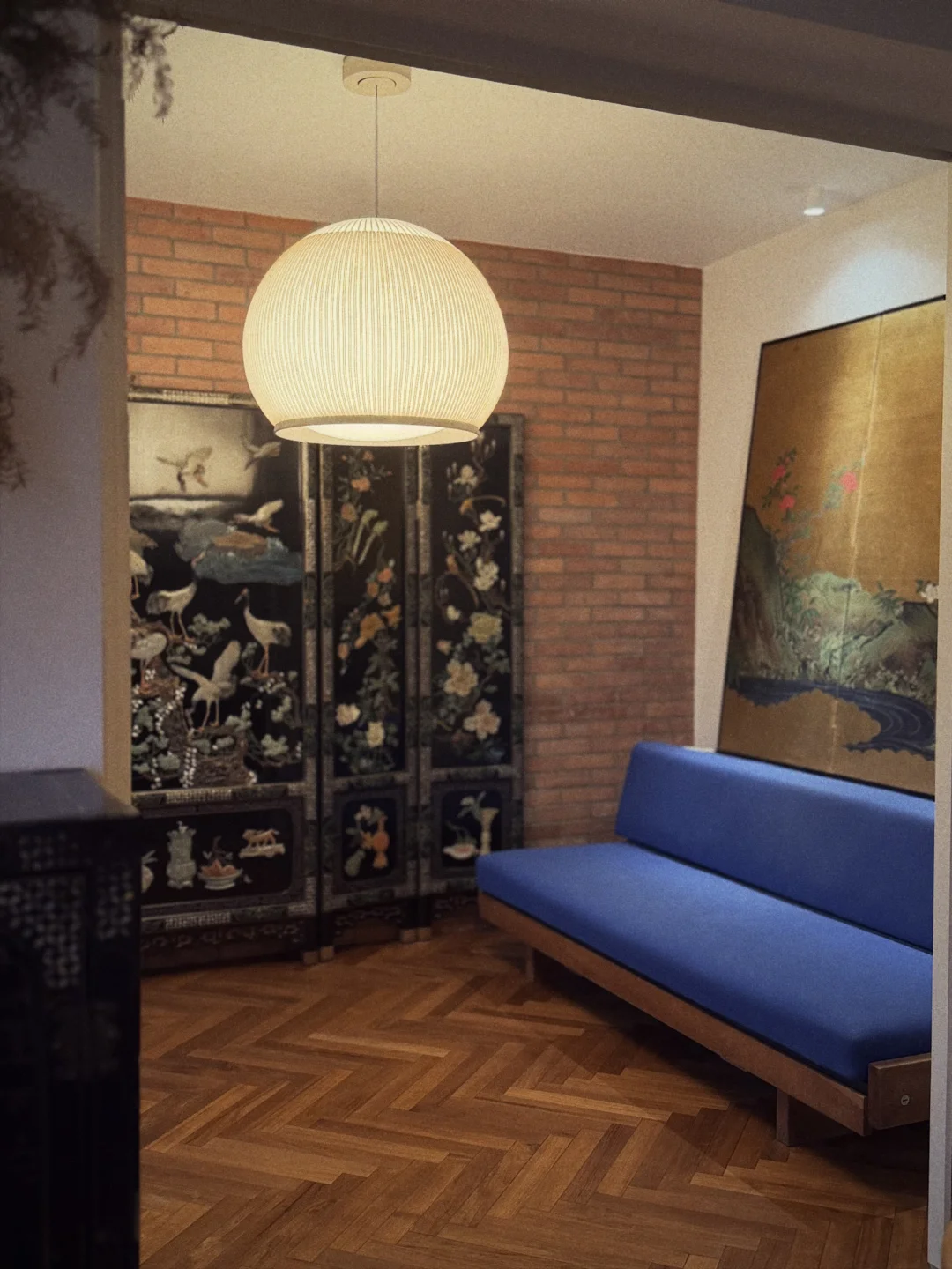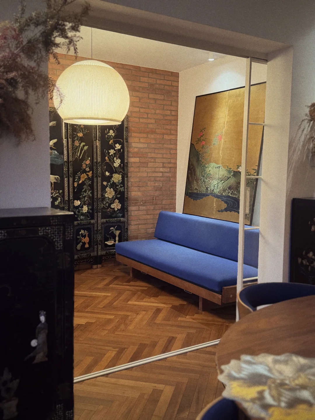 这个案子,在大名鼎鼎的hans vegner这里找到了久违的完美蓝色,有天又看到日式屏风,很小的一片,正好能呼应上我心中那片蓝。夕阳🌇里,金铂反映的那种美,美到我们都忘了拍照。(找机会补上)