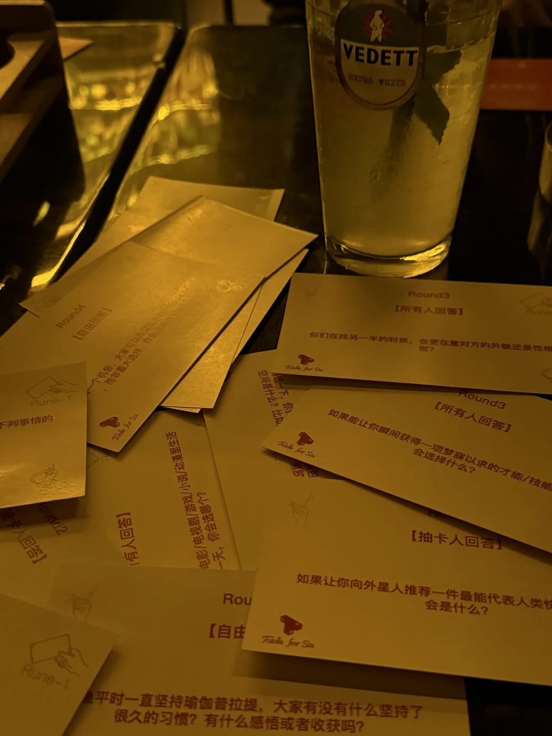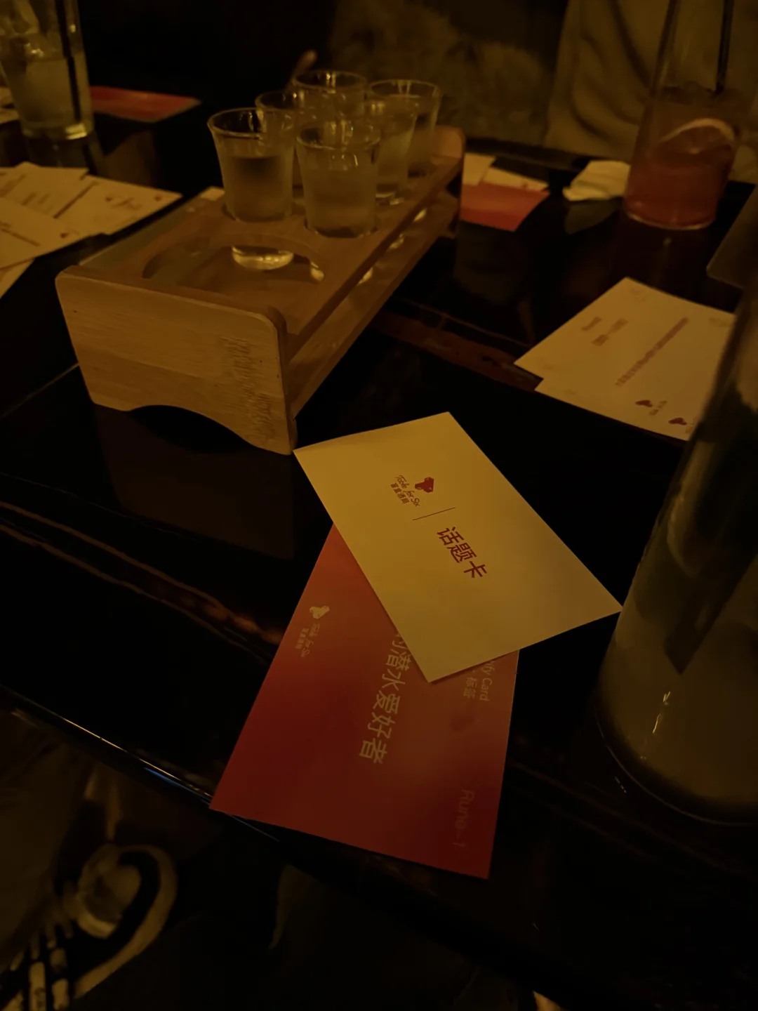 还的是大城市会玩,长沙也马上跟上了这种新体验,参加之后的每一步,都像是待拆开的礼物🎁 后台选取你想要参加的日期以及活动,主题也会不一样,回答一些问题,有全女局,也有男女局,靠近开场了信息解锁才会越来越多 ✔️落地之后就是互相猜身份,他有卡牌,自己就开始回答上面的问题,中间你会跟你的组员💥碰撞很多的火花,大家就这些问题一一发表自己的看法,我们这组聊的炒鸡愉快,因为有朋友迟到了,我们大概9点开始的,没想到聊到12点多了,还意犹未尽~~~ 生活的惊喜,藏在一次新的勇敢尝试里