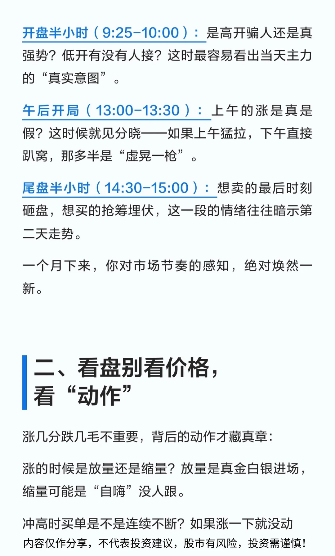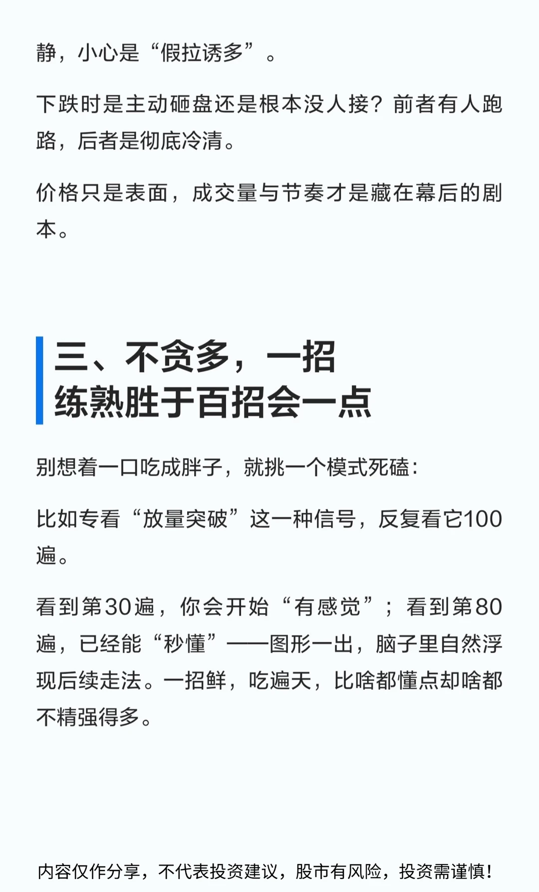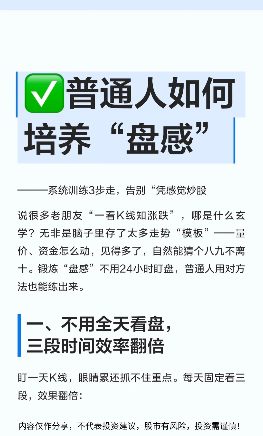 [拔草R]每天固定看三段市场走势,关注成交量与节奏,避免贪多,专练一招,复盘总结经验。盯住熟悉的股票,培养情绪、资金和节奏感,减少踩坑,逐步提升投资水平。