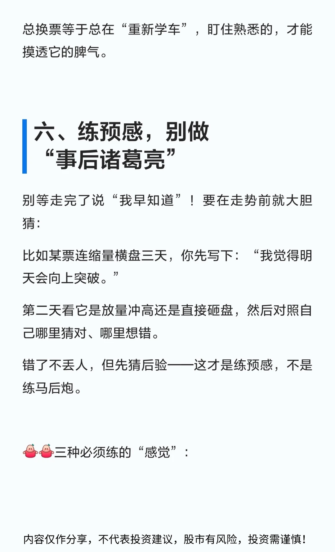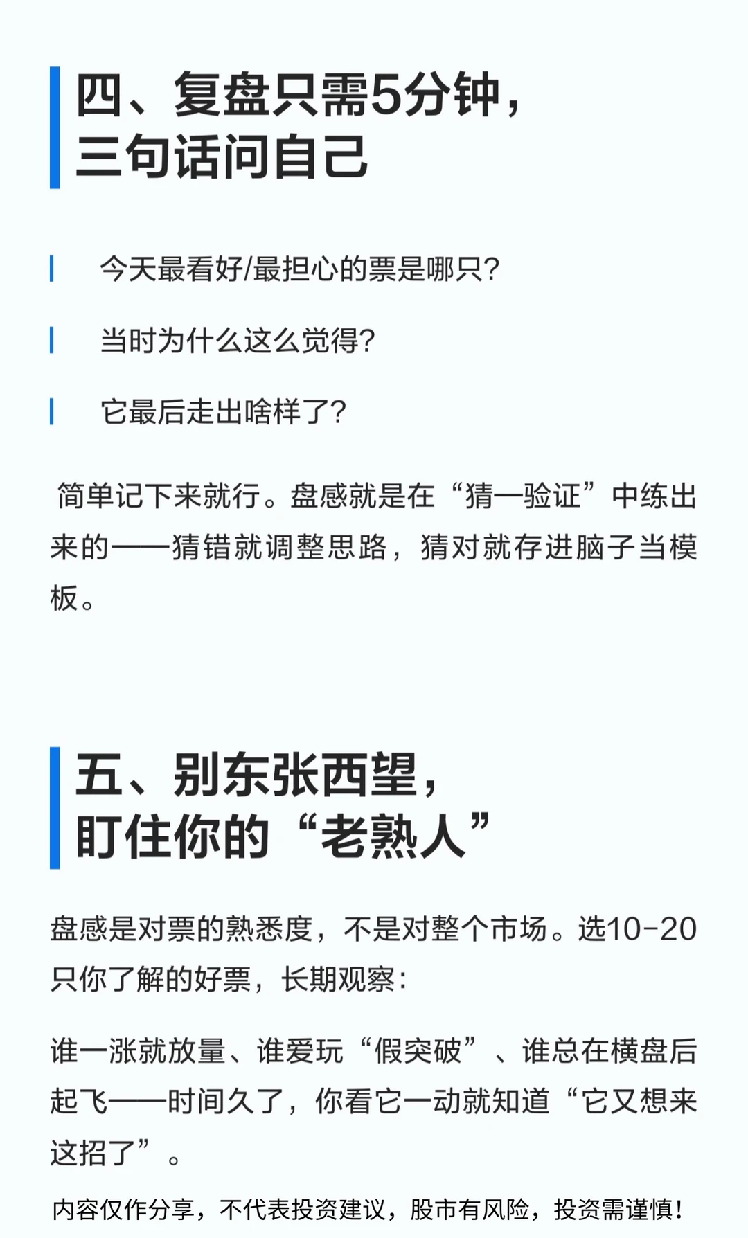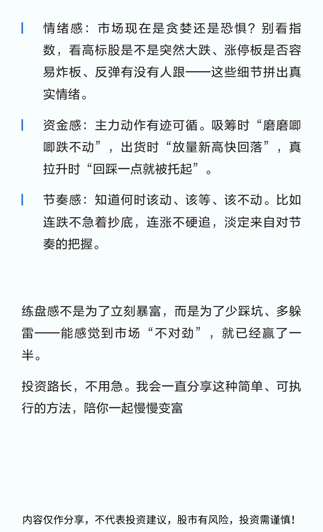 [拔草R]每天固定看三段市场走势,关注成交量与节奏,避免贪多,专练一招,复盘总结经验。盯住熟悉的股票,培养情绪、资金和节奏感,减少踩坑,逐步提升投资水平。