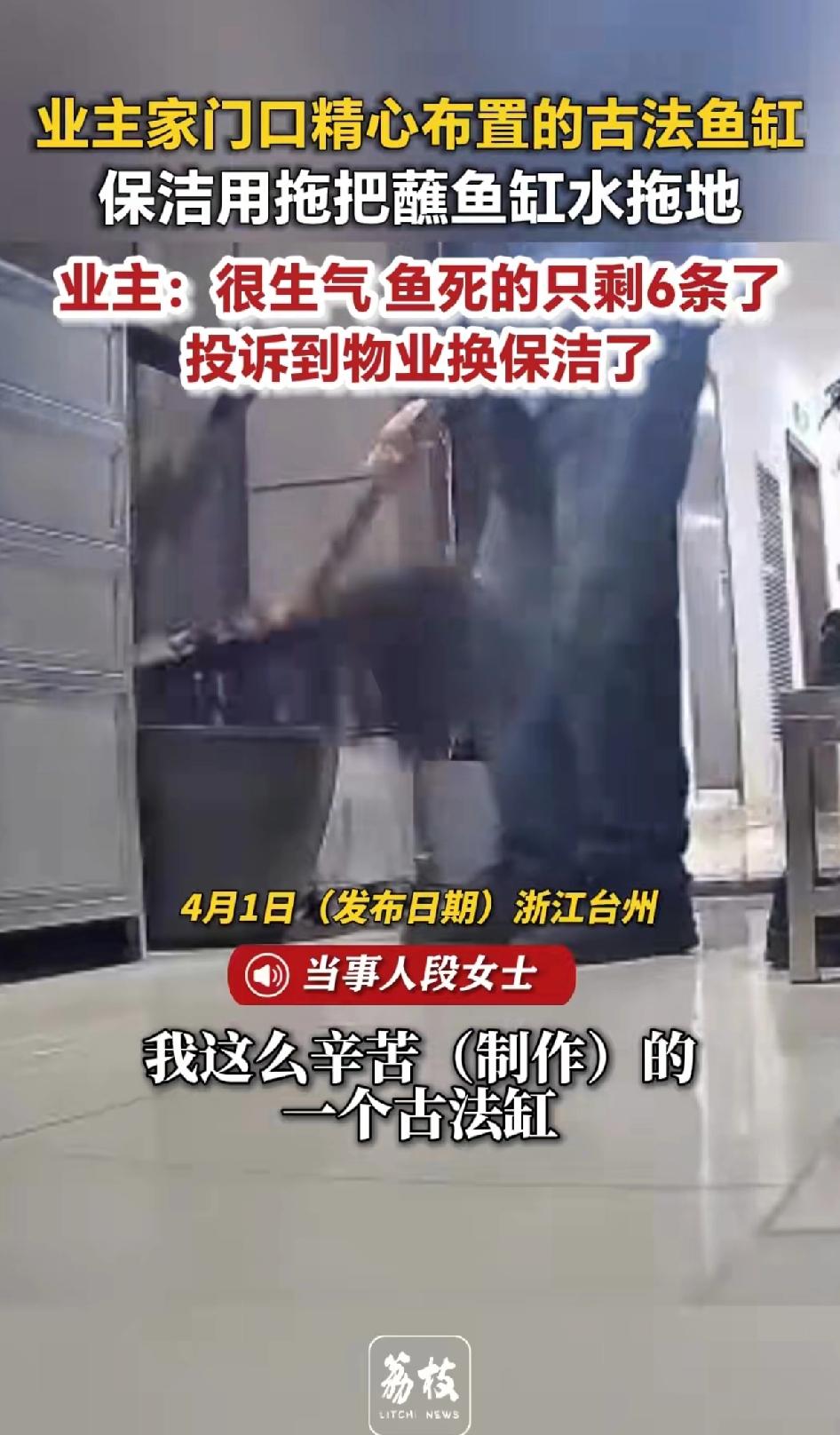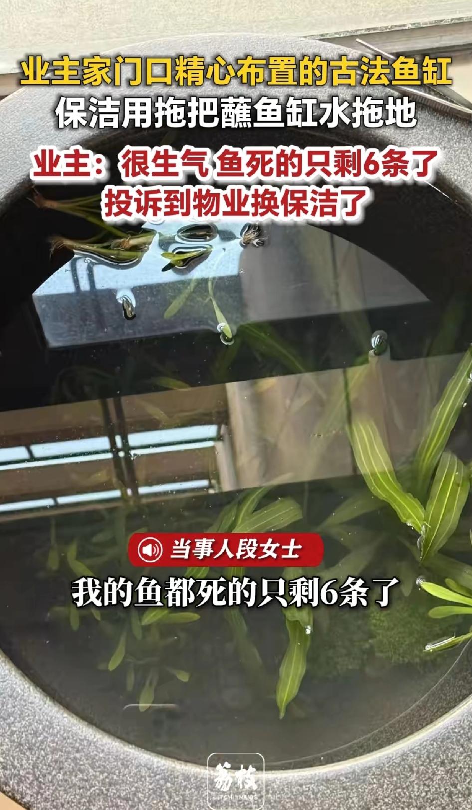 业主家门口精心布置的古法鱼缸小区保洁用拖把蘸鱼缸水拖地! 业主:很生气鱼死了的只剩6条了,投诉到物业换保洁了。 业主精心布置的古法鱼缸,那可是花了心思的,结果被保洁用拖把蘸鱼缸水拖地,这操作简直让人无语!业主生气也情有可原,鱼死得只剩6条了,多闹心啊。 保洁估计是图省事,没考虑到这缸水对业主的重要性。这就像别人精心呵护的宝贝,被你随意践踏。我觉得小区应该加强对保洁的管理和培训,让他们明白业主的私有物品不能随意乱动。也希望保洁能多站在业主角度想一想,别再犯这种低级错误了,不然真的很容易引发矛盾。