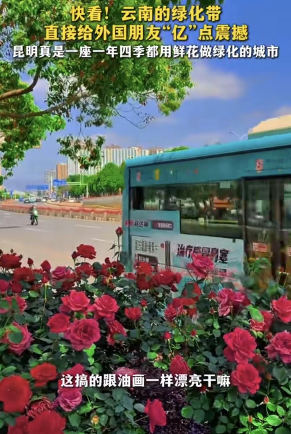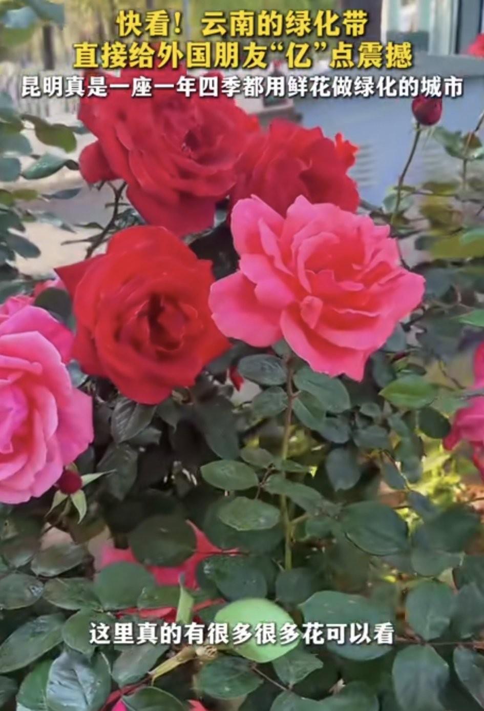昆明的绿化带给老外带来亿点点震撼,直夸赞“路边巨大的玫瑰!” 看来他和我一样,傻傻分不清路边的玫瑰和月季,经常把这两个混为一谈。 昆明很多路边都有这种月季,开的非常好,有人说很考验个人素质,不过对很多昆明人来说,这些月季太常见了。
