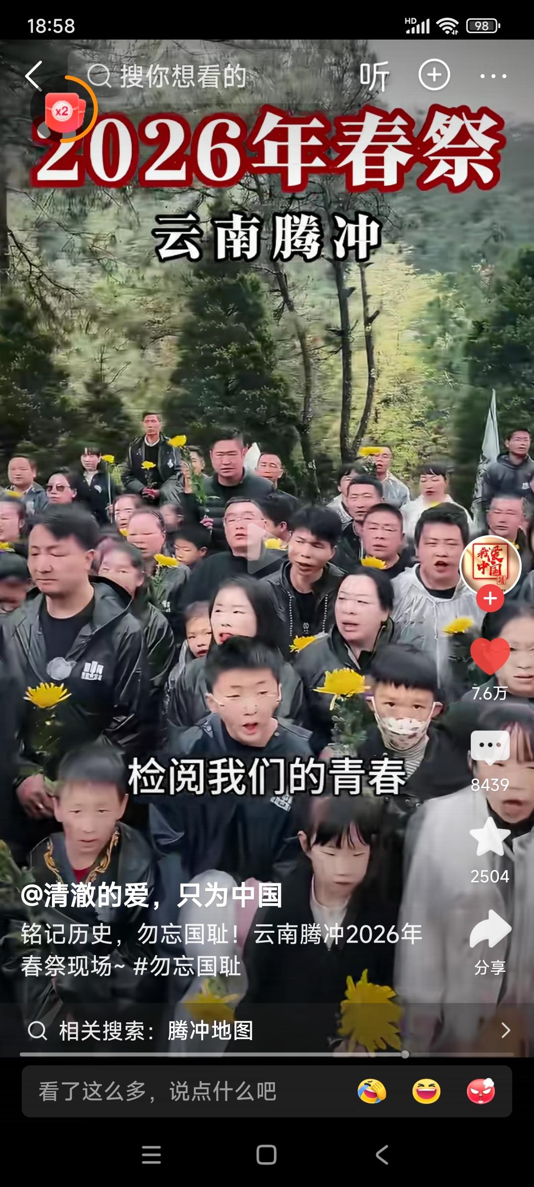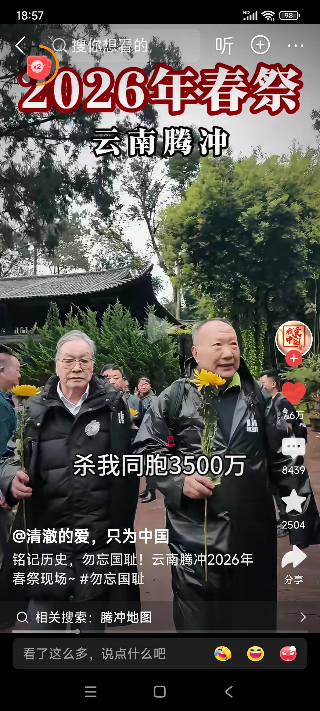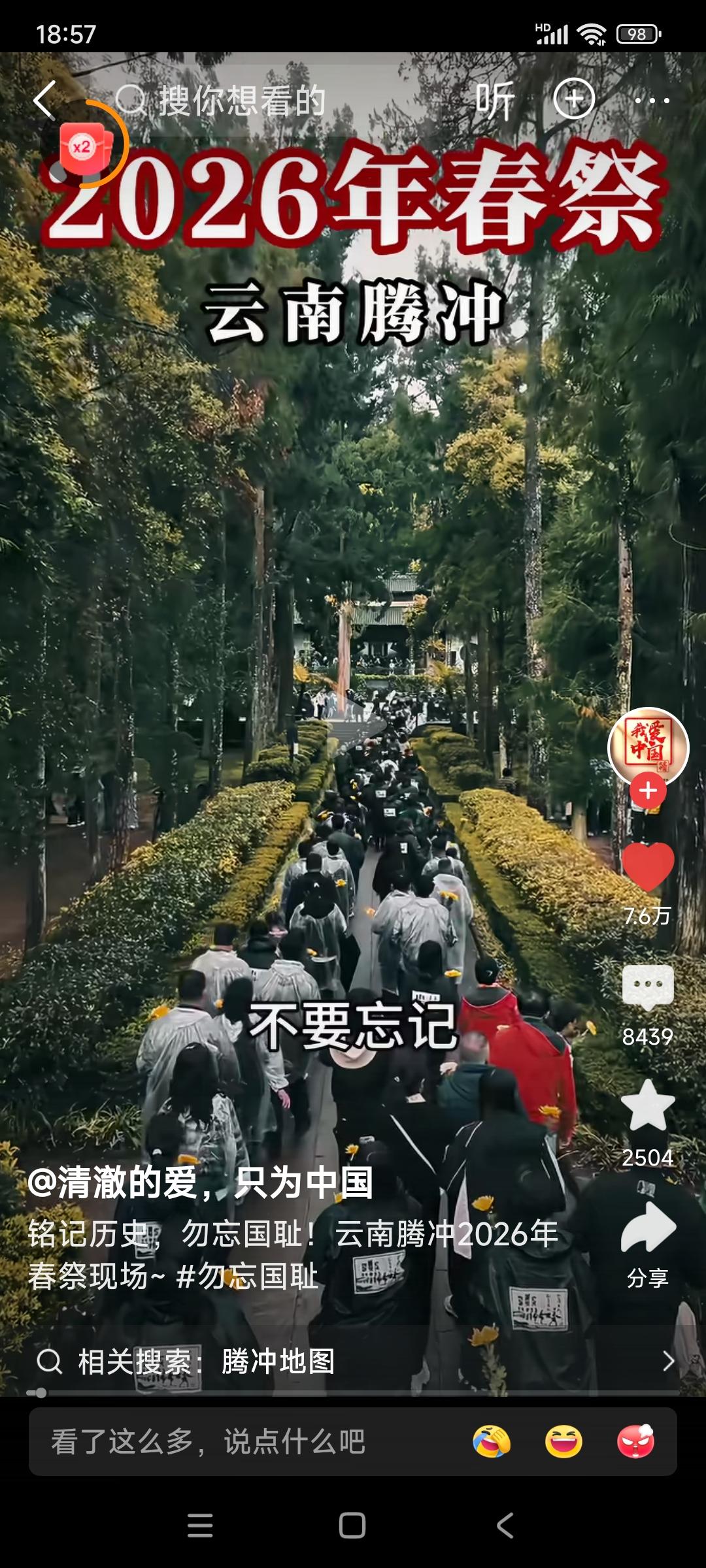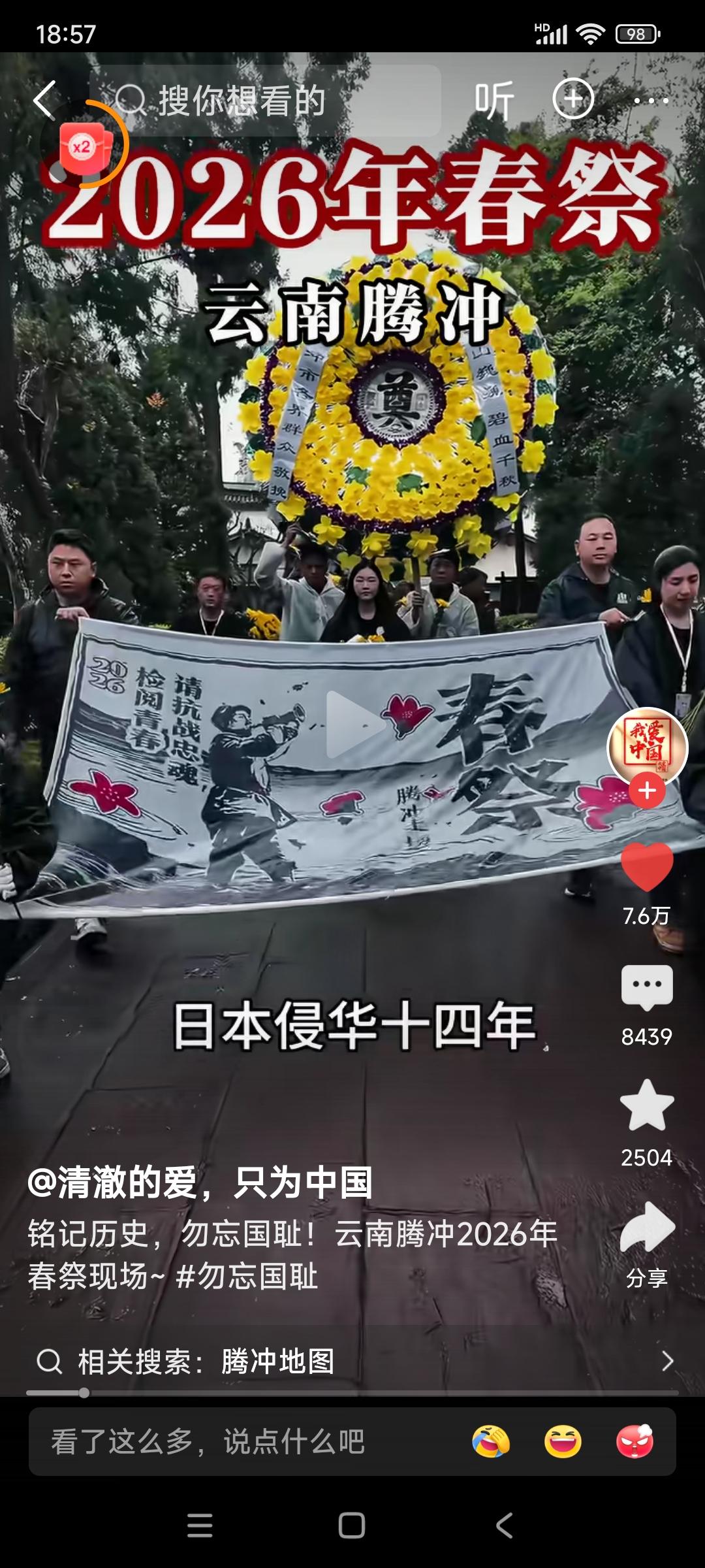 云南腾冲,2026年春祭。 民众高呼:不要忘记,日本侵华十四年,杀我同胞3500万!铭记历史,勿忘国耻!请抗战忠魂,检阅我们的青春! 我想问,日本人或国内的精日分子们,会不会又说我们是在搞反日教育? 我想说,不管别人怎么看怎么说,这样活动我们一定要一代一代的搞下去! 忘记历史就意味着背叛,还有可能让历史悲剧再次重演! 希望全国各地的教育机构,都能很好地利用清明节的时机,对我们的青年学生进行历史和爱国主义教育!