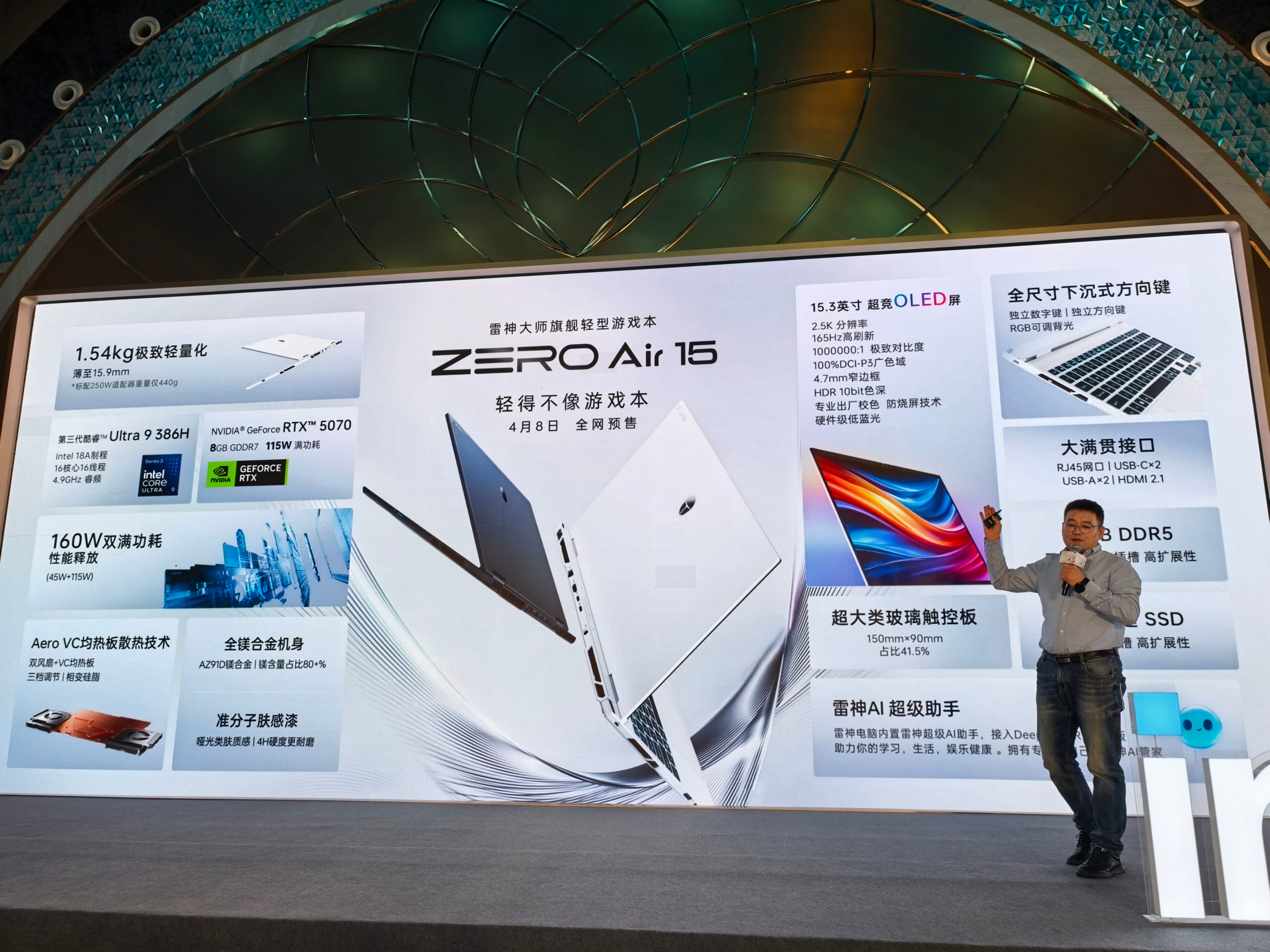 裸机重量仅有1.54公斤的高性能游戏笔记本!雷神在今天发布了ZERO Air 15游戏笔记本,主打极致轻薄,1.54公斤的重量和15.9mm的厚度里塞进了全新第三代酷睿Ultra 9 386H与英伟达GeForece RTX 5070,可以实现115W的GPU释放以及160W的整机释放。4月8日开启预售,大家觉得会要卖多少钱呢?