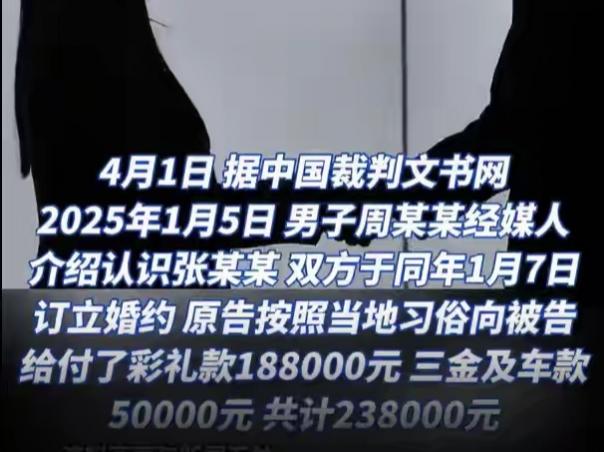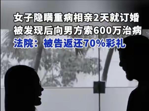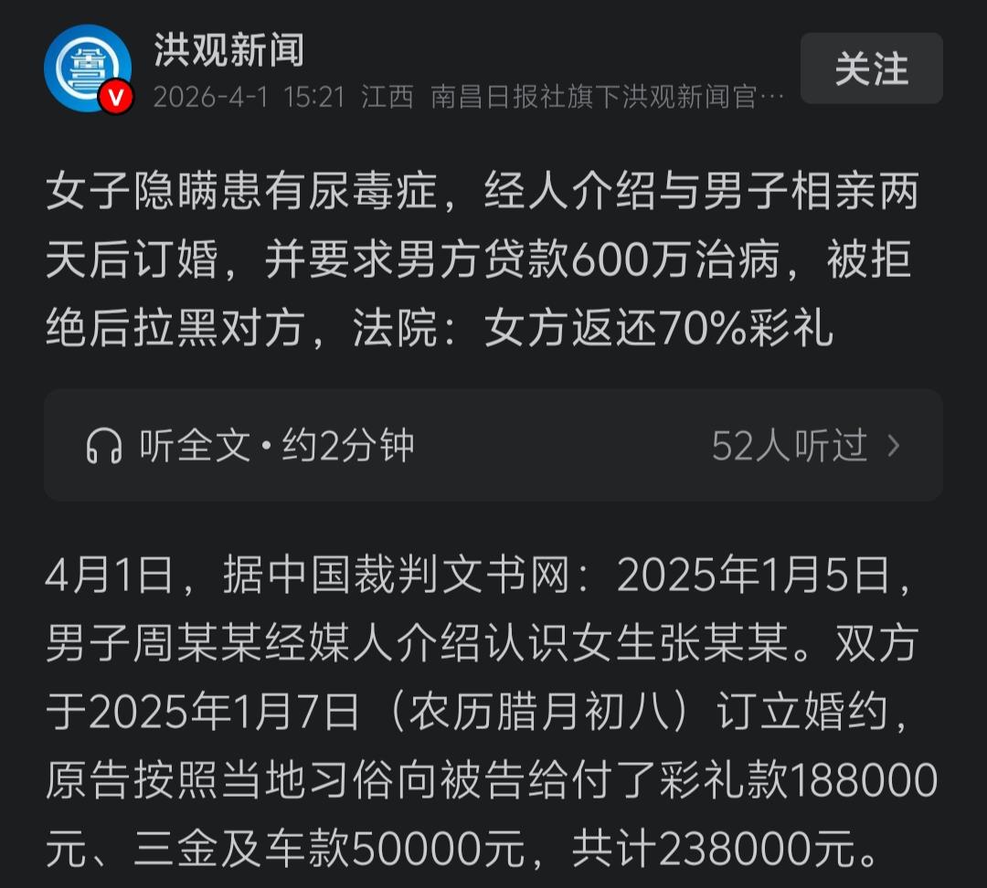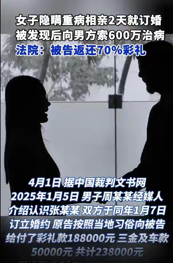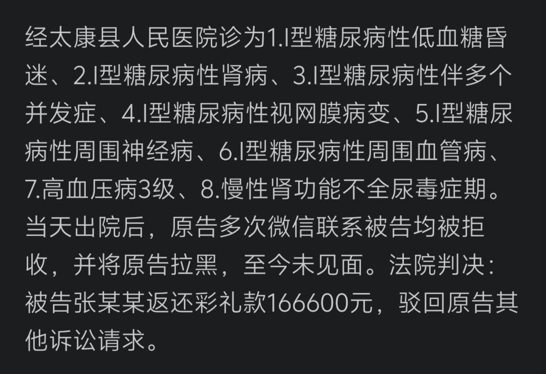 逆天操作!彩礼、三金、车款共23.8万,女子隐瞒尿毒症,相亲仅两天订婚。订婚后,要求男方贷款600万为其治病,遭拒后拉黑男方。 都说现在的男孩子找媳妇难,除了男女比例的基础原因外,“天价”彩礼、有房有车好工作等硬条件,也成了很多男孩子无法越过的门槛。 另外,现在的女生中,很多人受到一些外部因素的影响,导致对自己的定位出现偏差。 如此,现在的男孩子,想找一个媳妇,更是有点困难了。 不过就算是有车、有房还有个不错的工作,并且也能付得起彩礼,买得起三金和车子,找到的也可能不是媳妇,而是一大堆的麻烦! 河南周口太康县的男子小周,早已到了谈婚论嫁的年龄,但一直没能找到合适的女朋友。 去年1月5日,小周在媒人介绍下认识了女子小张,两人可谓是一见钟情,并于认识两天后的1月7日火速订婚。 订婚时,小周按当地风俗及双方约定,付给小张23.8万元,其中彩礼18.8万元,三金加车款5万。 随后,双方在没办理婚姻登记手续的情况下,举行了婚礼并生活到一起。 共同生活不久,小周发现小张在婚前对自己有所隐瞒,隐瞒了她早已患有尿毒症一事。而此时的小张,则要求小周贷款600万,用于给她治疗。 这一系列的操作下来,小周有些懵圈了!在经过一番思考后,他决定与小张好聚好散。 当年4月21日,小周找到小张,协商退还彩礼等事情,结果小张表示让他直接去起诉就行了。至于小周所说的好聚好散,小张表示“那是不可能的事”。 4月22日,小张因突然昏迷住院,并诊断出多种病情(详情见下图)。 22日当天,小张出院后,小周又多次与她联系,但都被小张拒绝,并将小周拉黑。 无奈之下,双方只能对簿公堂…… 后经法院判决,小张返还小周彩礼16.66万元,小周的其他诉求被驳回。 一场短暂的,甚至不能称为完整婚姻的婚姻就这么结束了。 对于小周,这场短暂的婚姻,无疑让他失望透顶、后悔不已。失去的彩礼也许不重要,但是那种被骗后的心理阴影,可能会让他在很长一段时间内,不会再去相信女生。 对于小张,很多人觉得她占了7万多元的便宜,但是她就一点没有失去什么吗? 注:网络信息来源“洪观新闻”2026年4月1日发布信息(见下图)。