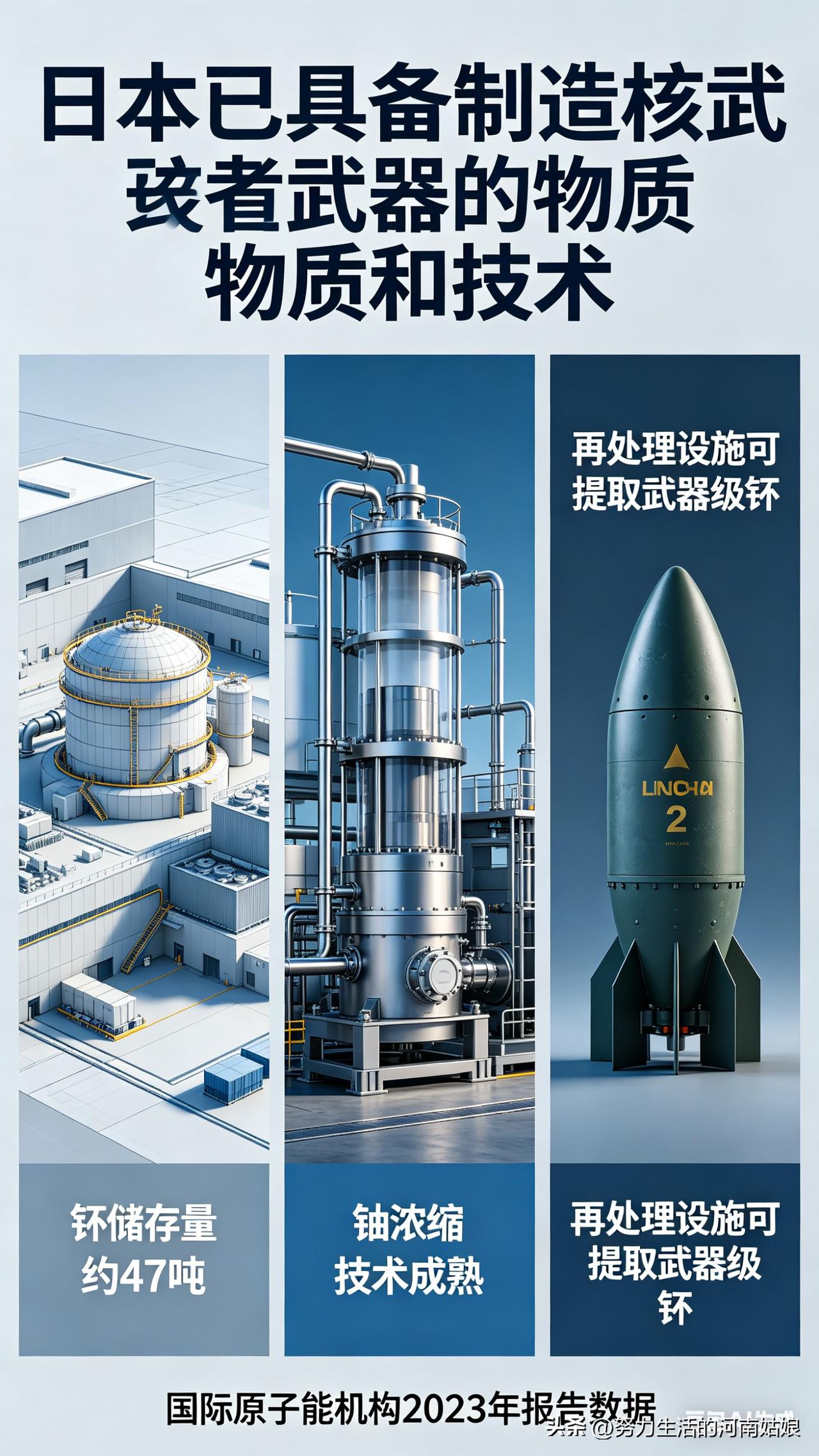 啥情况?日本离核弹就差“拍板”! 咱直接说大白话,别整那些虚的! 日本现在手里攥着的东西,真够吓人😳 几十吨钚堆在那儿,造原子弹的核心材料就跟买菜似的,随手抓一把都够。 技术更是没啥短板,火箭、精密制造全是一流的,想把核弹打出去,技术这块儿早准备好了。 别说啥“和平利用”,材料、技术全齐活了,真要造核弹,几个月就能出成品! 咱不危言耸听,但这事儿真得盯紧点,别哪天突然扔出个大新闻。 日本已具备制造核武器的物质和技术 日本核风险 全球安全 实话实说 图片由AI生成