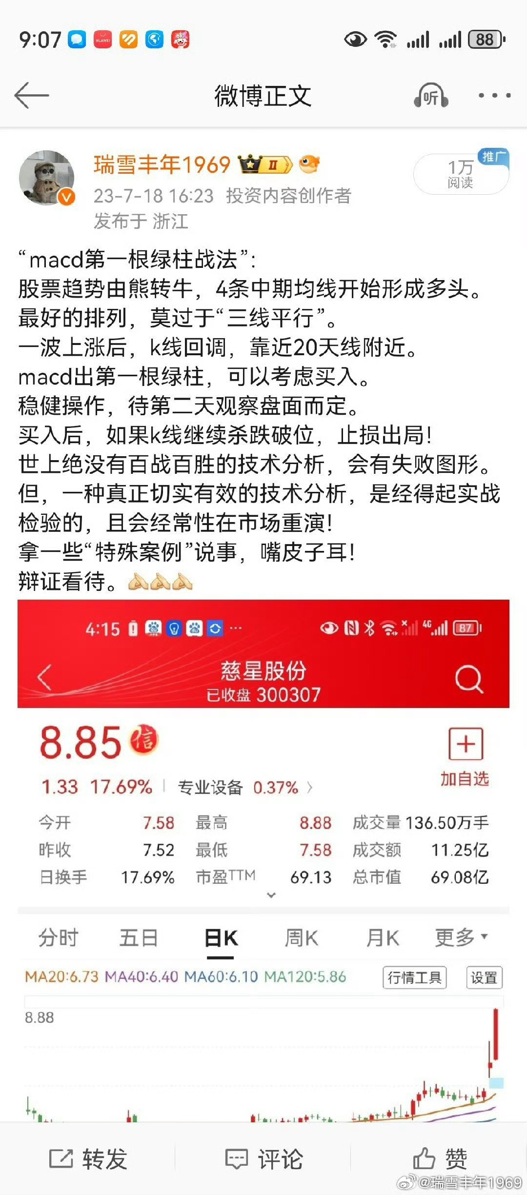 均线系统排列,经典k线组合,是大前提!请大家翻看最近的好股票,有多少股票,出现了我所说的“macd第一根绿柱战法”?个人技术口诀,均来自于实战总结。有兴趣的朋友,可以探讨。