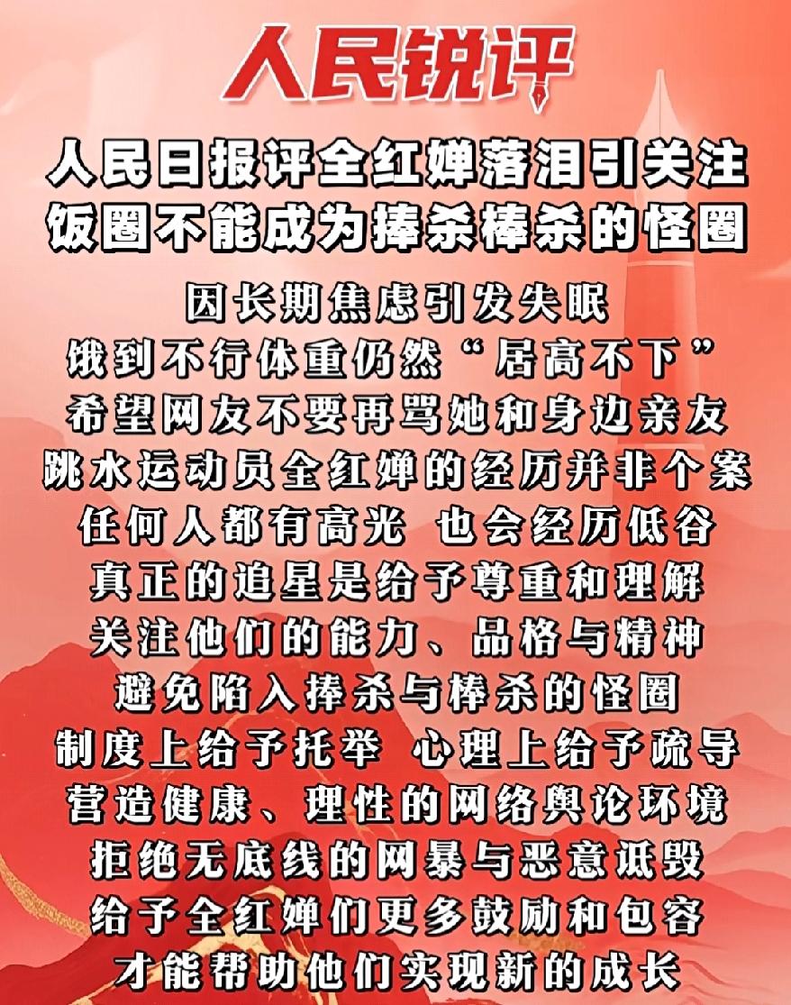 最近看到全红婵落泪的视频,感慨万千,心疼不已。 因为身体逐渐发胖而遭受了很多的非议和打击,包括家人,包括亲人都会受到了各种的非议。全红婵焦虑到严重失眠的状态。 每个人的人生都会有高光时刻,也有低谷时期,有几个人能在她这个年龄获得如此成就,她尽力就够了,不论跳不跳,不论选择如何,她已经足够优秀,没有超越她的,不具备指责她的资格! 我们需要包容每一位为国家付出的运动员,不管成绩如何,他们都付出了常人难以付出的努力,拼搏和汗水,值得尊敬!