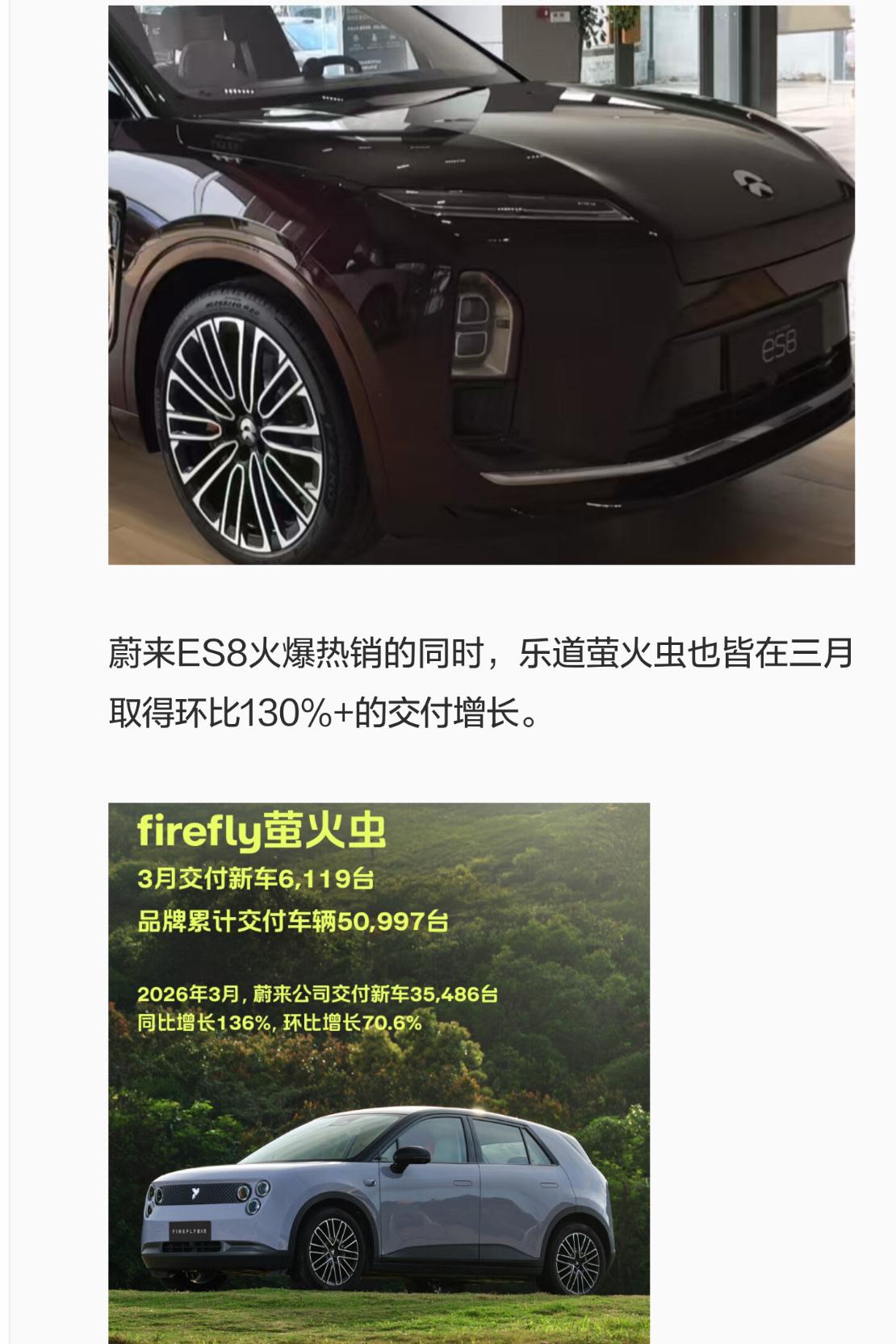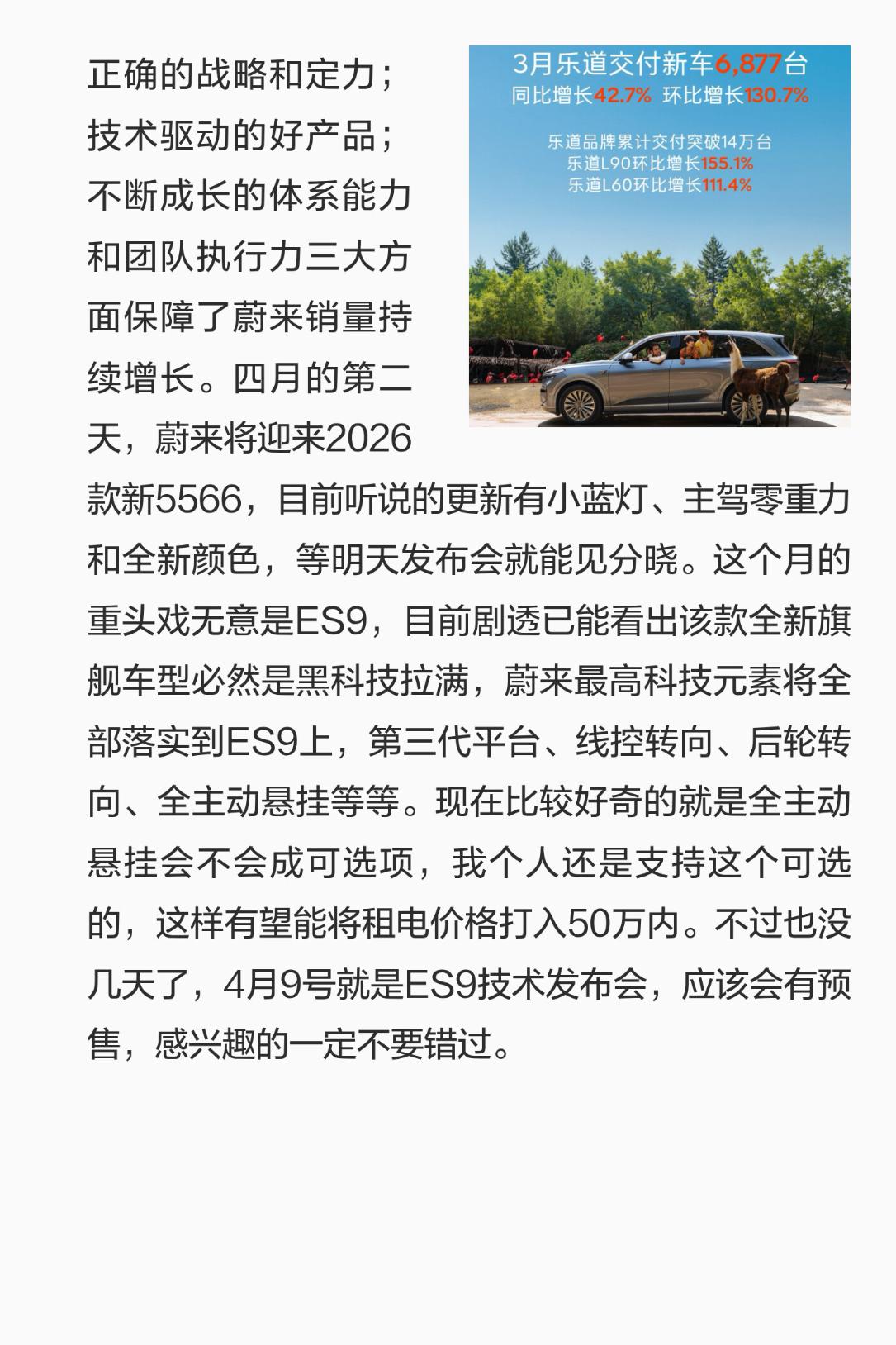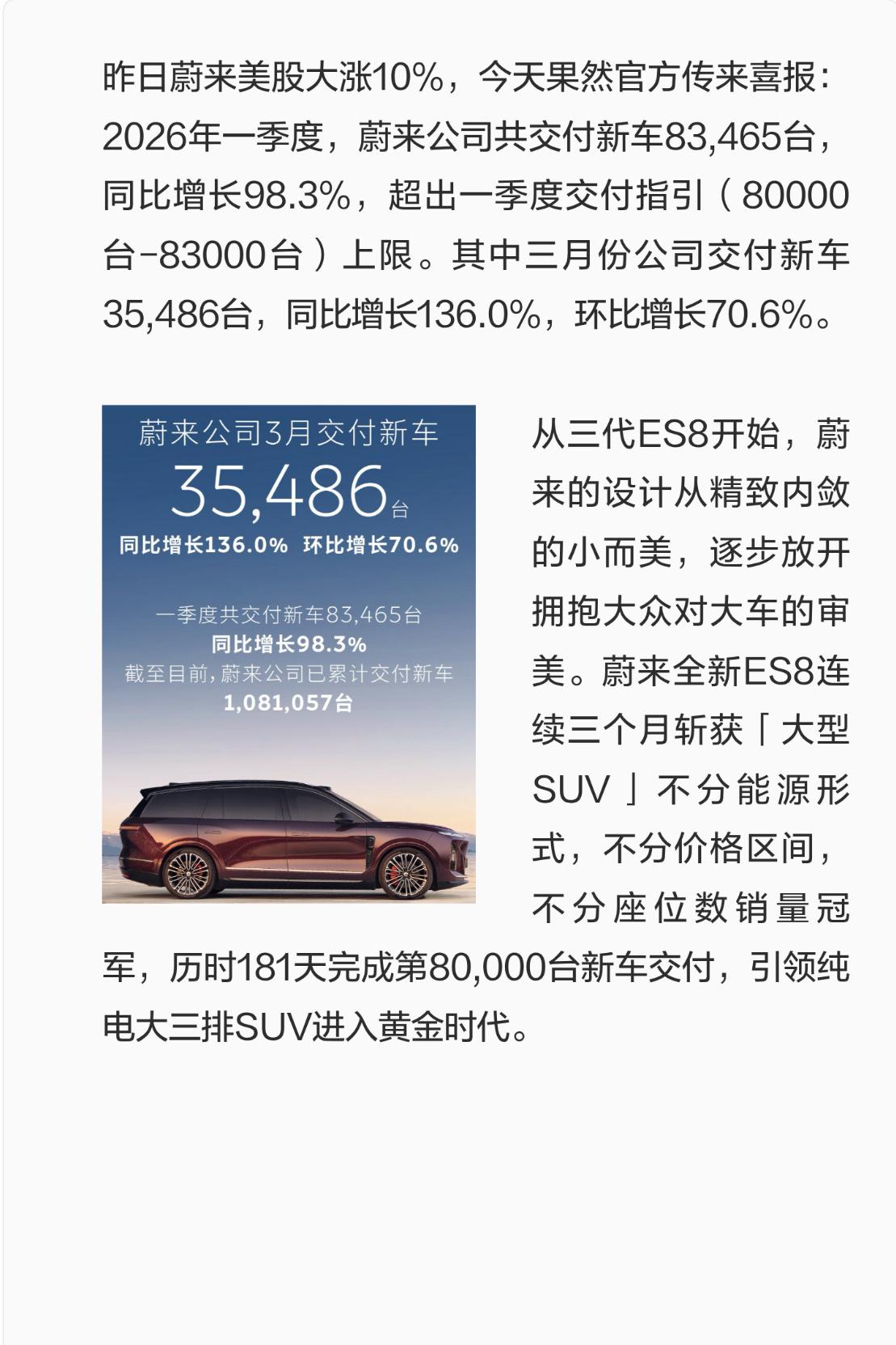 蔚来2026年一季度超交付指引上限 昨日蔚来美股大涨10%,今天果然官方传来喜报:2026年一季度,蔚来公司共交付新车83,465台,同比增长98.3%,超出一季度交付指引(80000台-83000台)上限。其中三月份公司交付新车35,486台,同比增长136.0%,环比增长70.6%。 从三代ES8开始,蔚来的设计从精致内敛的小而美,逐步放开拥抱大众对大车的审美。蔚来全新ES8连续三个月斩获「大型SUV」不分能源形式,不分价格区间,不分座位数销量冠军,历时181天完成第80,000台新车交付,引领纯电大三排SUV进入黄金时代。 蔚来ES8火爆热销的同时,乐道萤火虫也皆在三月取得环比130%+的交付增长。 正确的战略和定力;技术驱动的好产品;不断成长的体系能力和团队执行力三大方面保障了蔚来销量持续增长。 四月的第二天,蔚来将迎来2026款新5566,目前听说的更新有小蓝灯、主驾零重力和全新颜色,等明天发布会就能见分晓。这个月的重头戏无意是ES9,目前剧透已能看出该款全新旗舰车型必然是黑科技拉满,蔚来最高科技元素将全部落实到ES9上,第三代平台、线控转向、后轮转向、全主动悬挂等等。现在比较好奇的就是全主动悬挂会不会成可选项,我个人还是支持这个可选的,这样有望能将租电价格打入50万内。不过也没几天了,4月9号就是ES9技术发布会,应该会有预售,感兴趣的一定不要错过。