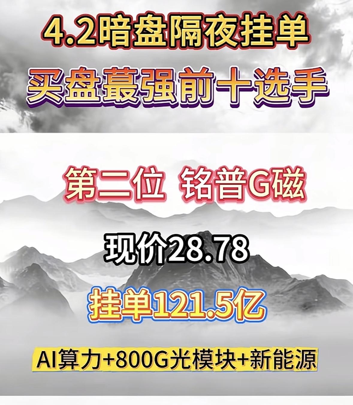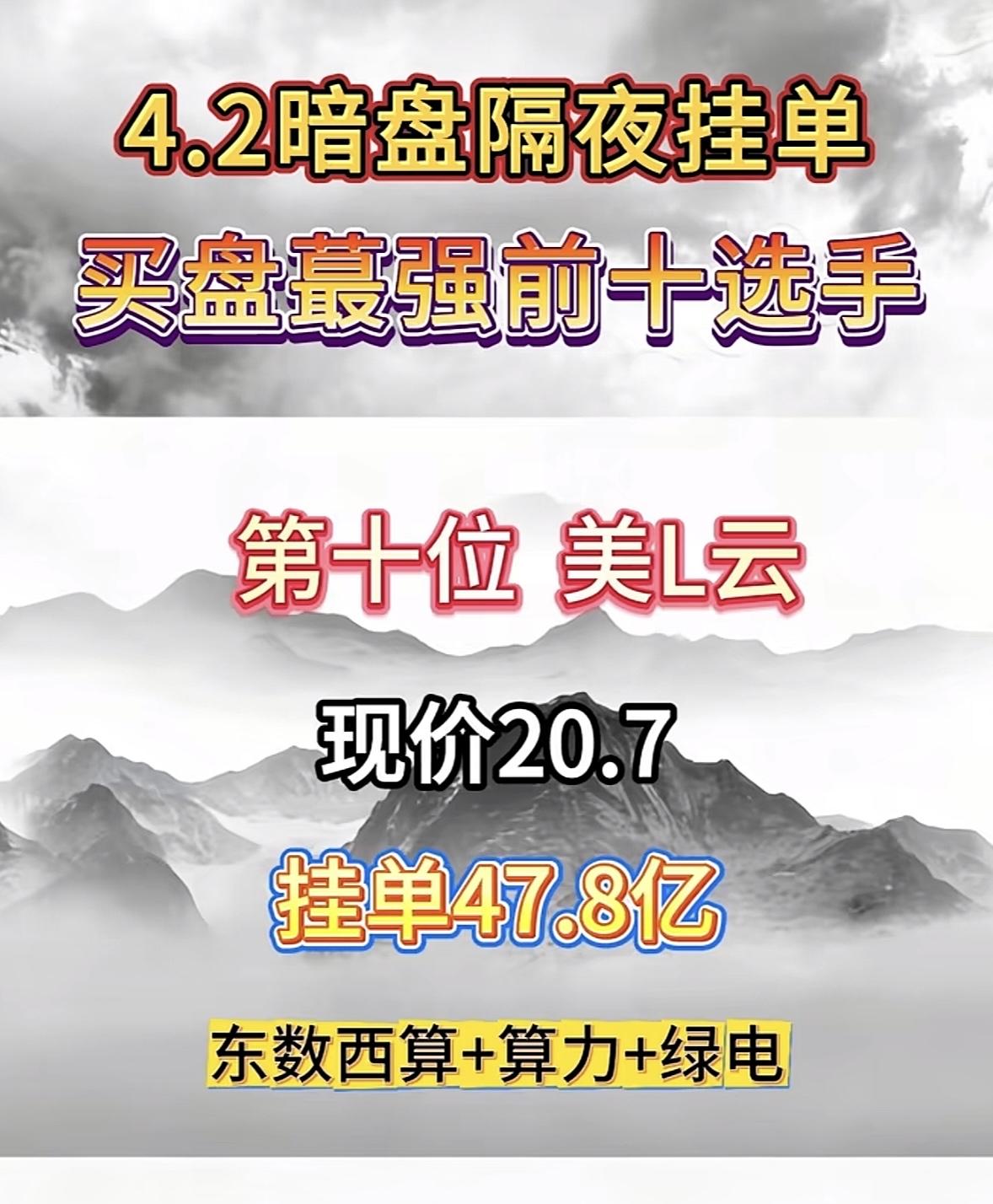 4.2暗盘隔夜挂单这事儿太刺激了! 美利云现价20.7,居然挂单47.8亿强势上榜。看看它的历史数据,之前价格波动也不小。2026年3月2日收盘价14.40,还跌了4.00%。3月13日股价16.96,跌了9.98%。这起伏就像坐过山车。这么大的挂单量,肯定会引起市场的高度关注。说不定会有大行情,是机会也是挑战。对于股民来说,这是一场考验,得密切盯着,看看后续到底是一飞冲天,还是另有变数。