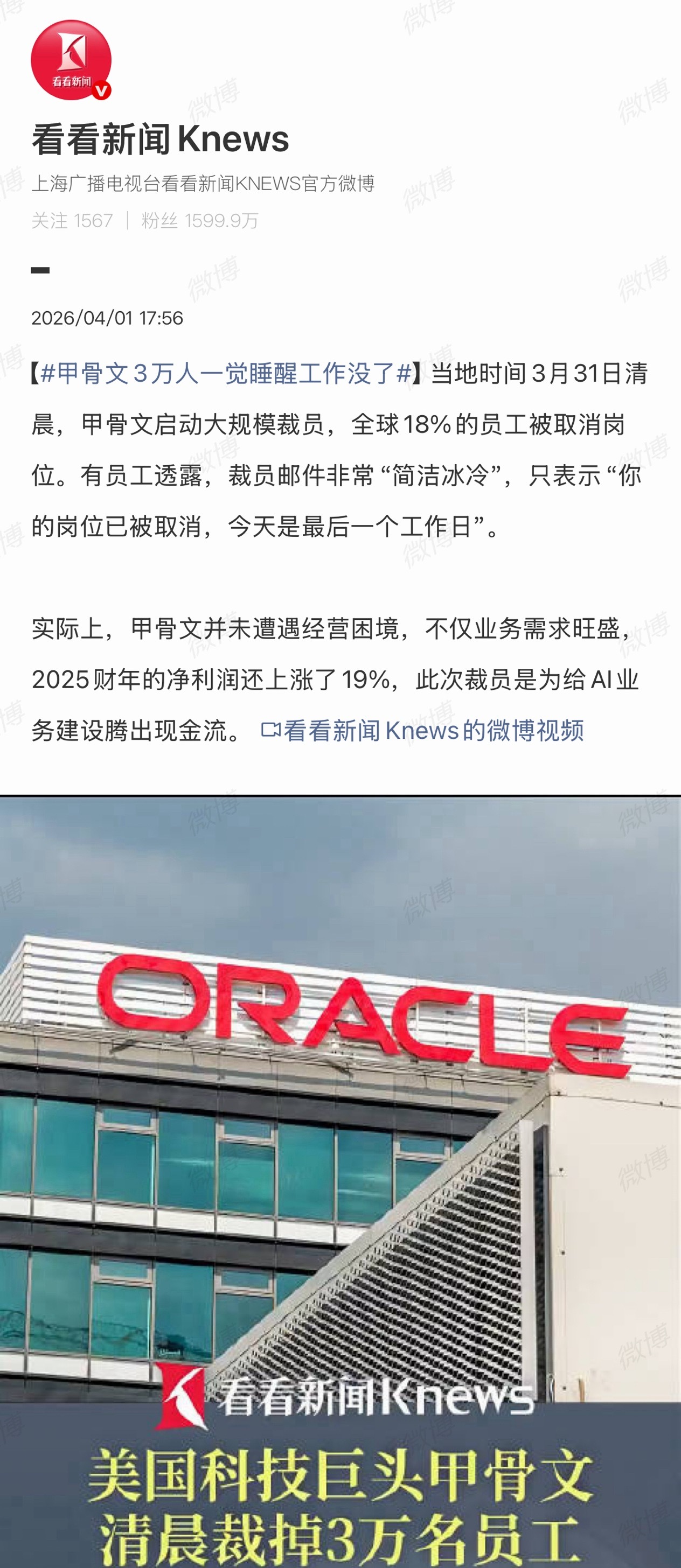 甲骨文3万人一觉睡醒工作没了卖人力,换算力。这会是接下来无数公司的选择。