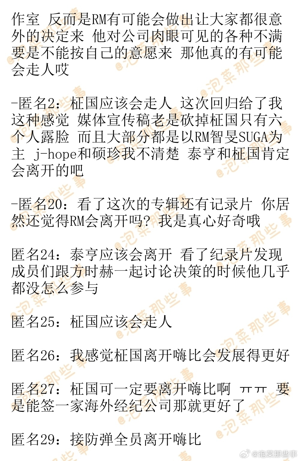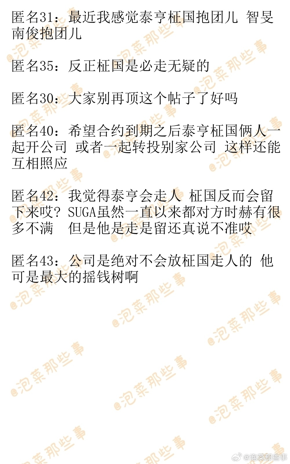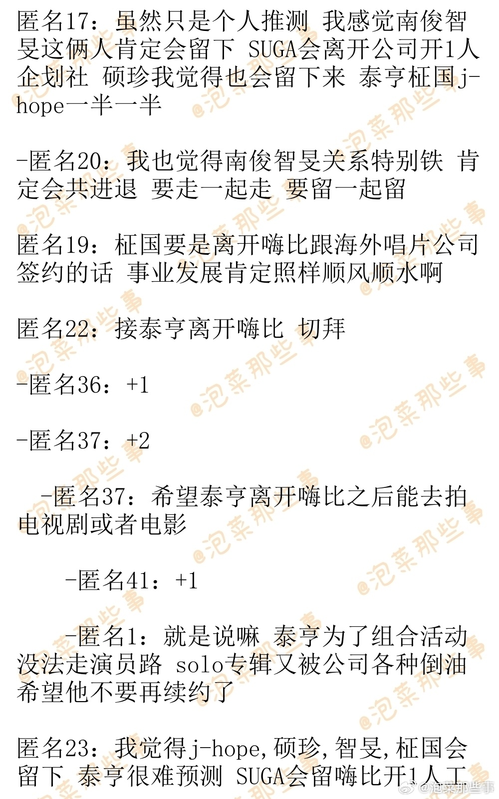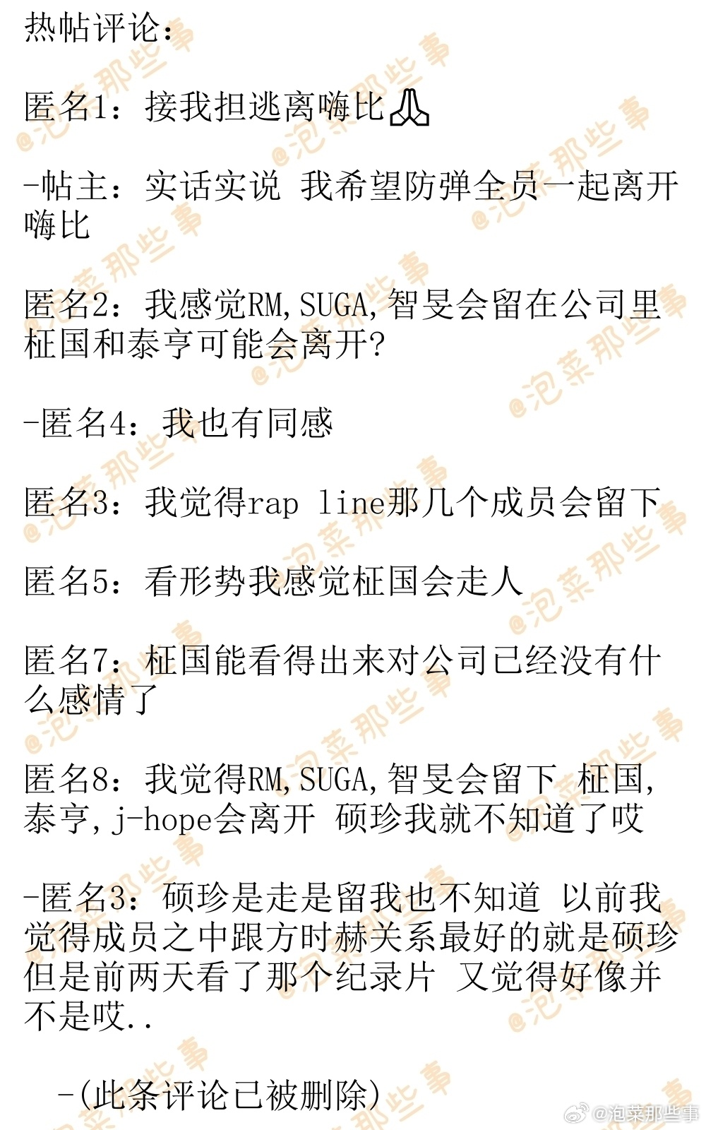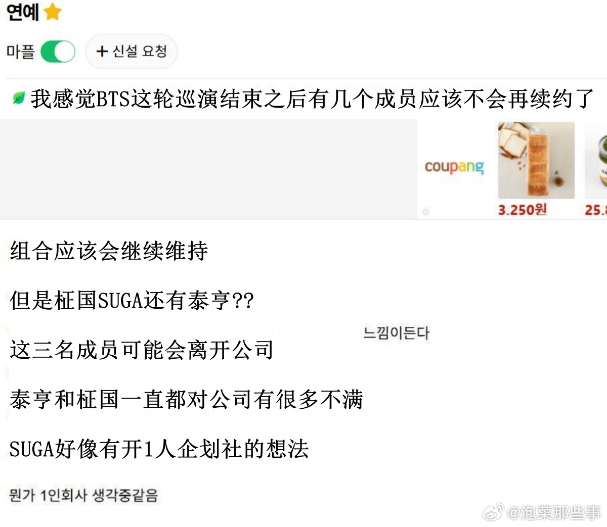 🔥韩网热帖评论翻译🔥我感觉BTS这轮巡演结束之后有几个成员应该不会再续约了韩网原帖帖主称:我感觉BTS这轮巡演结束之后有几个成员应该不会再续约了 组合应该会继续维持 但是柾国SUGA还有泰亨?? 这三名成员可能会离开公司 泰亨和柾国一直都对公司有很多不满 SUGA好像有开1人企划社的想法 cr.instiz