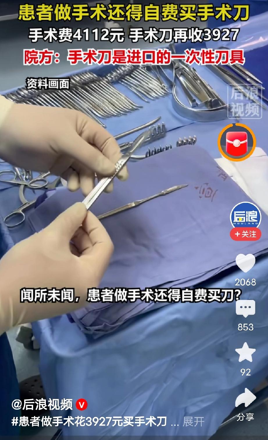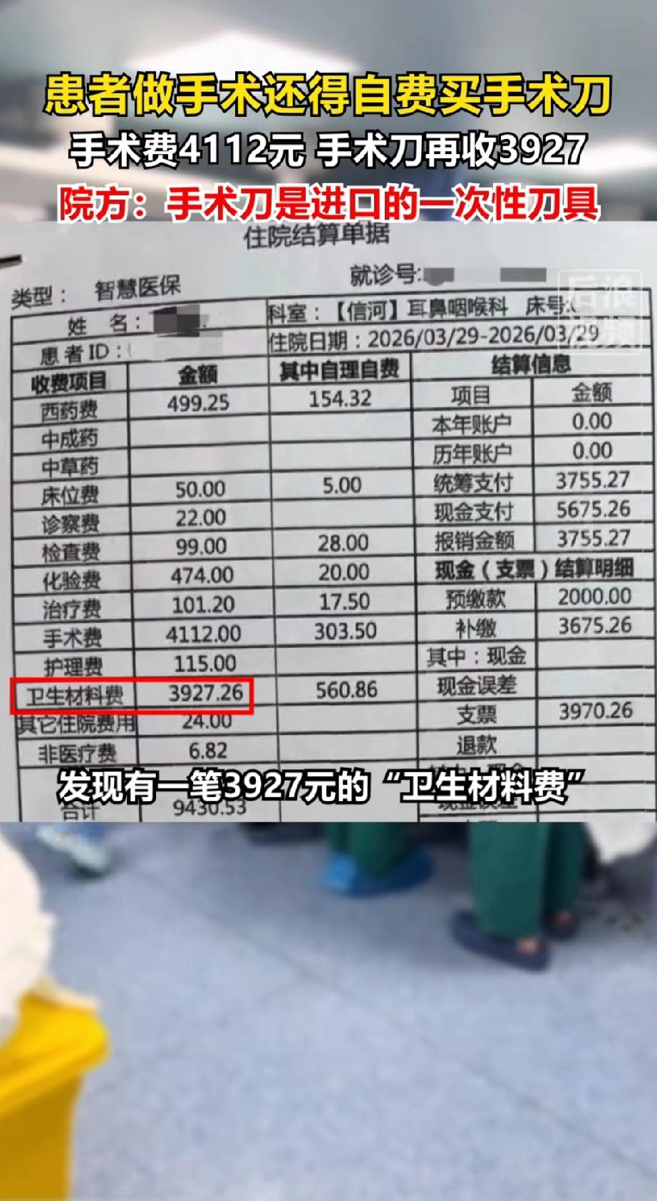 闻所未闻!浙江温州,男子生病做手术,结账时发现一笔高额费用3927元,标注为“卫生材料费”,他震惊不已,手术操作费才4112元,到底是什么样的卫生材料那么贵?可医生的解释让他们没法接受。 尹女士的儿子患有鼻炎,多年来经常鼻塞,睡眠质量也不是很好,经过医生检查,确诊为:阻塞性睡眠呼吸暂停综合征、慢性鼻炎。 检查结果出来后,医生建议他们可以通过手术矫正治疗。 因为这个病多年来一直困扰着尹女士的儿子,听到医生说可以手术治疗,经过家人商量后,他们最终决定听医生的建议,接受手术治疗。 手术定于3月29日当天,这是一个微创手术,只需要留院观察一天,第二天就可以出院了。 手术过程很顺利,30号那天,尹女士的儿子就可以出院了。 不料,就在她去给儿子办理出院手续时,一项费用引起了她的注意,卫生材料费:3927.26元。 一看到卫生材料,正常情况下,我们会立刻想到:纱布、棉球、一次性注册器、留置针等。 尹女士认为,这些通通加起来,满打满算也就几百块,怎么可能是3900多块,是不是收费员收错了,390多元她信,3900她没法接受。 再看看那手术操作费也就4112元,怎么可能卫生材料费,几乎跟手术费一样了,说不过去啊。 为了搞清楚这个费用的真实情况,尹女士当即转回头问收费员,可对方明确跟她表示,费用就是3900多元,并没有收错她的。 尹女士不接受,又回去问主治医生,医生给尹女士的解释是给她儿子做手术的那把刀是进口的,费用比较贵,3927元并没有多收她的。 尹女士听完瞬间懵圈,长这么大,她还是第一次听说去医院做手术还要自己买刀的,那4112元又是什么费用,这不包含材料费吗? 而且在手术之前,医生并没有跟他们说这个事,半个字都没提,既然说是进口的,那么肯定也有国产的,进口和国产有什么不同,医生也从未告知。 手术做完了才出现这个费用,尹女士没法接受,也表示不理解,她认为自己应该有知情权和选择权。 尹女士越想越觉得憋屈,事后她找医院想要详细收费明细,可院方要么说不清楚,要么电话打不通,根本没人给她一个说法。 气不过的尹女士3月30日就把这件事发到了网上,还联系了媒体曝光。 这事很快就冲上了热搜,网友们纷纷吐槽医院“先斩后奏”的收费套路。当地相关部门第一时间介入调查,责令医院彻查整改。 截至目前,院方还没给出正式的公开回应,只是在内部处理相关问题。 而尹女士的诉求很明确:要么全额退还这笔3927.26元的耗材费,要么给一个合理的解释,她要为自己和所有患者守住就医的知情权和选择权。 那么尹女士有权要求退回这笔钱吗,从法律角度怎么说? 《民法典》第1219条规定,医务人员在诊疗活动中应当向患者说明病情和医疗措施。需要实施手术、特殊检查、特殊治疗的,医务人员应当及时向患者具体说明医疗风险、替代医疗方案等情况,并取得其明确同意;不能或者不宜向患者说明的,应当向患者的近亲属说明,并取得其明确同意。 医务人员没有尽到前款义务,造成患者损害的,医疗机构应当承担赔偿责任。 本案中,3927元的进口手术刀属于高额医用耗材,医院术前完全没有告知费用、没有说明有国产替代选项,更没有取得尹女士一家的明确同意,属于明显违反法律规定。 医院的做法侵犯了患者的知情权和选择权,这笔费用是在没有告知的情况下产生的,尹女士完全有权利要求医院全额退还,医院存在明显过错,必须承担相应责任,不能用术后才说的方式让患者被动买单。 对于这个事件,大家怎么看呢?