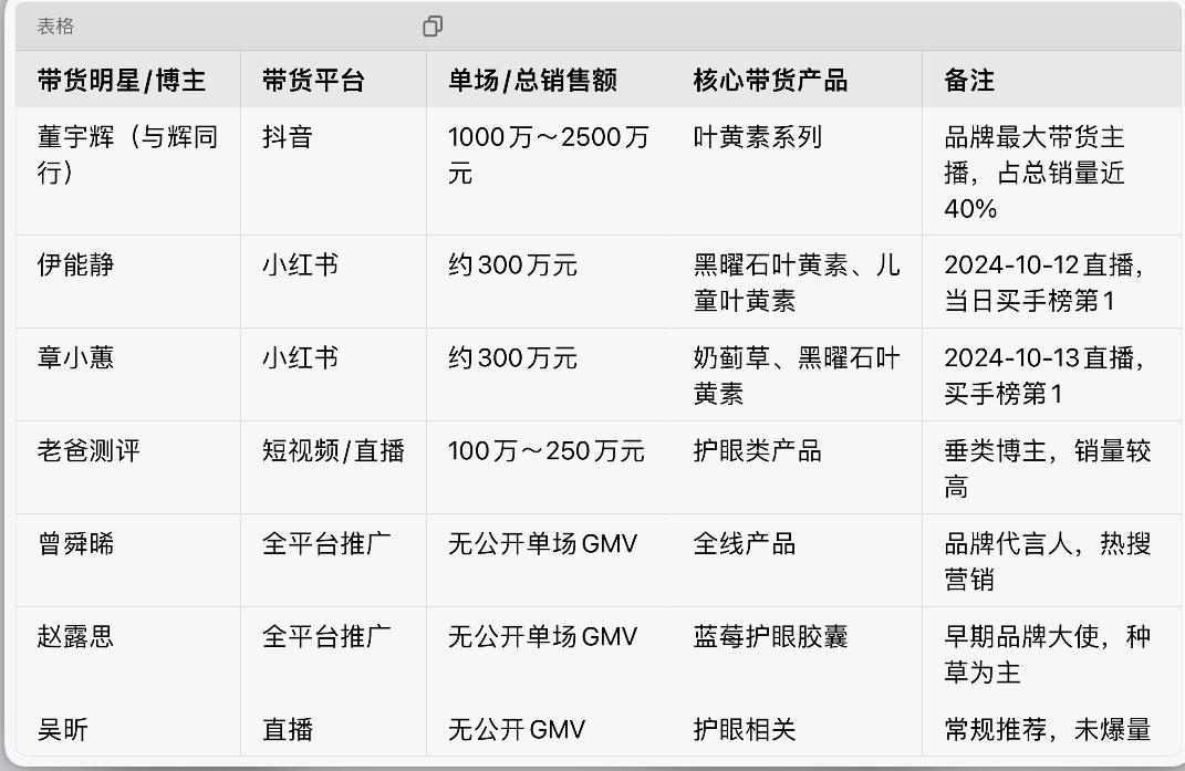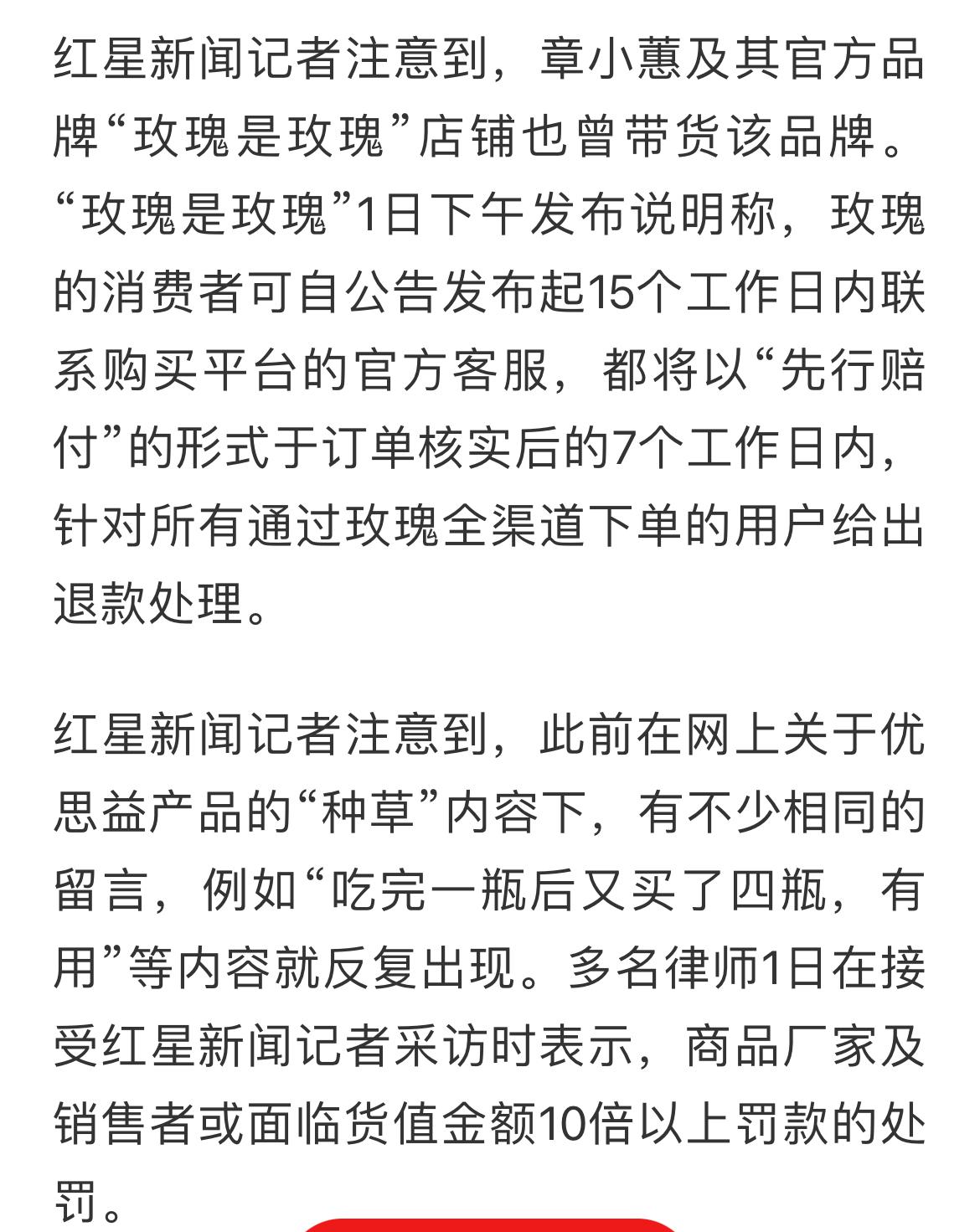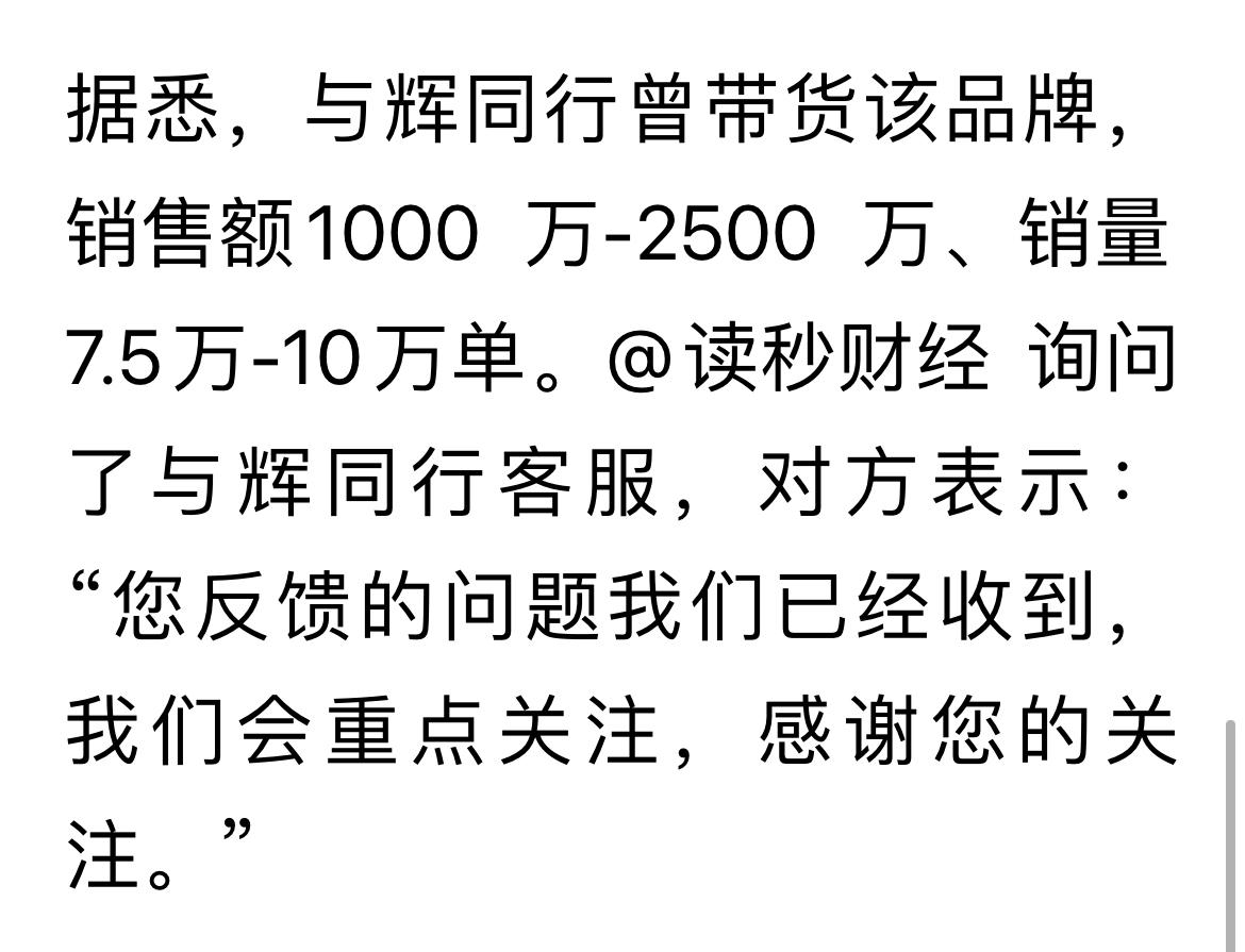 优思益带货量前三: 与辉同行,销售额1-2.5千万 伊能静,销售额0.3千万 章小惠,销售额0.3千万 目前,章小惠及其店铺声明:购买该产品的可在15日内联系客服,进行赔付! 伊能静社交账号开启免打扰,暂时没有回应。 与辉同行客服称,收到反馈,会重点关注!