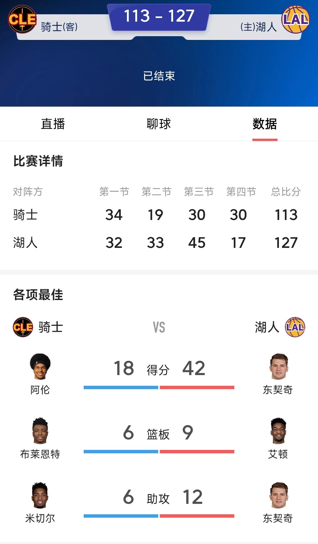 布朗尼喜提零分先生, 詹姆斯妥协只出手8次, 就是为了布朗尼的出场。 今天湖人第二节就换上布朗尼, 出场6分钟各项数据均为0, 已经连续出场了四场了, 老詹心满意足情愿退居二线。 不过布朗尼不能做出贡献, 东契奇不会再给他机会了。 现在老詹对于湖人已经无足轻重了, 东契奇率队大胜骑士, 老詹全场只得到14分, 雷迪克也不会多给布朗尼机会了。