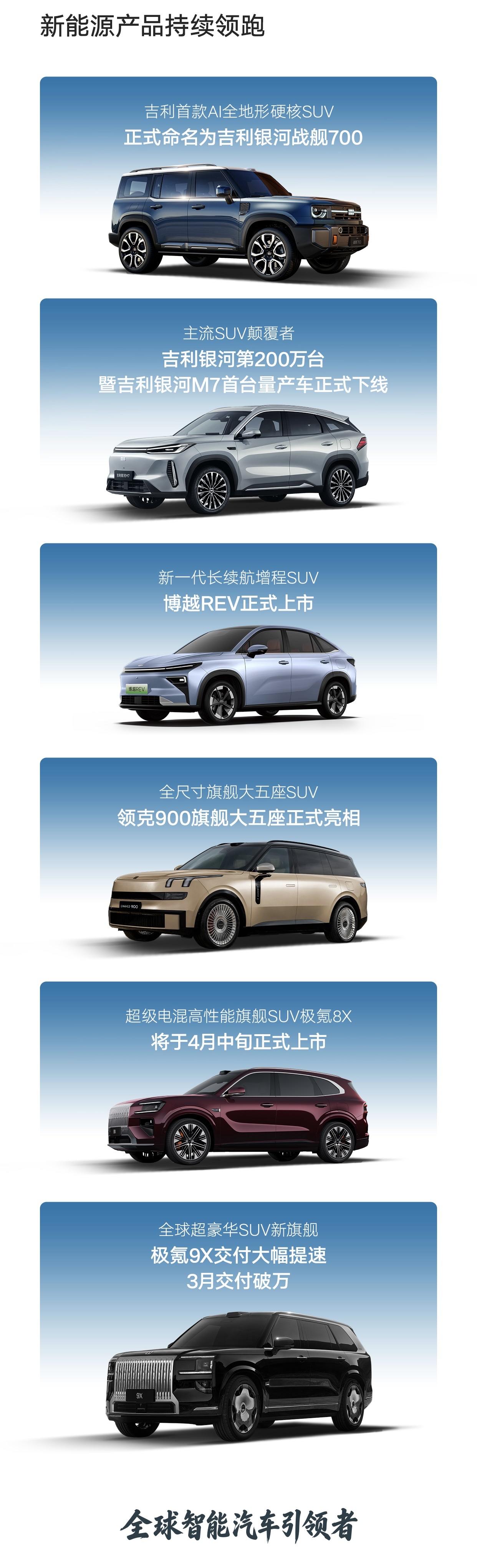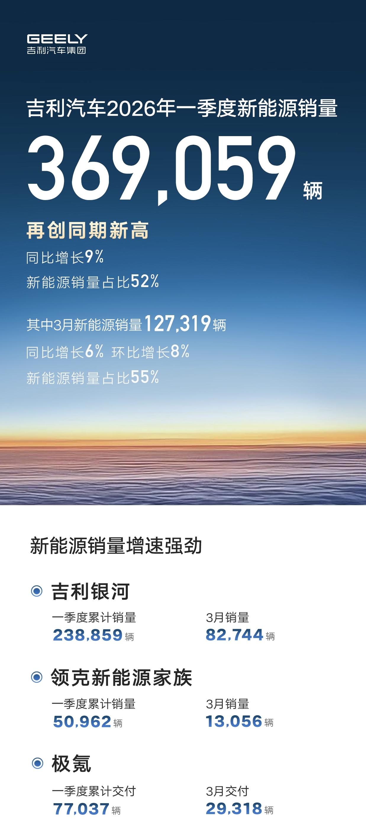 吉利汽车一季度勇夺中国品牌销量冠军! 一季度销量突破70.9万辆创同期新高,一季度新能源创新高、占比超过55%,3月出口销量超8万辆同样创新高! 吉利中国星、吉利银河、领克、极氪销量都可圈可点!