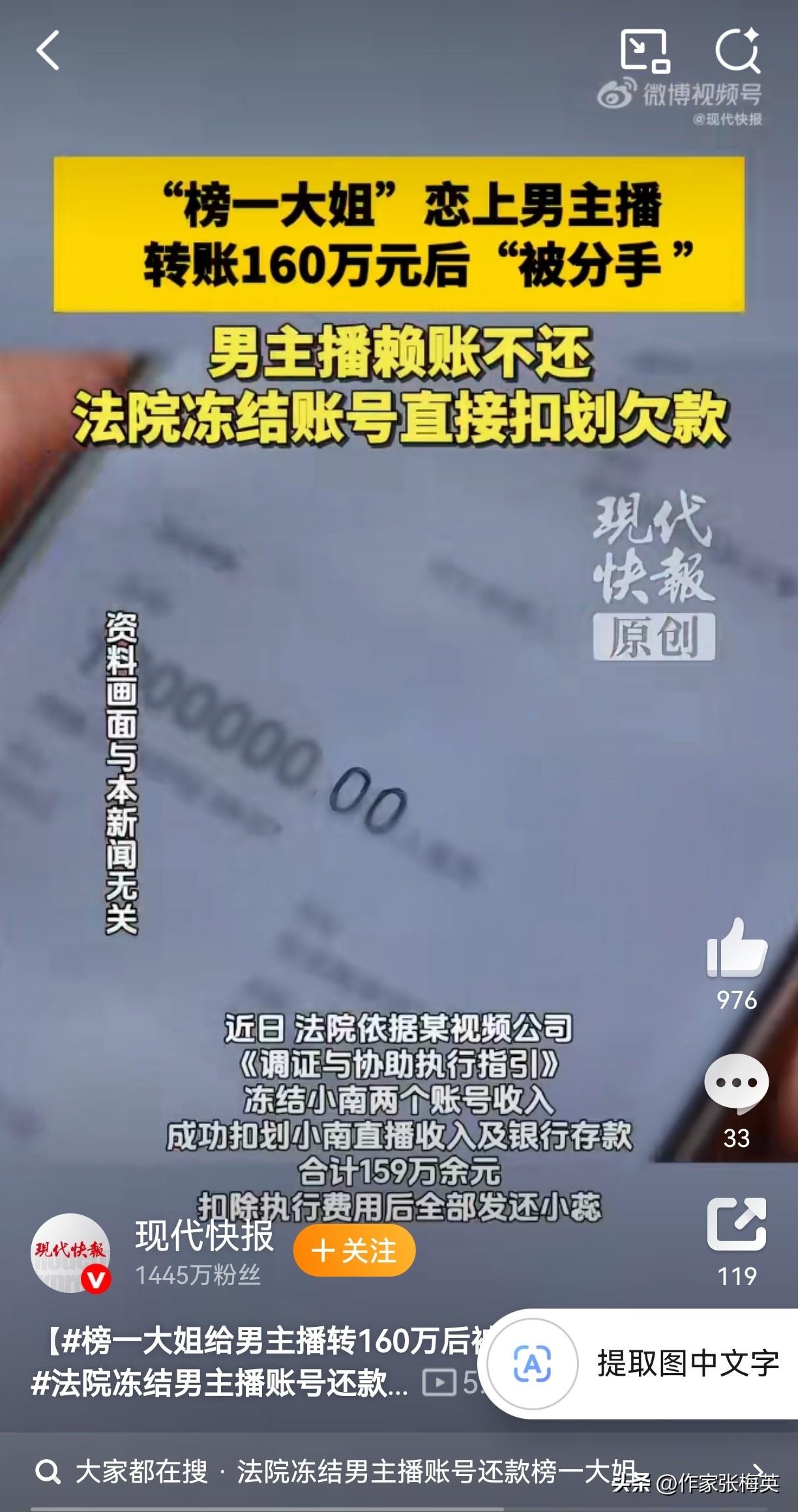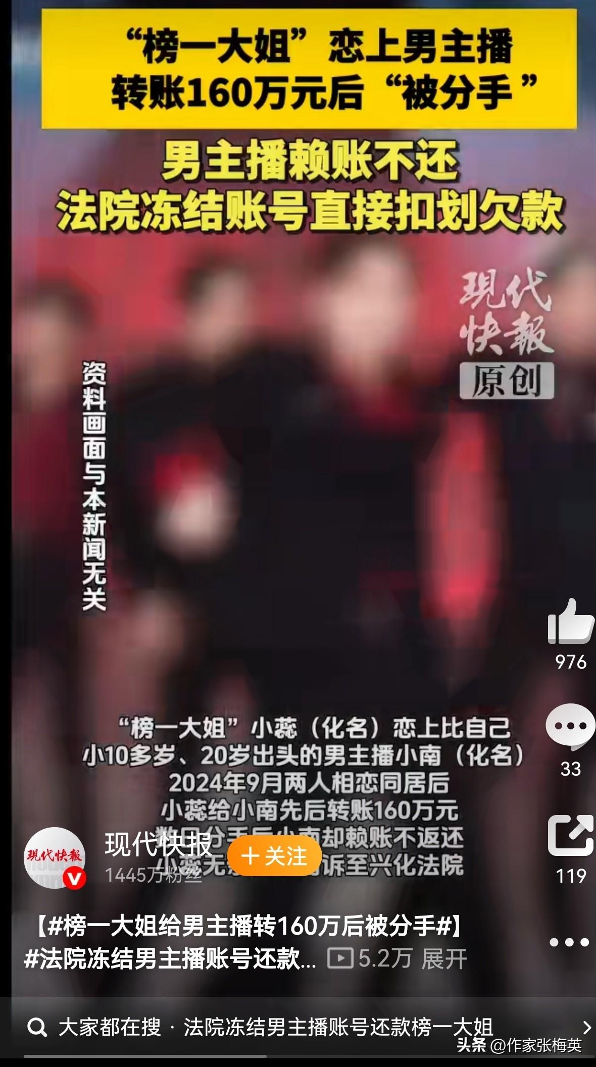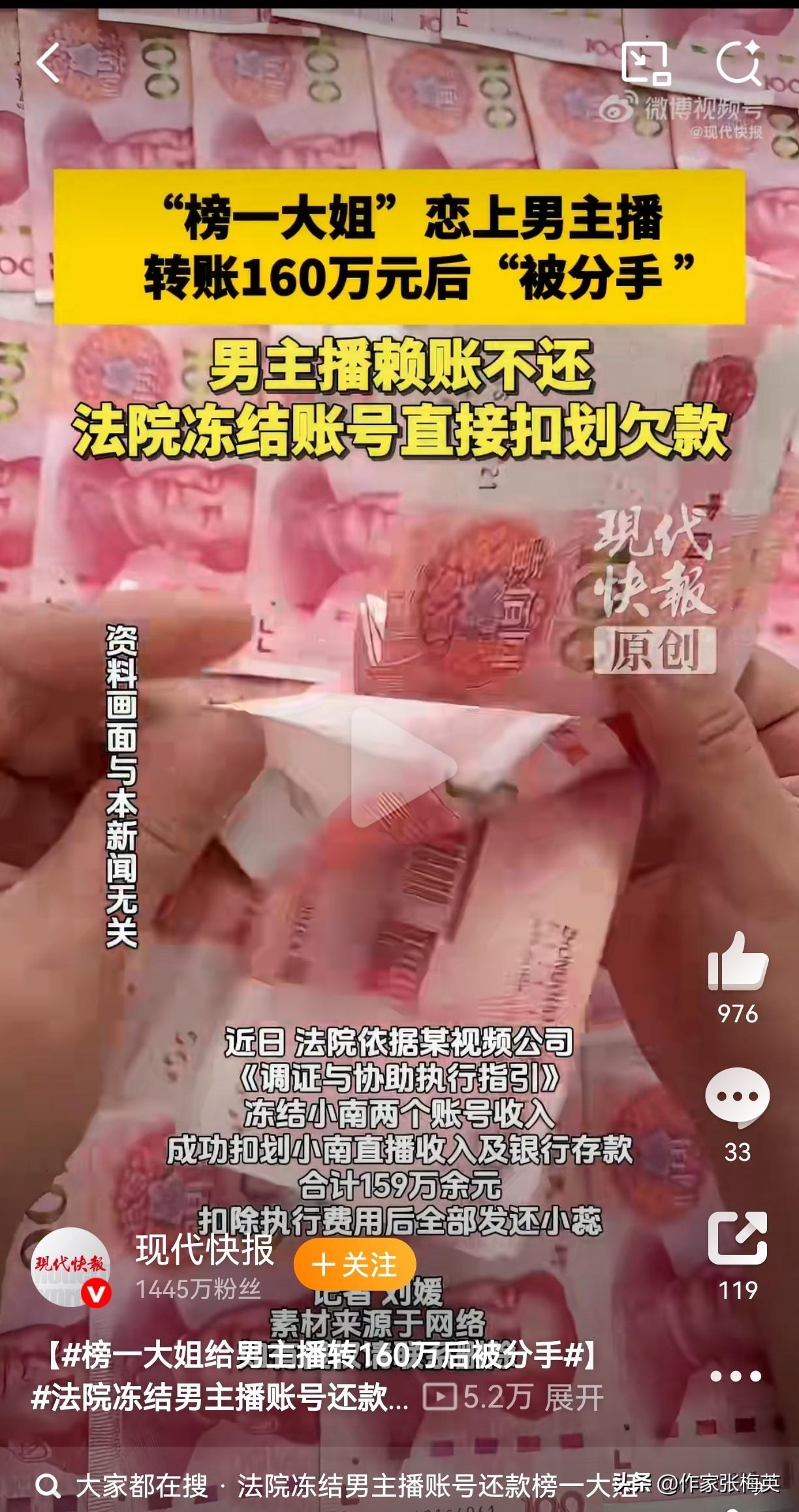 【榜一大姐狂砸160万养小奶狗,7天被甩后,法院出手:钱必须还!】 20岁帅气男主播小南,直播间风趣幽默,吸引了事业有成的"榜一大姐"小蕊。礼物刷着刷着,刷出了"爱情"——两人9月相恋同居,小2蕊先后转账100万+60万。 结果?短短数日,分手! 小南起初答应还钱,转头变卦"已买车",写欠条承诺2025年还清,到期直接玩消失😅 小蕊起诉胜诉后,法院执行时发现:小南竟用父亲身份注册账号继续直播赚钱!父亲出庭确认"账号是儿子的,收入归他",对冻结无异议。 最终法院扣划159万,小蕊拿回血汗钱。 --- 🔥网友神评: "这哪是谈恋爱,这是风投失败了" "榜一大姐的尽头是法院执行局" "七日爱情,百万学费" "父亲:儿子坑的钱别连累我账号😂" --- 💬短评:靠打赏维系的"仰慕"和靠转账维系的"爱情",本质都是交易。真正的爱情不会让你先打钱再谈感情,真正的体面也不是父亲账号能背的锅。 榜一大姐 男主播 恋爱诈骗 法院判决 别人欠你钱不还,怎么办?