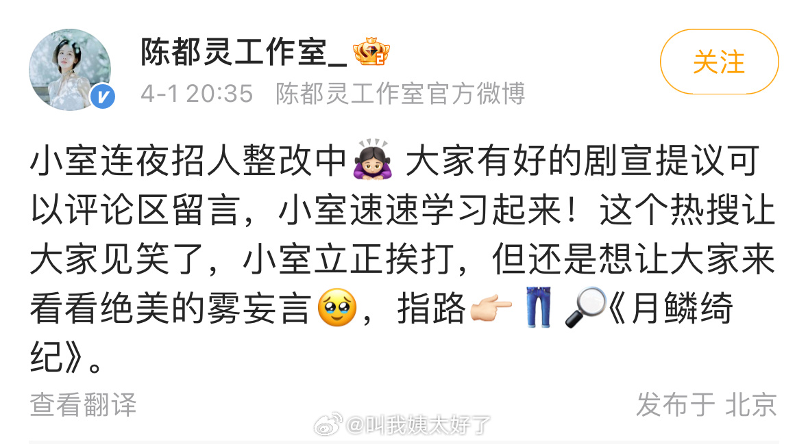 陈都灵工作室回应剧宣拉跨:正在招人整改中。