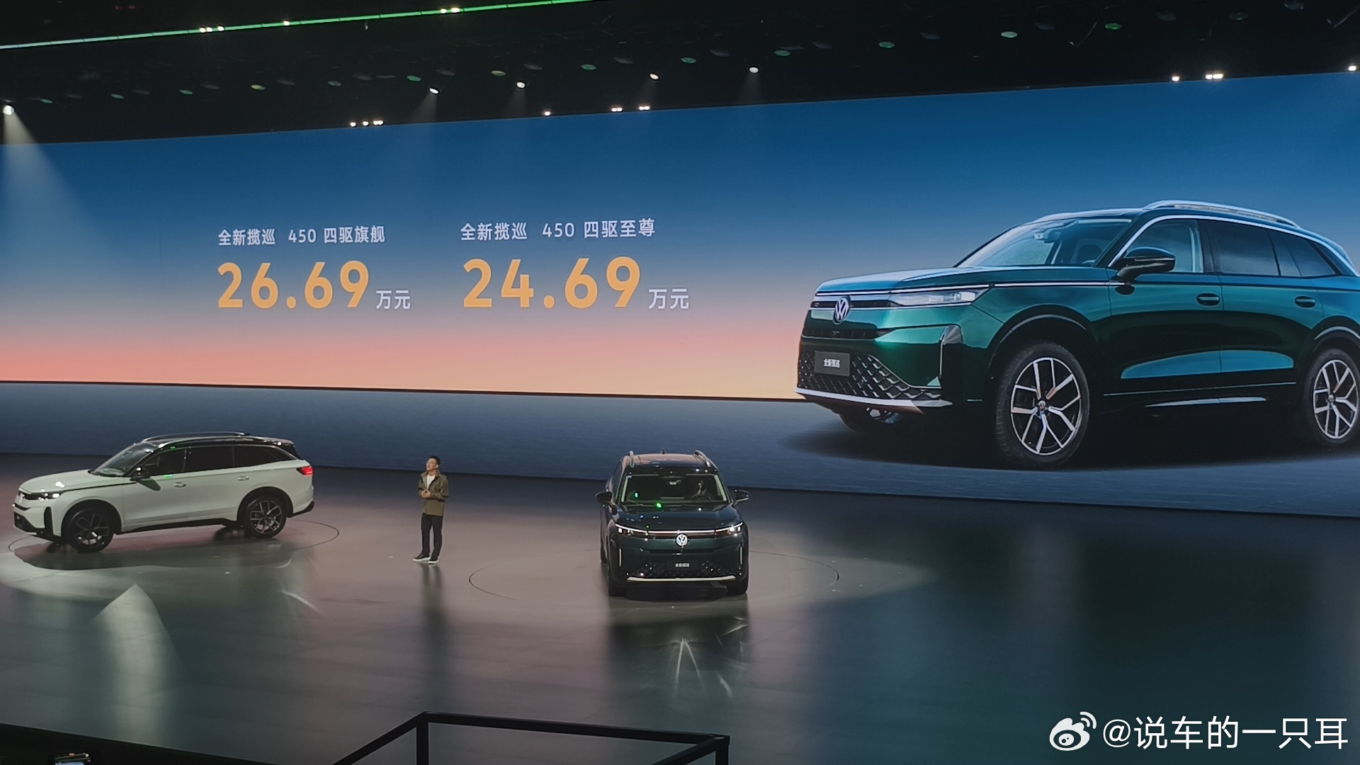 全新揽巡 450四驱旗舰版26.69万元 450四驱至尊版24.69万元搭载第五代EA888 2.0T发动机,百公里油耗8.6L;搭载端到端高速NOA,燃油车阵营断层领先;德系底盘调教+4Motion智能四驱系统;12项电动调节云感座椅,智感四连屏。