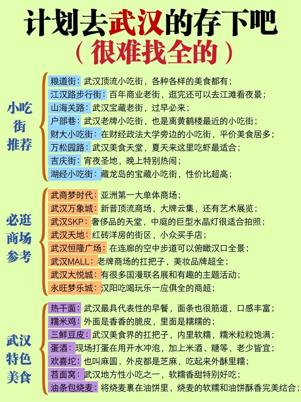 周末去哪儿 这个季节的武汉鸟语花香,真的很适合来旅游; 建议来之前,将想去的景点整理一下,在按秩序安排行程…… 📍要🐟约的景点 ✅湖北省博物馆✅湖北省美术馆 ✅湖北省科技馆✅武汉科技馆 ✅江汉关博物馆✅湖北地质博物馆 ✅武汉警察博物馆✅武汉水生生物博物馆 ✅武汉美术馆 📍小吃街指南 ✅粮道街✅江汉路步行街 ✅山海关路✅户部巷 ✅财大小吃街✅万松园路 ✅吉庆街✅湖经小吃街 武汉旅游武汉攻略武汉旅游攻略樱花武汉大学晴川阁武汉景点武汉美食黄鹤楼武汉旅行黄鹤楼攻略武汉樱花光谷空轨武汉美食热干面