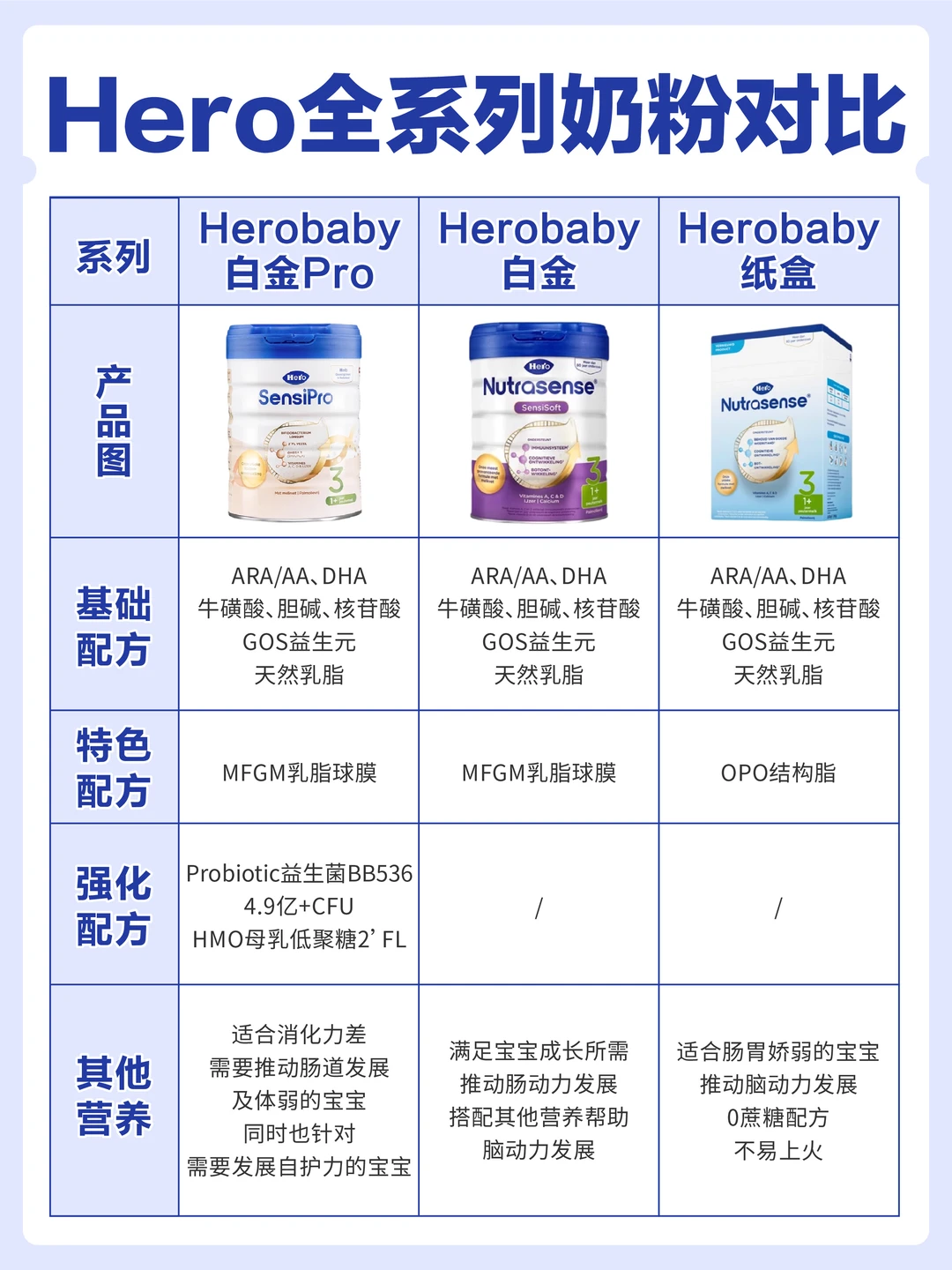 从Hero baby纸盒,后来配方升级出了Herobaby白金,在基础上添加了对自护力和认知力有帮助的乳脂球膜和DHA;最新推出的Herobaby白金Pro更是全新升级,三重核心成分营养更全面,直接闭眼给娃入了~