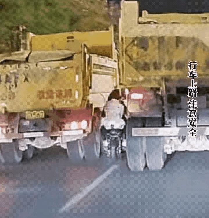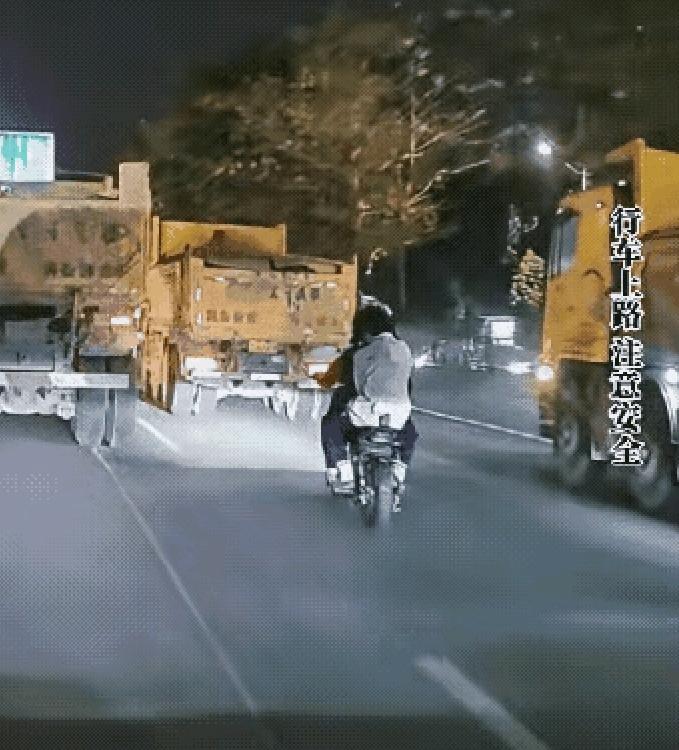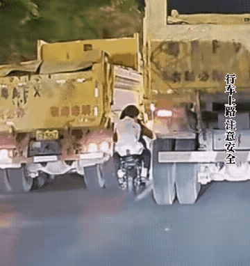 电动车钻大货车盲区 这一幕太吓人了 隔着屏幕都捏了一把汗 傍晚的车流里 电动车骑手直接钻进了两辆大货车的夹缝盲区 车头都快贴到货车轮胎了 他不知道大货车的盲区有多恐怖吗 一个起步、一个变道 就是灭顶之灾 骑手这波操作 完全是在死神手里抢命 生命只有一次 别拿自己的命赌司机能看见你 多少事故就是因为侥幸钻盲区 一定一定要远离大货车啊 安全出行