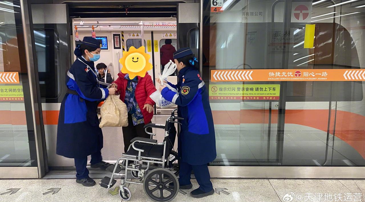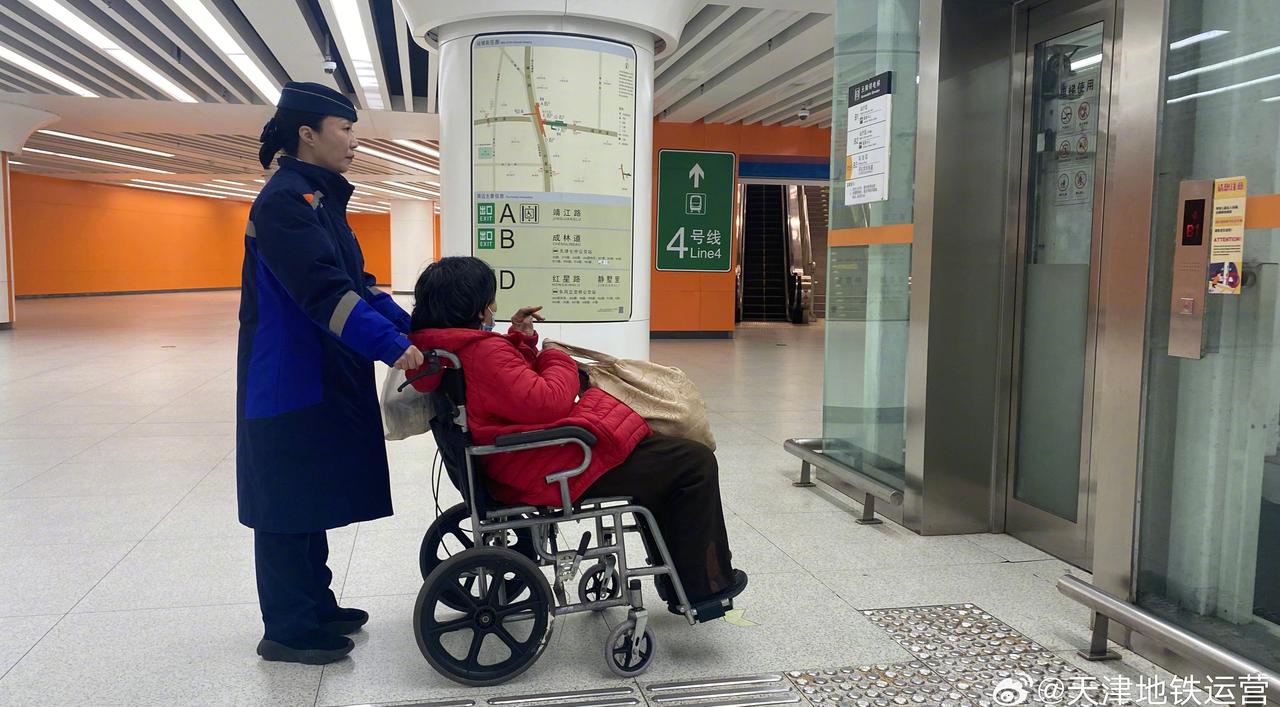 近日,天津地铁5号线成林道站接到靖江路电话,有一名乘客行动不便需要车站提供轮椅帮助,值班站长郑轶丹迅速携带轮椅到达站台等待,列车到站后帮助乘客下车出站,乘客对车站工作人员表示感谢!