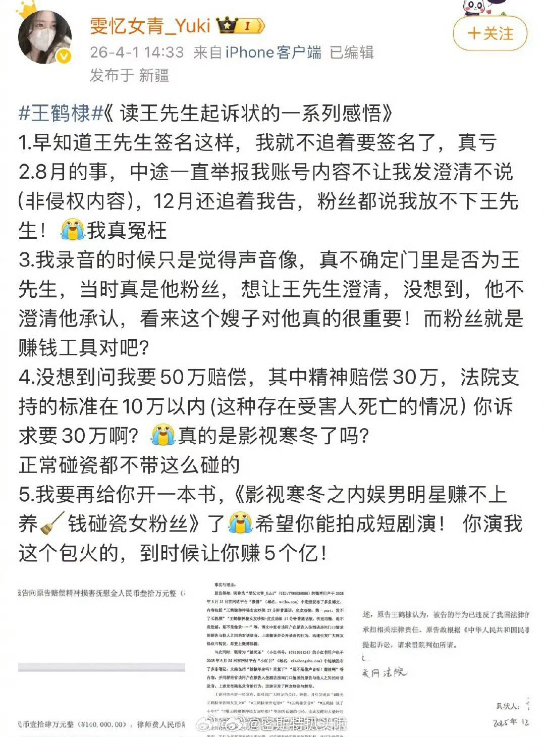王鹤棣给上次在酒店房间门口录音的私生发了传票,索赔50万 私生发长文回应了 曝光王鹤棣录音私生被索赔50万