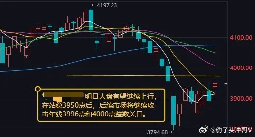 大盘已经探明了短期的低点,从3月23日到今天的8个交易日,完成了3955点下方缺口的回补,构筑了一个短期上攻形态,回调已经基本结束。明日大盘有望继续上行,在站稳3950点后,后续市场将继续攻击年线3996点和4000点整数关口。
