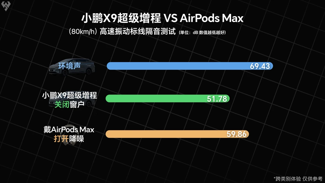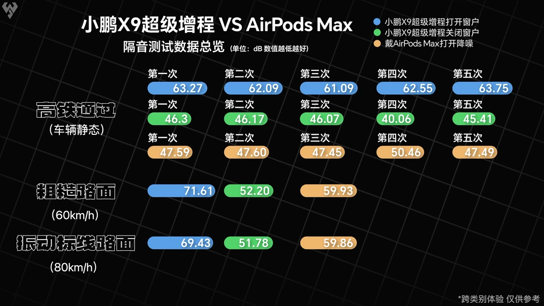 结果让人有点意外——不管是静态高铁、粗糙路面,还是高速上过振动标线,X9 车内的噪音值居然都比戴着 AirPods Max 更低。
