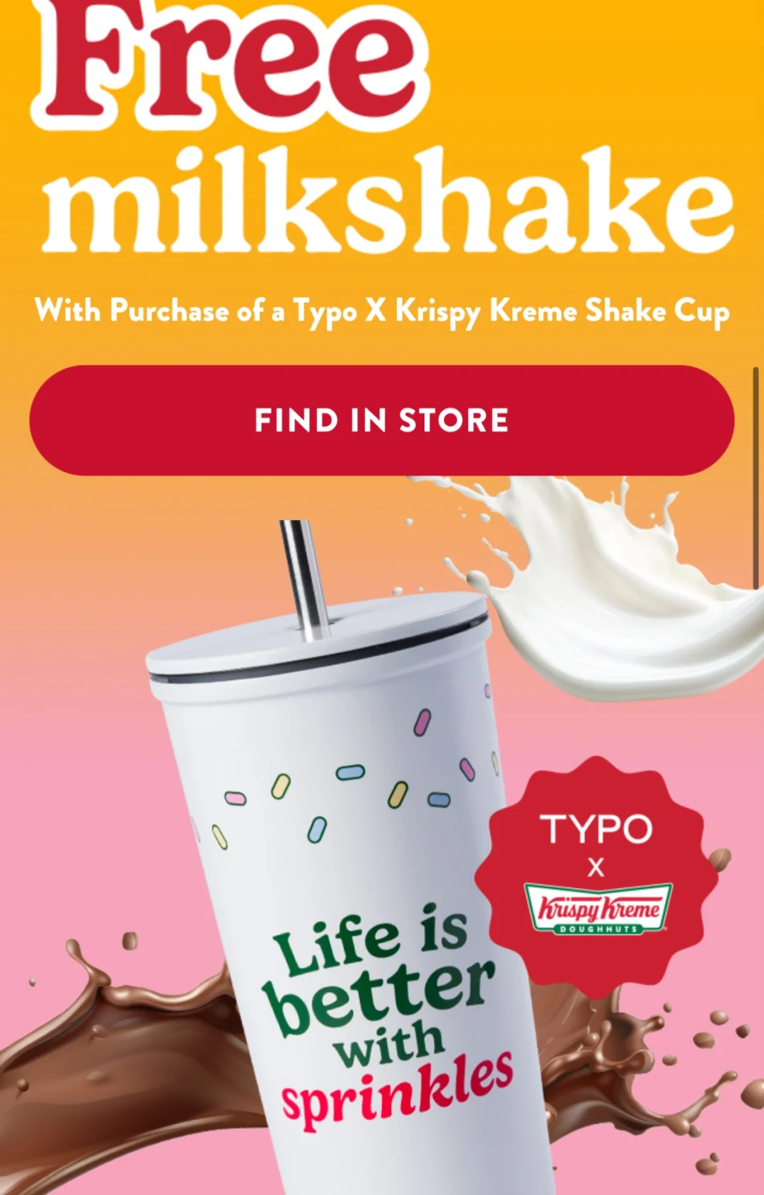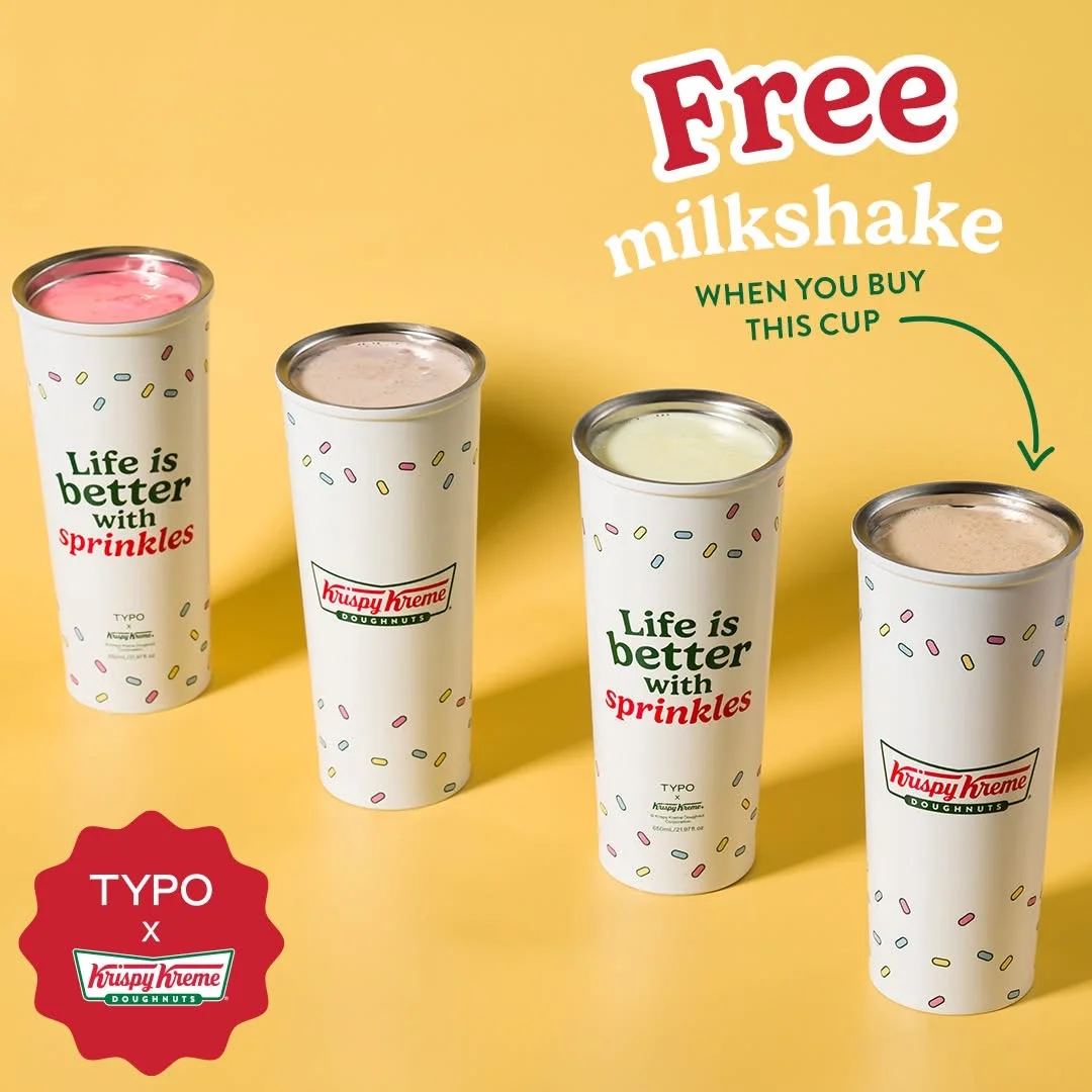 Typo与(Krispy Kreme)联名摇摇杯来啦!!又可以收藏起来啦[哇R][哇R] 每购买一个,就免费赠送一杯大杯奶昔🍩门店发售,库存有限 👀。 售价💰24.90,购买即获赠一杯价值💰9的大杯奶[色色R] [向右R]免费奶昔优惠仅在购买时可兑换一次😉。 关注我,下一篇更精彩