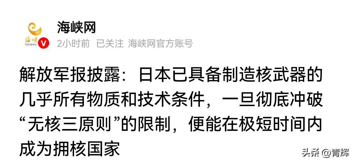 解放军报警告世界:日本已具备制造核武器的几乎所有物质和条件 近期解放军报对外披露了日本核武发展现状,截至2024年底,日本囤积约44.4吨分离钚,足够制造约5500枚核弹头!而且在技术方面,日本已经没有门槛了。只要突破无核三原则,这个国家就可以在极短的时间内拥有核武器。 日本和世界上绝大多数的国家不同,这个民族骨子里充满了疯狂和侵略的基因。如果日本真的拥有核武器的话,那对于整个人类来说将会是一场灾难。解放军媒体在这个时候发布这样的消息,就是在提醒国内外,日本现在正在搞军国主义复辟,如果不再加以控制的话,那么以后日本真有可能直接拿出核武器,到了那个时候,问题会更加的复杂。 同时我们这个时候再次发布这样的声音,应该也预示着接下来我们对于反对日本武装力量外扩反对这个国家再次走向军国主义,会出台更多的更强硬的反制措施与手段! 按理说日本搞核武器的相关技术和物料美国人是非常清楚的,然而在过去这十几年的时间里,这个超级大国对于日本越来越明显的野心一直睁一只眼闭一只眼。因为在美国人看来,如果日本再次成为世界强国的话,只要确保对方在自己的控制范围之内,那么在大国博弈的棋盘上,日本对于美国来说就是极其有利的。