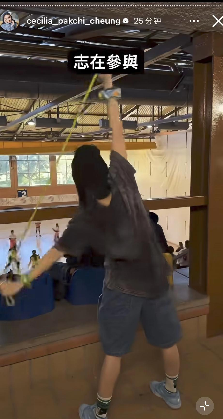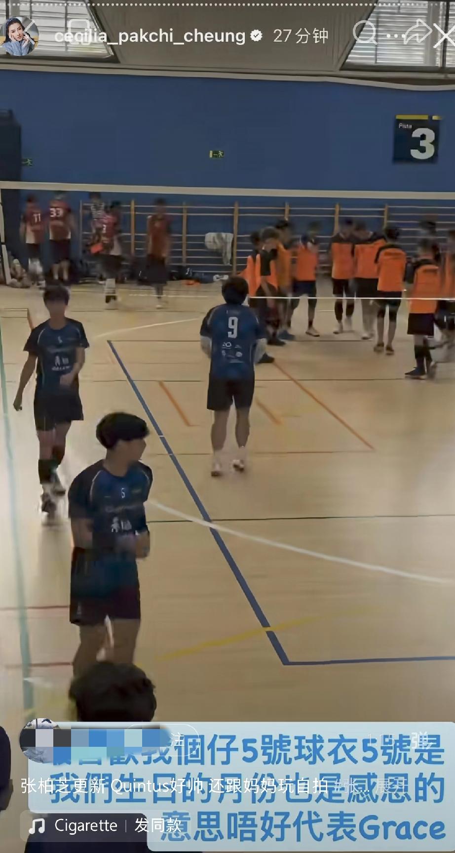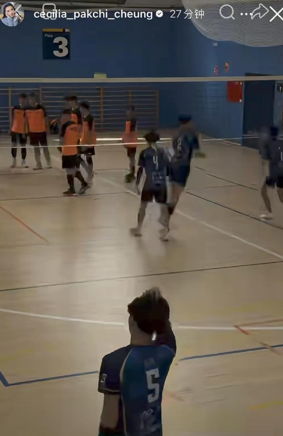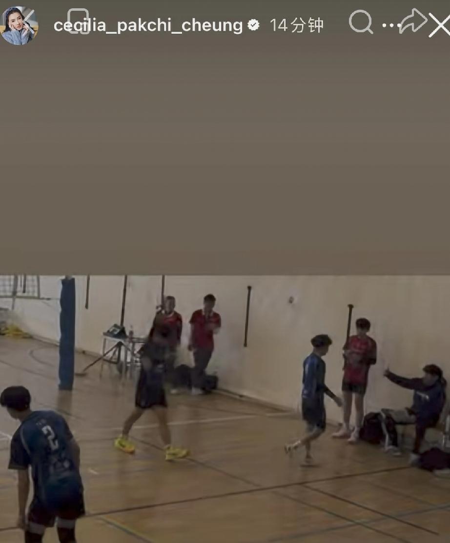 4月1日,张柏芝晒陪二儿子Quintus打排球的视频,Quintus长得好高,16岁像1米75似的好帅气,打排球时跳得也好高,与同学一视同仁没有搞特殊。 张柏芝这几天陪二儿子Quintus去打排球,Quintus在赛场上比赛,张柏芝抽空在台上一边健身一边看他,母爱爆棚。 Quintus个子好高了,有1米75了,估计以后能长个大个子,他留着长头发,和哥哥Lucas发型挺像的,而他体能更好一些,跳得好高,打得也很猛。 Quintus打完球以后还和张柏芝互动,只见Quintus隐约间五官气质与谢霆锋是非常像的,他打排球也是个普通人,没有搞有什么特殊待遇。